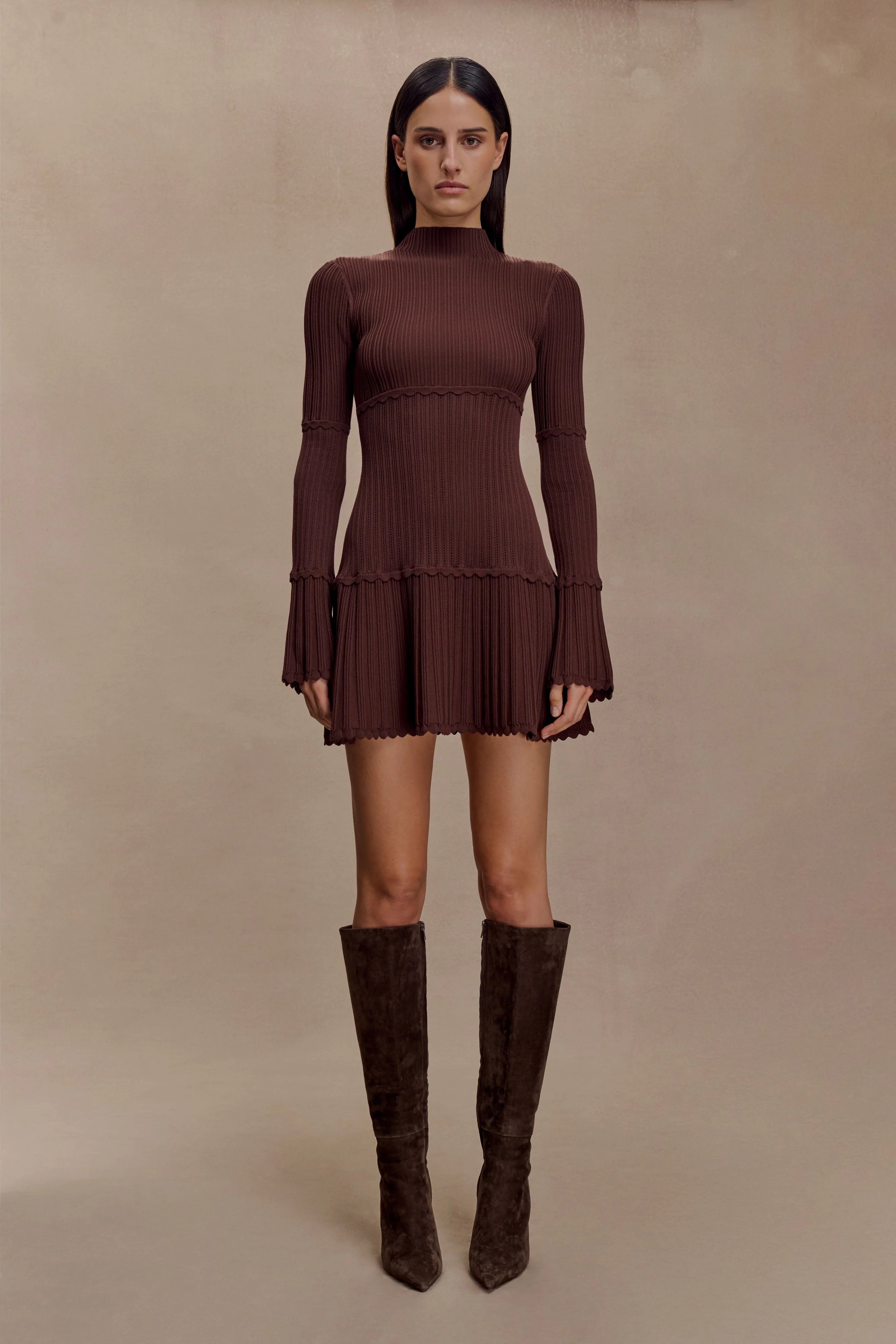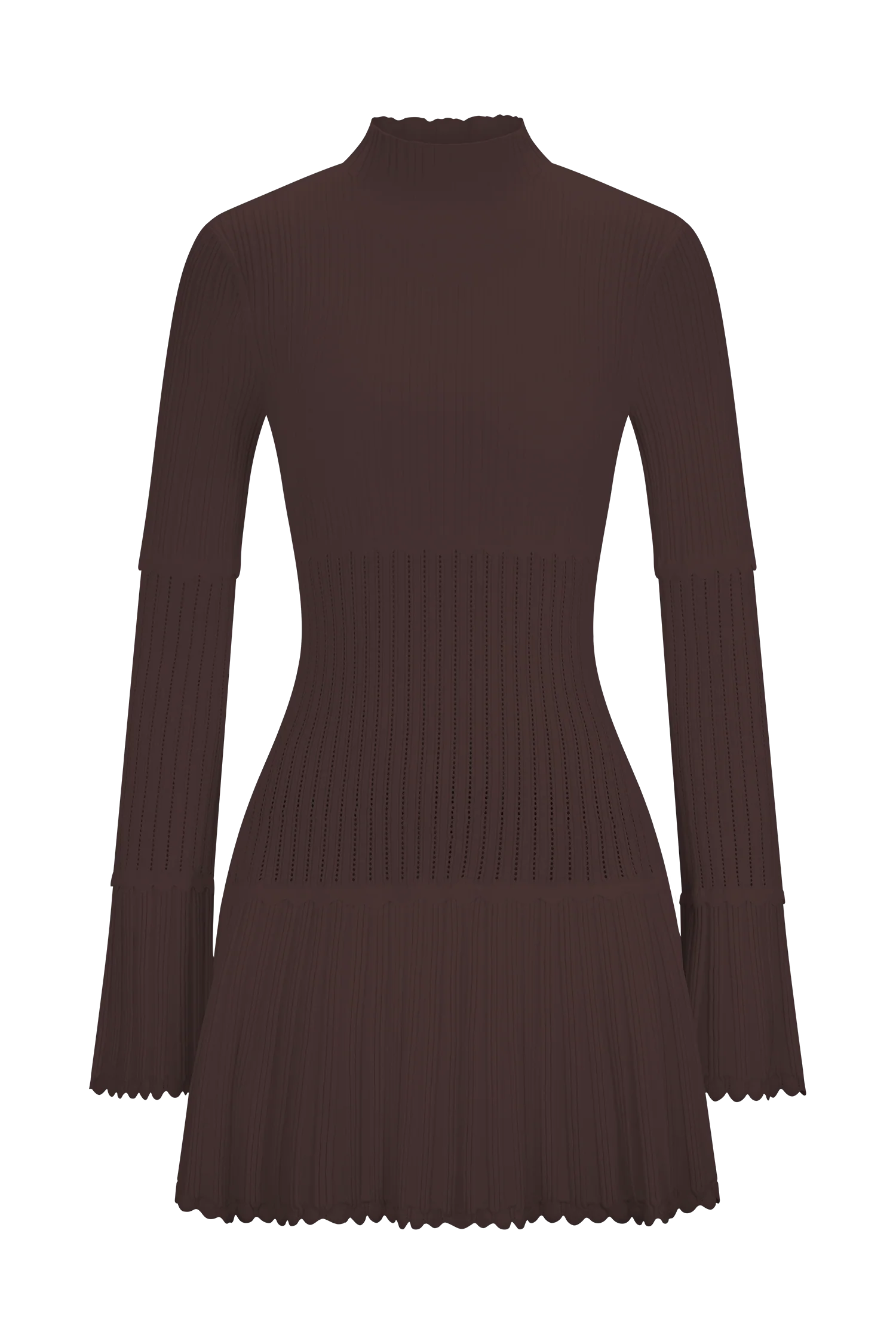 The ADENA Pointelle Knit Mini Dress is a feminine take on everyday knitwear. Crafted from pointelle knit fabrication with subtle scalloped detailing, it features a sleek turtle neckline and long sleeves for a polished finish. The fitted bodice flows into a mini-length A-line hem, balancing structure with movement. Left unlined for a lightweight feel, this dress combines softness with refined detail for effortless wear from day to night.
