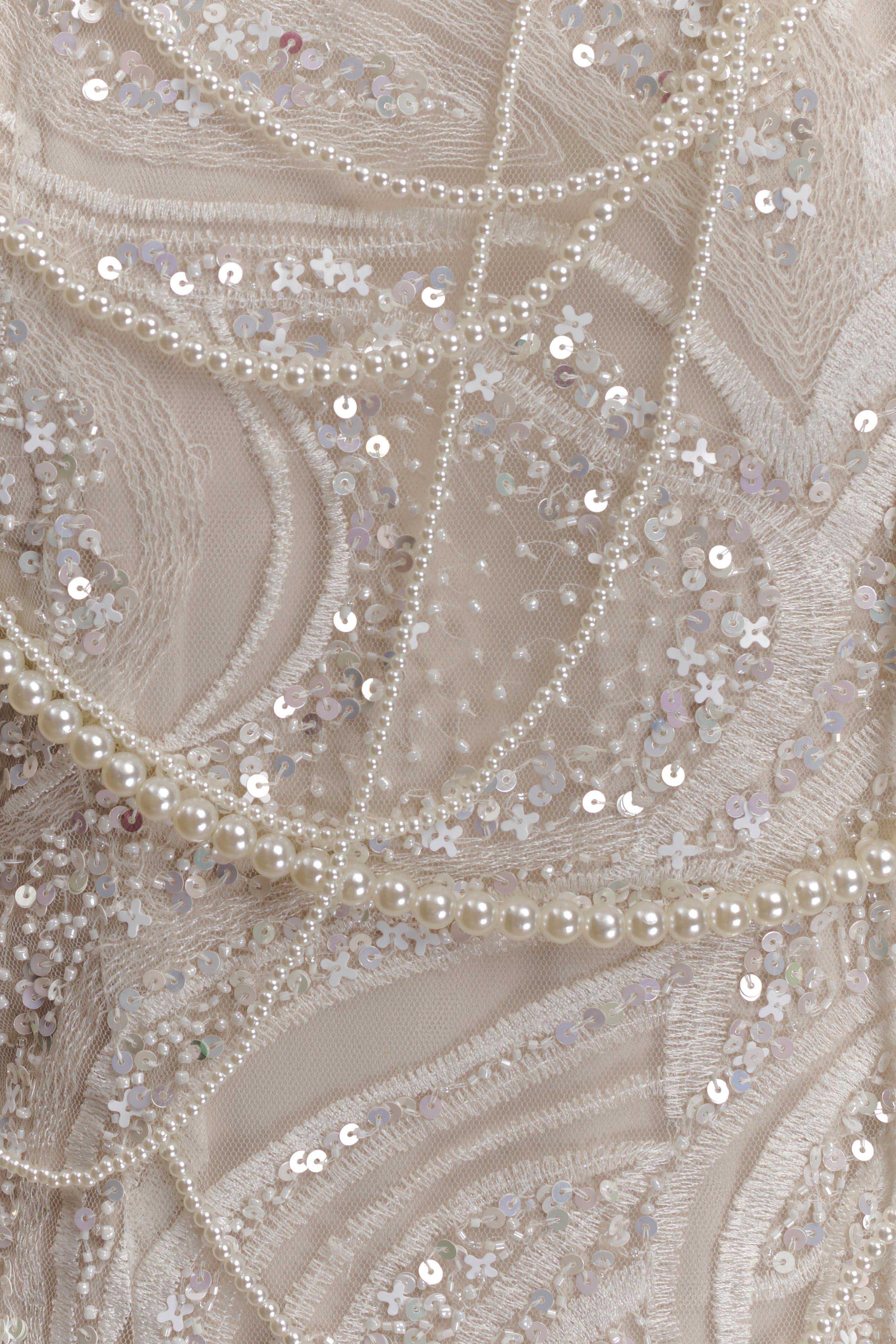 This style is intricately hand-beaded with glass beads, a process that requires up to 200 hours to complete. A dedicated team of 15 work in harmony, with each bead meticulously threaded and sewn by hand, ensuring every detail is flawless.