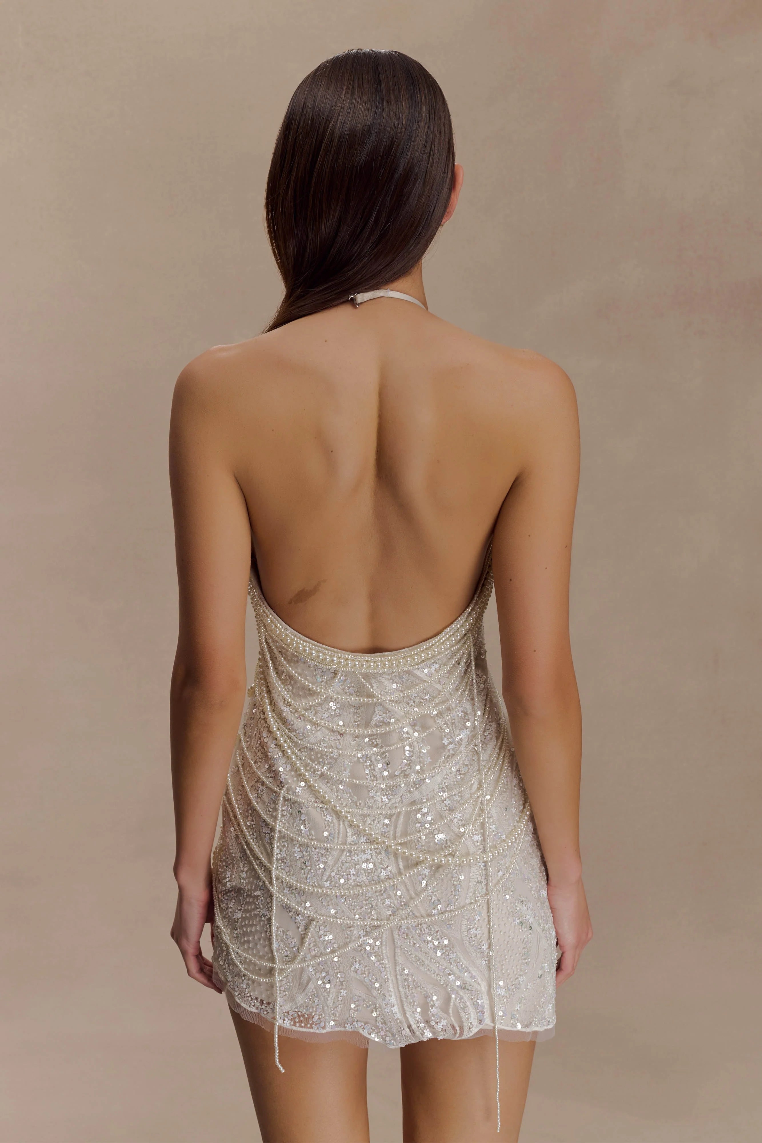 The ADORA Pearl Halter Mini Dress is your invitation to stand out. Designed with a flattering halter neckline and a daring low open back, this mini silhouette draws attention from every angle. Its scalloped, asymmetrical hem adds movement and intrigue, while hand-beaded pearl embellishments shimmer against sequin lace fabrication for a look that’s nothing short of luminous. Fully lined for comfort, this piece is made to dazzle—from candlelit dinners to champagne-soaked celebrations.