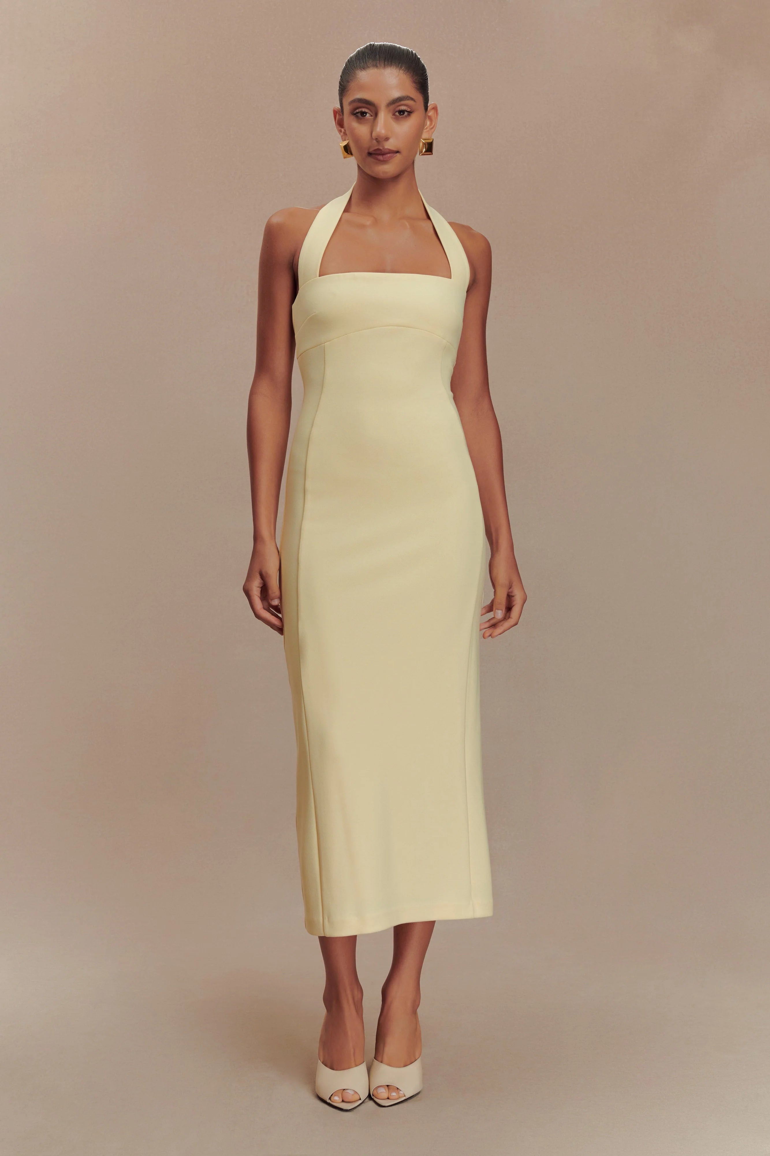 Exuding elegance and sophistication, the AMELITA Suiting Halter Midi Dress is a statement piece that commands attention. Its halter neckline adds a touch of allure, framing the shoulders and highlighting your collarbone, while the underbust panel seam creates a flattering silhouette. Designed with contour panel seams, this dress contours to your body, and the midi length adds a dose of refinement, offering a balance between formal sophistication and modern sensibility. For seamless dressing, the dress features a centre-back invisible zip with a hook and eye closure, ensuring easy on and off. With its timeless design and impeccable craftsmanship, this dress is a symbol of refined charm and impeccable taste, making it a valuable addition to your wardrobe for any formal occasion or cocktail party.