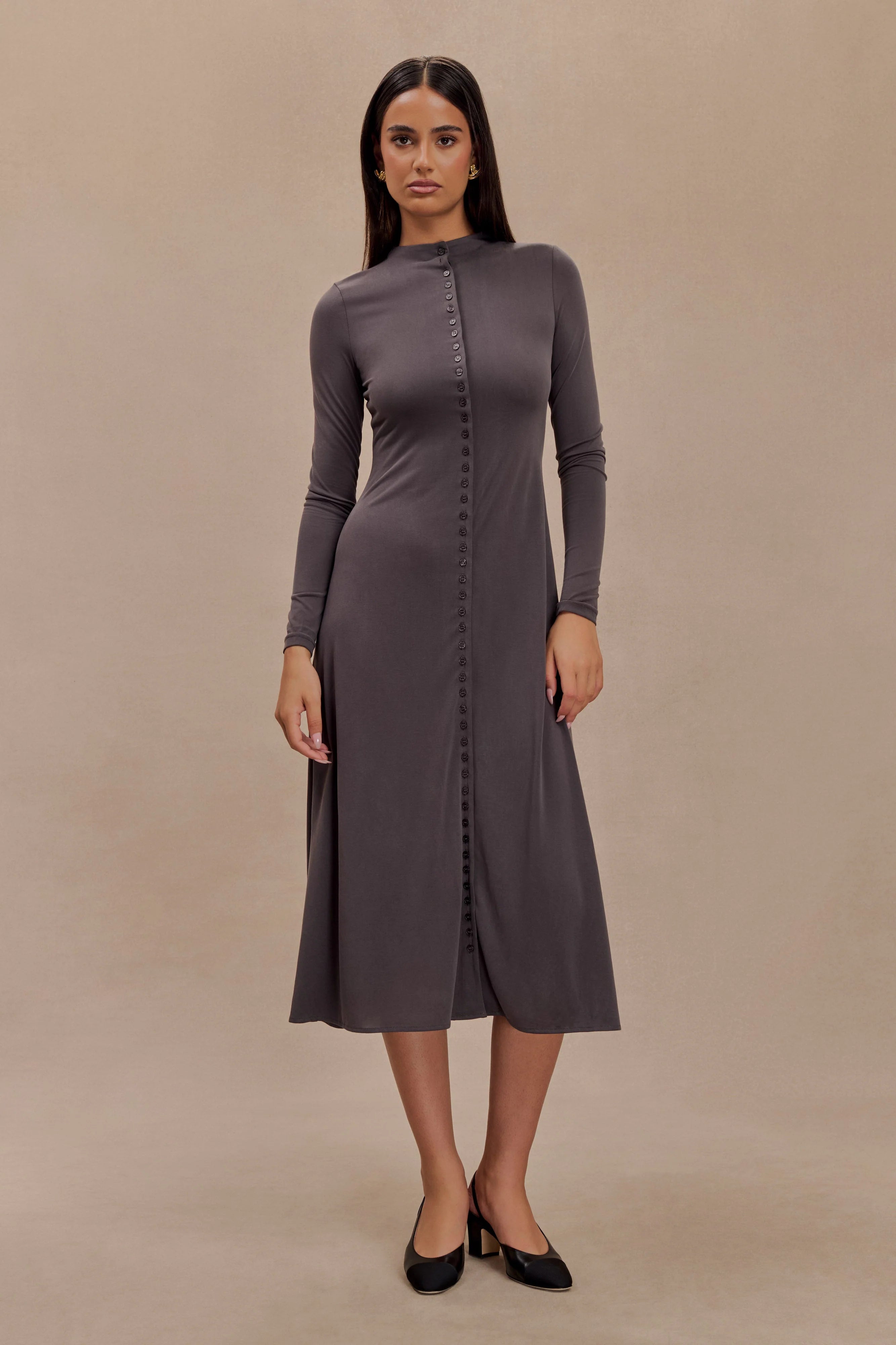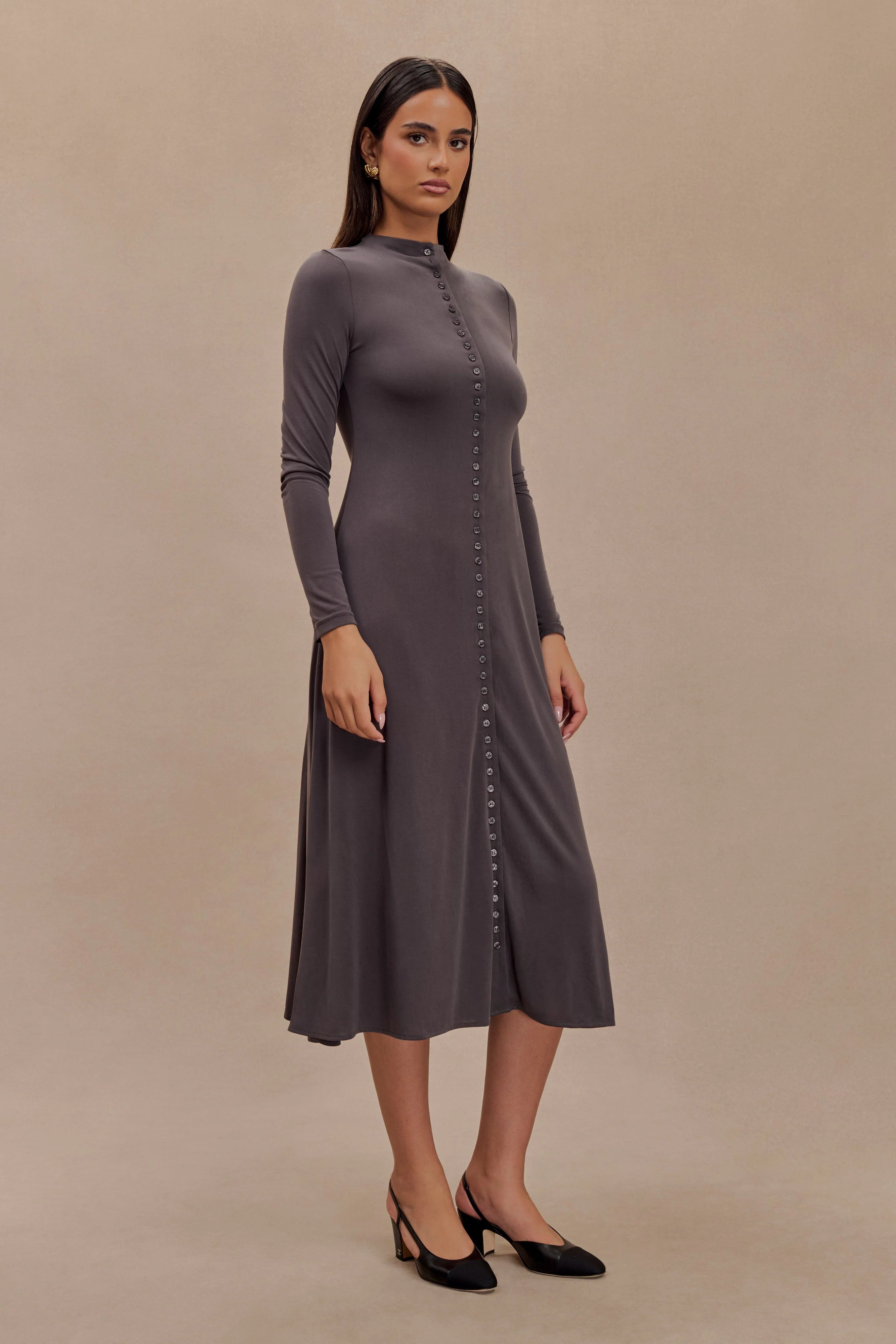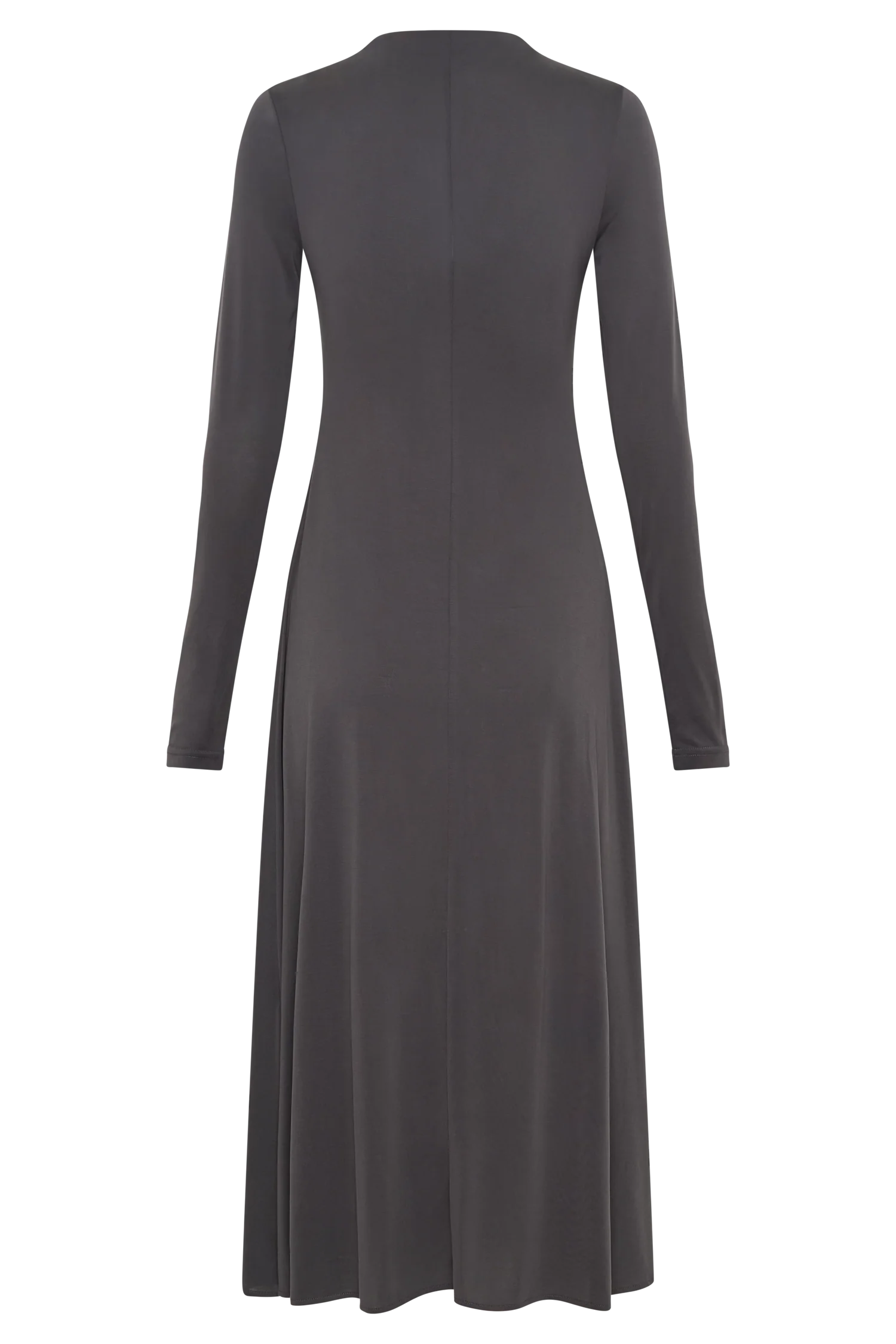 The ANDERS Peached Jersey Midi Dress combines comfort with sophistication. Featuring a grown-on neckline and long sleeves, this dress provides a sleek and fitted silhouette that flatters your figure. The maxi length and flared hem create an elegant flow, while the functional centre front button closure adds a classic touch. Crafted from soft peached jersey, this dress offers a cozy yet refined look, perfect for both casual and semi-formal occasions.