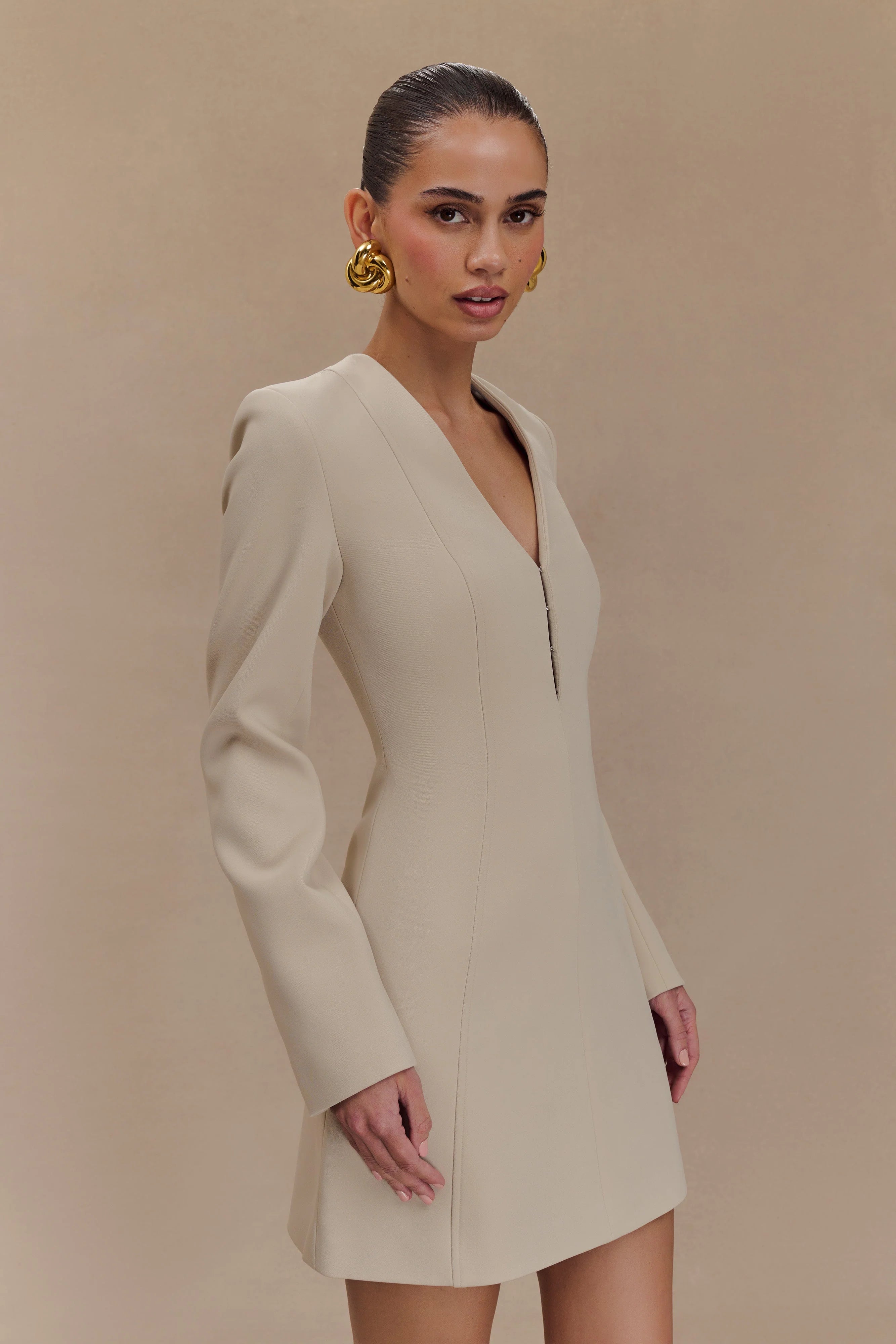 The ARORA Suiting Blazer Dress with Pleating effortlessly blends sophistication and modern style. Its flattering V neckline, complemented by a chic hook & eye neck detail, creates an elegant look that’s perfect for any occasion. Structured shoulders enhance the tailored silhouette, while the mini length adds a playful edge. The centre back zip ensures a sleek fit, and the fully lined interior provides comfort and quality. Whether dressed up or down, this dress is a versatile statement piece that captures power and femininity in one stunning design.