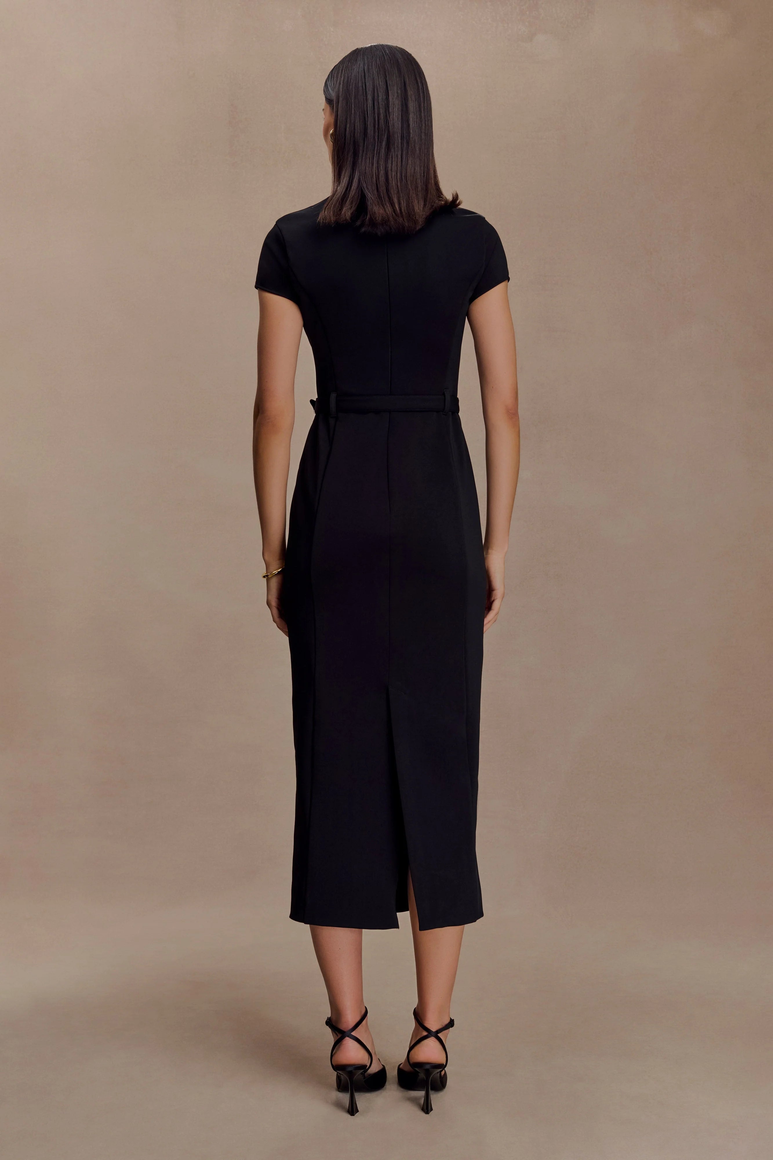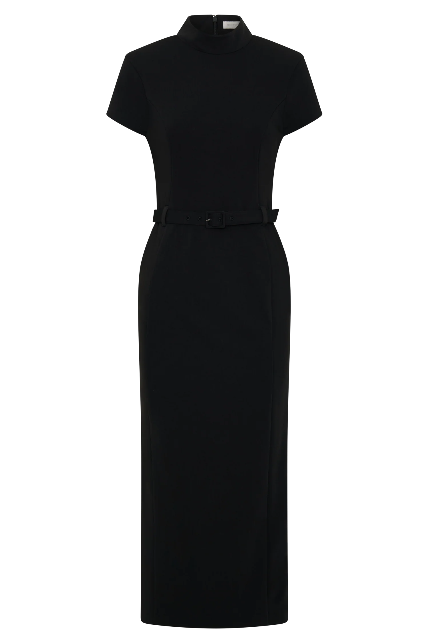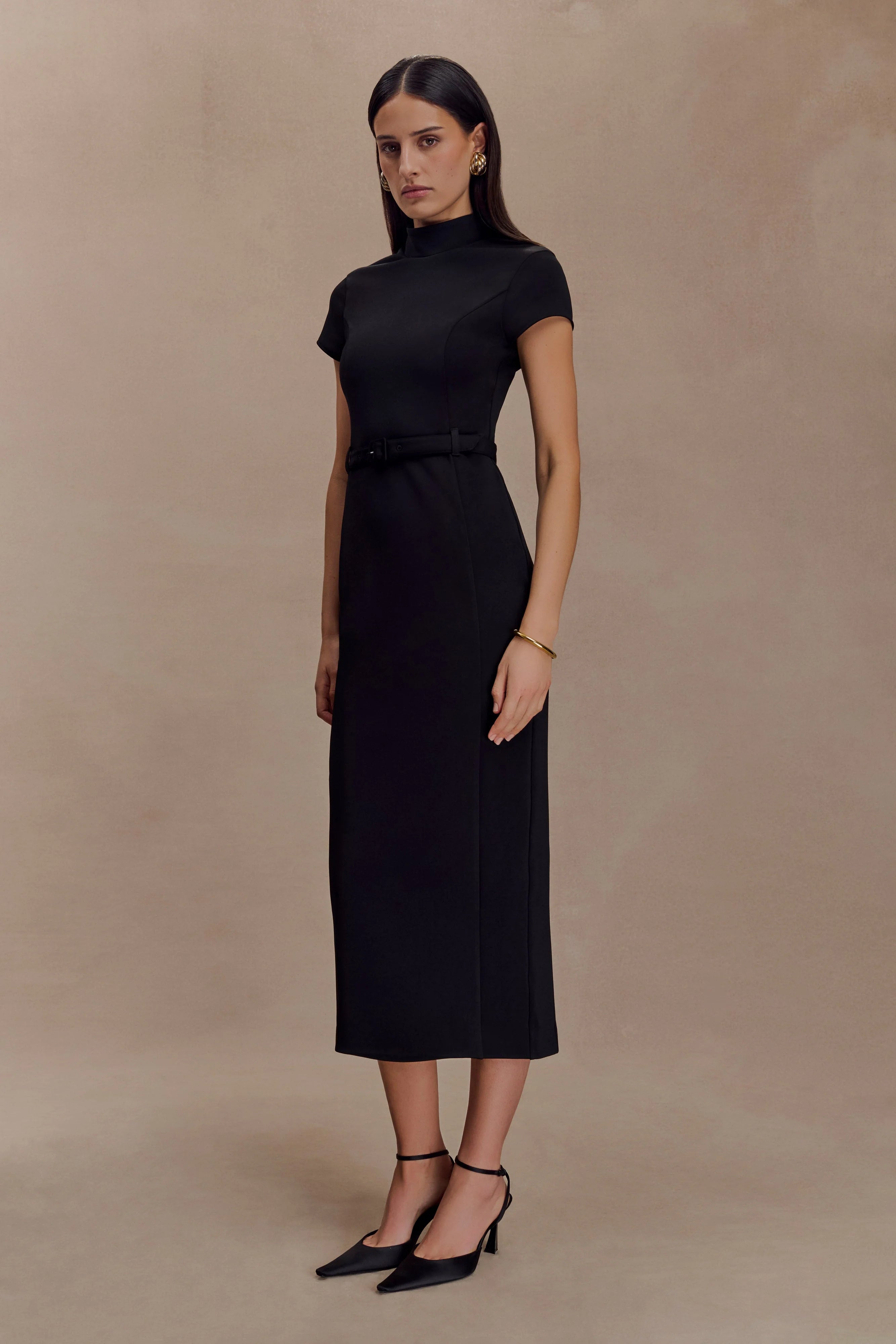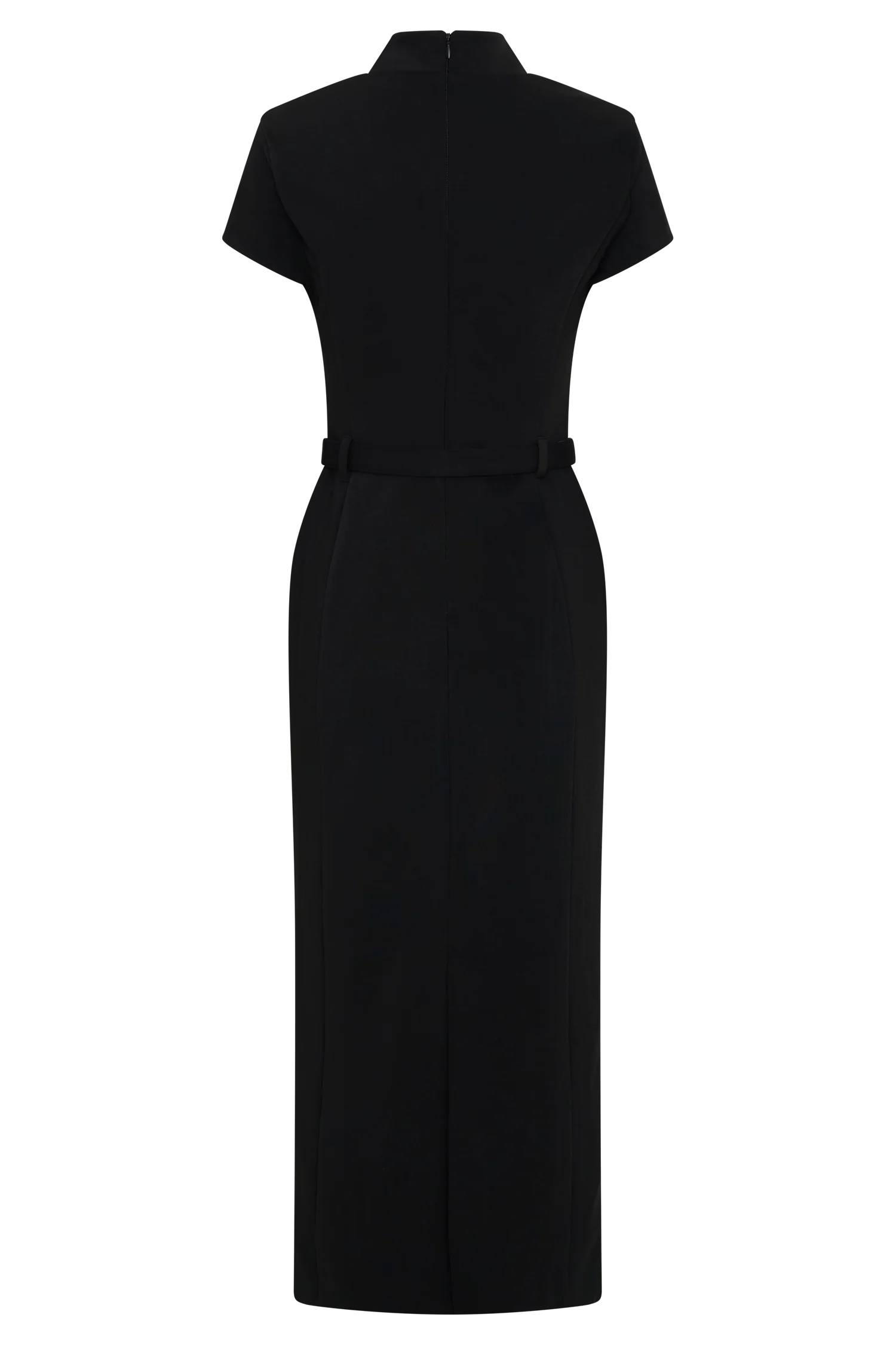 The ARWYN Short Sleeve Crepe Midi Dress blends classic tailoring with a modern silhouette. Featuring a high neckline, short sleeves, and princess seamlines, it sculpts the figure while offering refined coverage. A fitted bodice and waist belt detail accentuate the shape, while the midi-length skirt elongates the frame for a sleek finish. Fully lined and completed with an invisible back zip, this dress is a sophisticated choice for occasions that call for understated confidence.