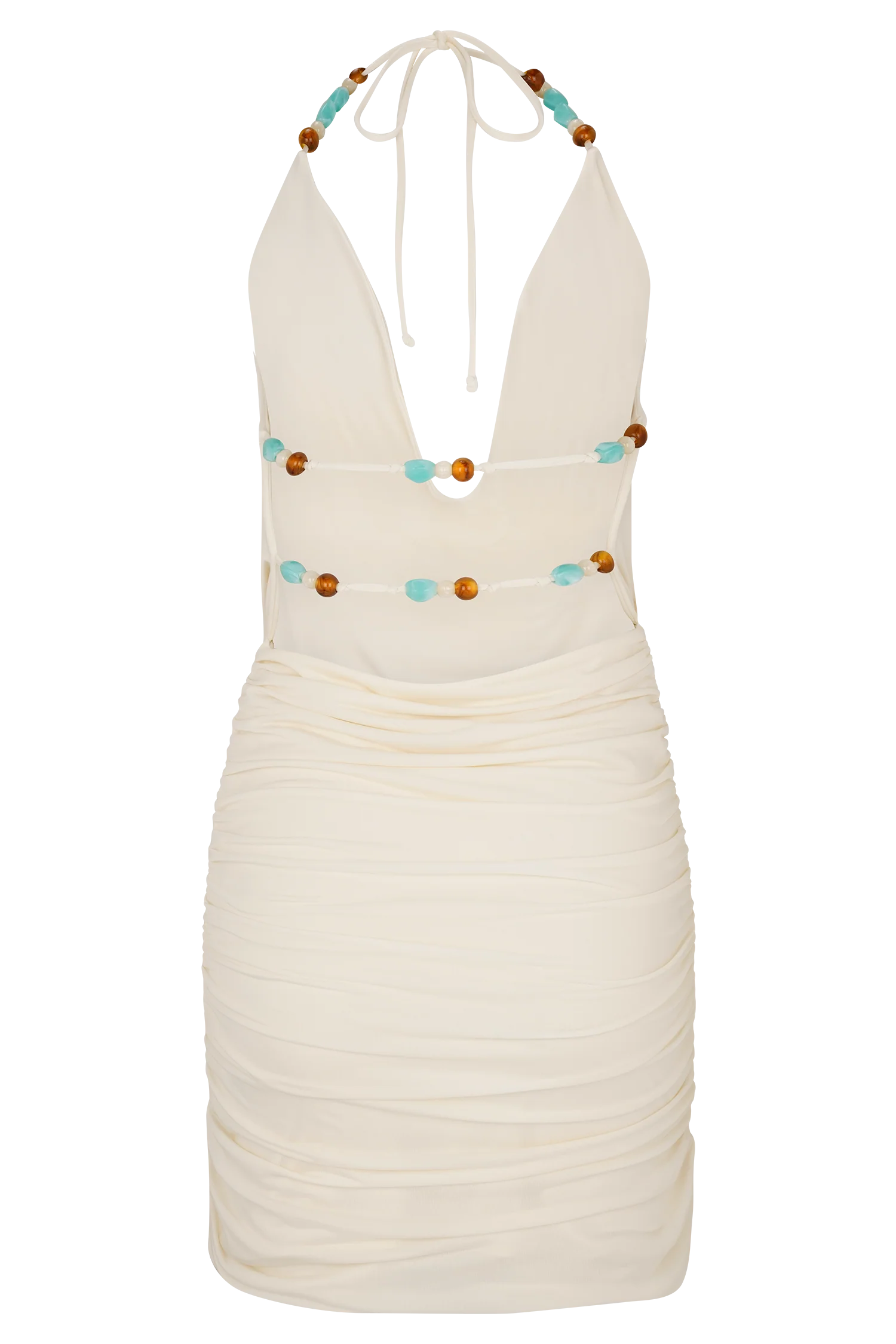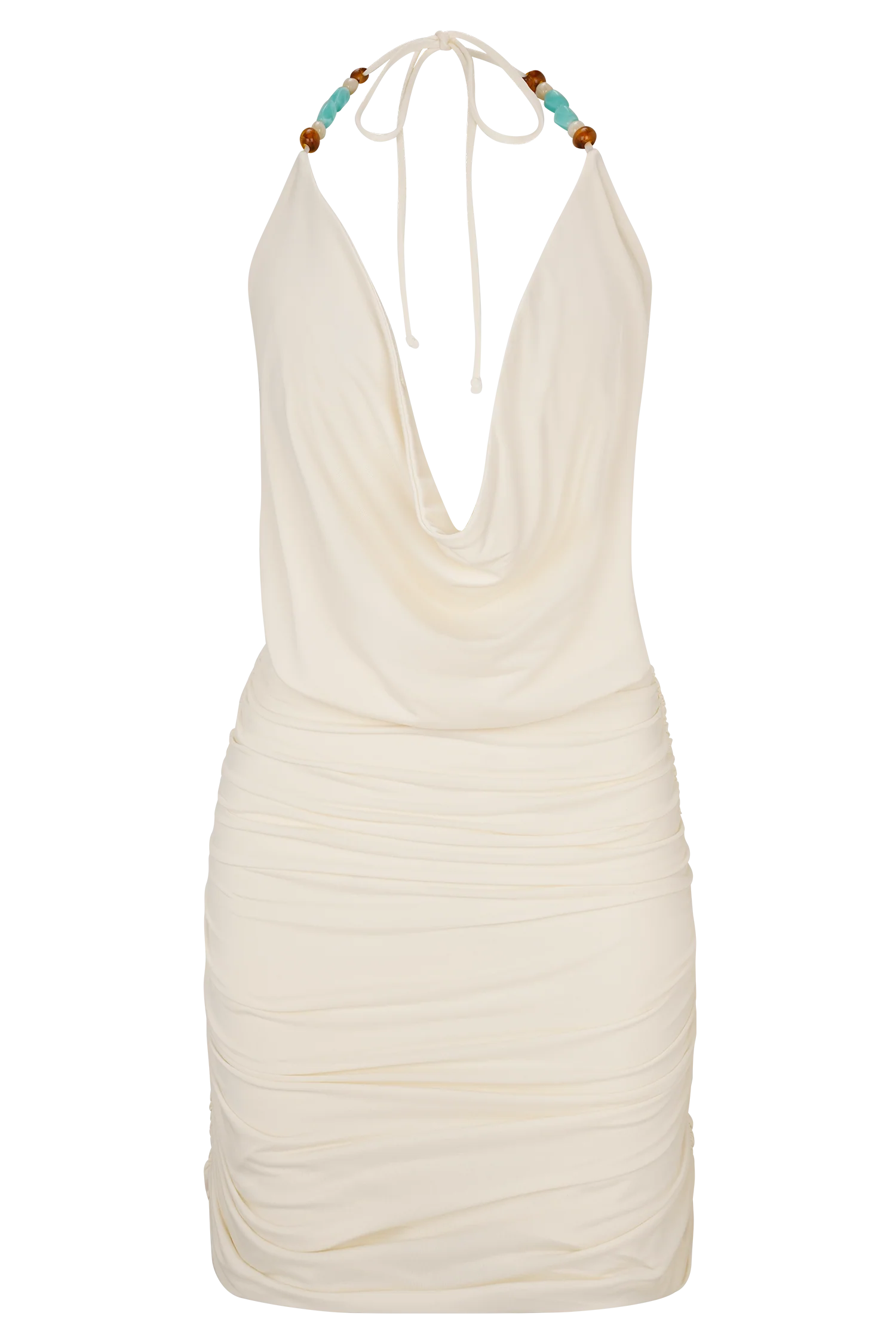 The ASTRAEUS Beaded Cowl Mini Dress is designed for moonlit moments and unforgettable entrances. Featuring a fluid draped cowl neckline and halter neck tie adorned with delicate beading, this fully lined mini silhouette offers a soft bloused bodice that contrasts with a bodycon ruched skirt for a sculpted finish. Beaded detailing at the neck and back adds a touch of shimmer, making this dress the perfect pick for evening events, cocktail hours, or seaside celebrations.