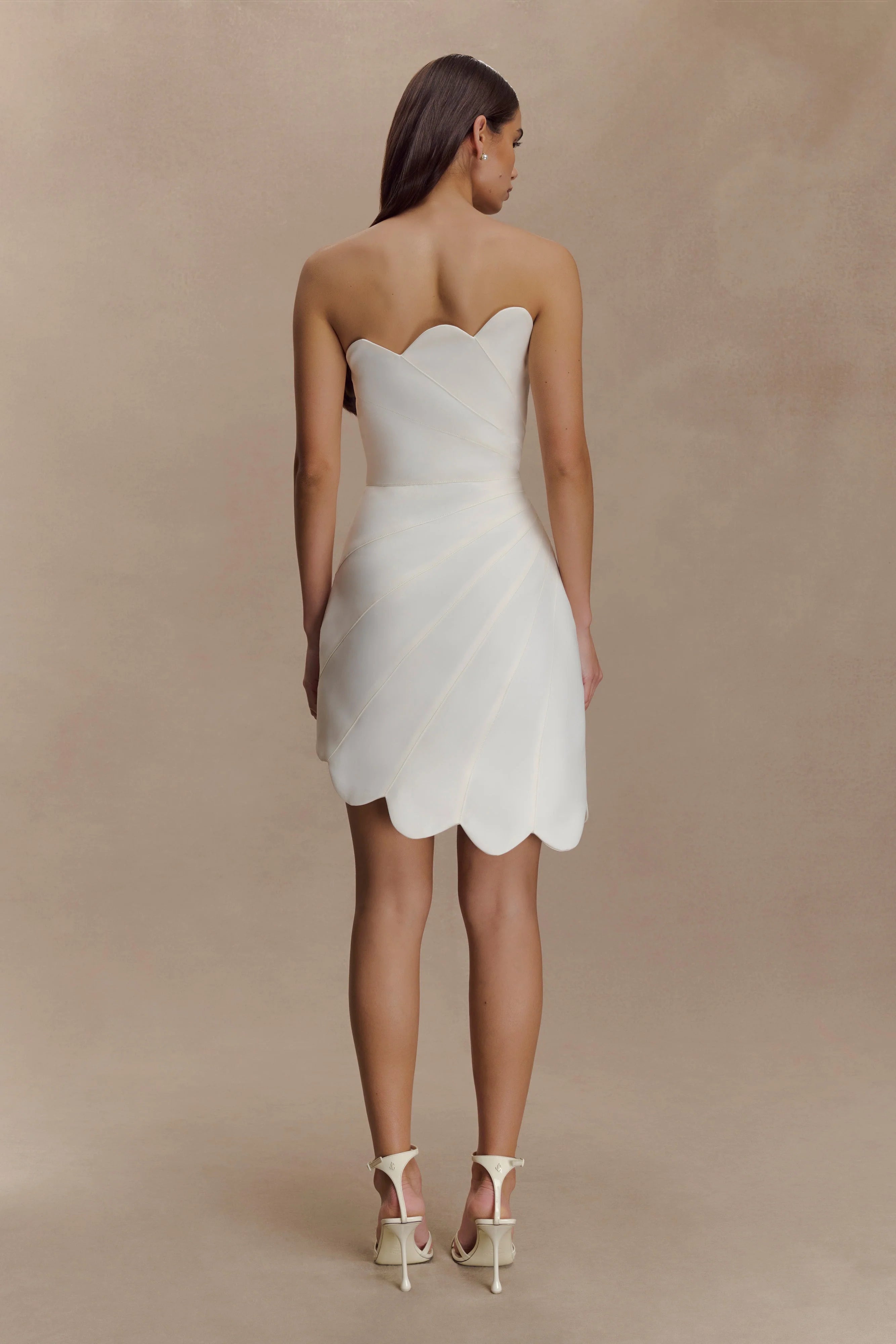 The ATENEA Satin Mini Dress is a study in form and finesse. With a strapless, scalloped neckline and asymmetrical hemline, this mini silhouette creates visual intrigue from every angle. Front and back panel detailing sculpt the body, while a hidden side zip and internal waist stay ensure a secure, flattering fit. Cut from a structured satin fabrication and fully lined, this dress is bold yet refined—designed to command attention with confidence and grace.