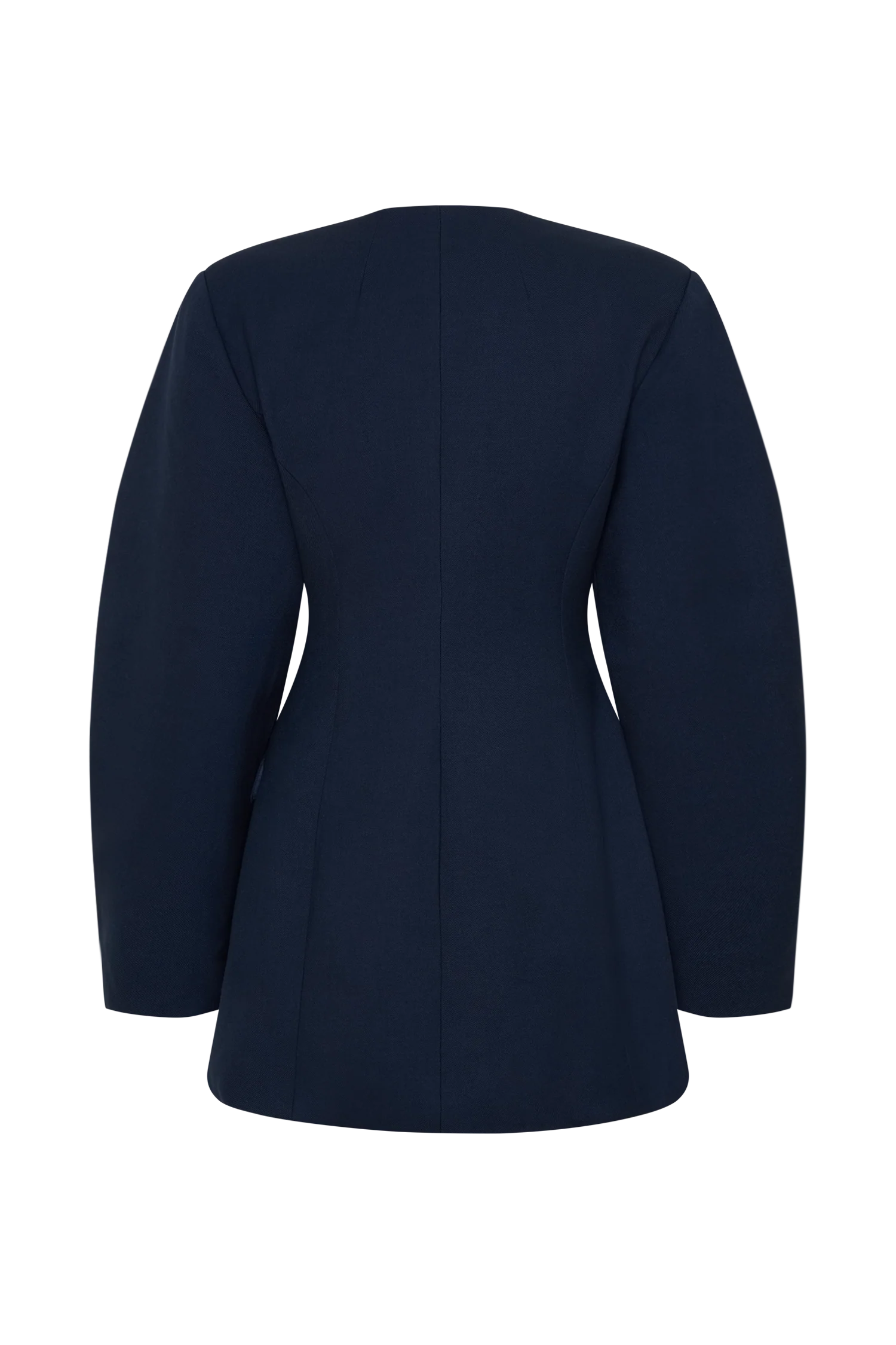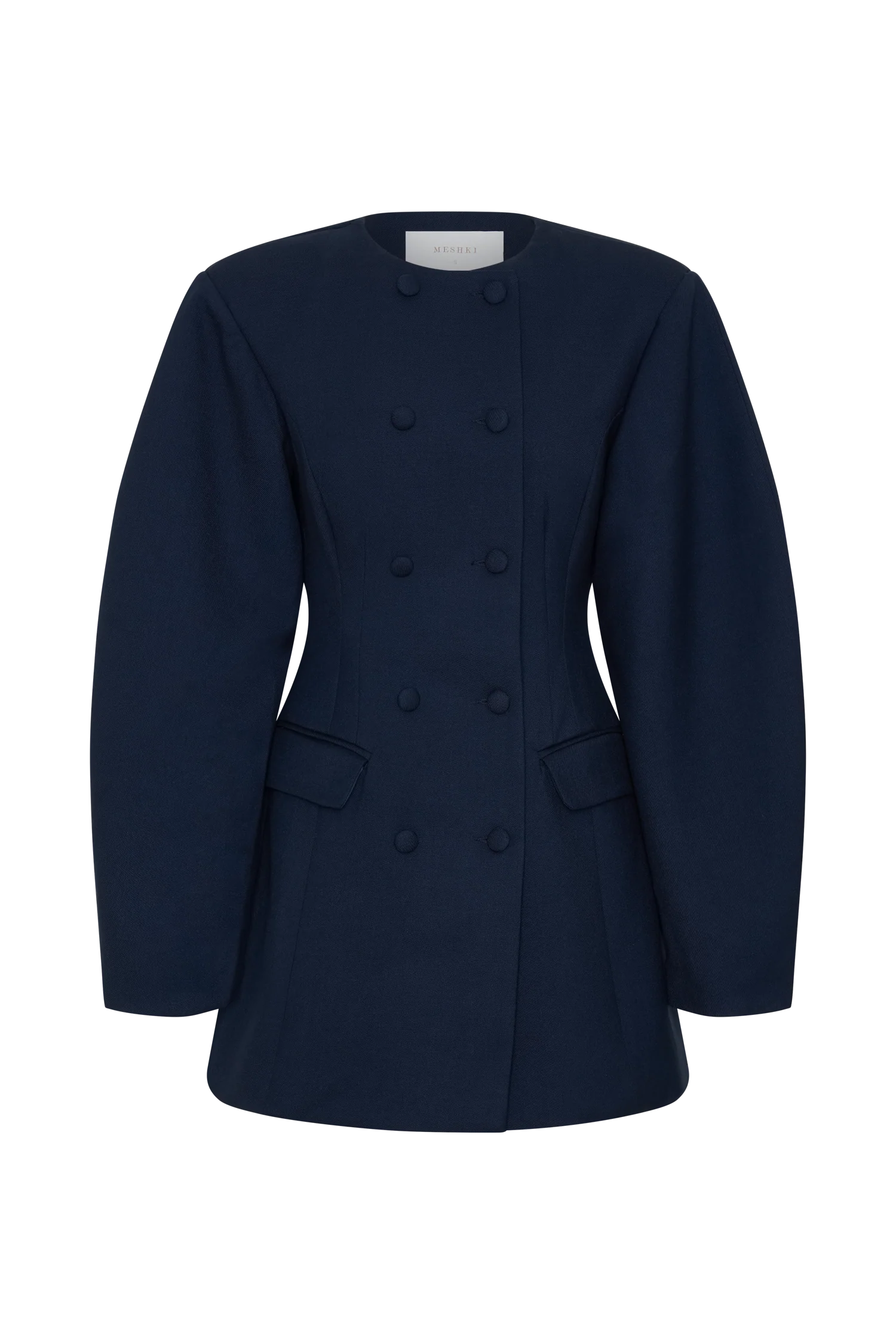The BEATRICE Blazer Mini Dress is a statement silhouette with refined details. Designed with long balloon sleeves and a high neckline, it balances sharp tailoring with soft volume. Non-functional pocket flaps add structure, while the back belt with a custom buckle cinches the waist for a flattering fit. Shoulder pads enhance the tailored shape, and a double button front closure finishes the look. Fully lined and cut to a mini length, this dress is designed for modern sophistication with a bold edge.