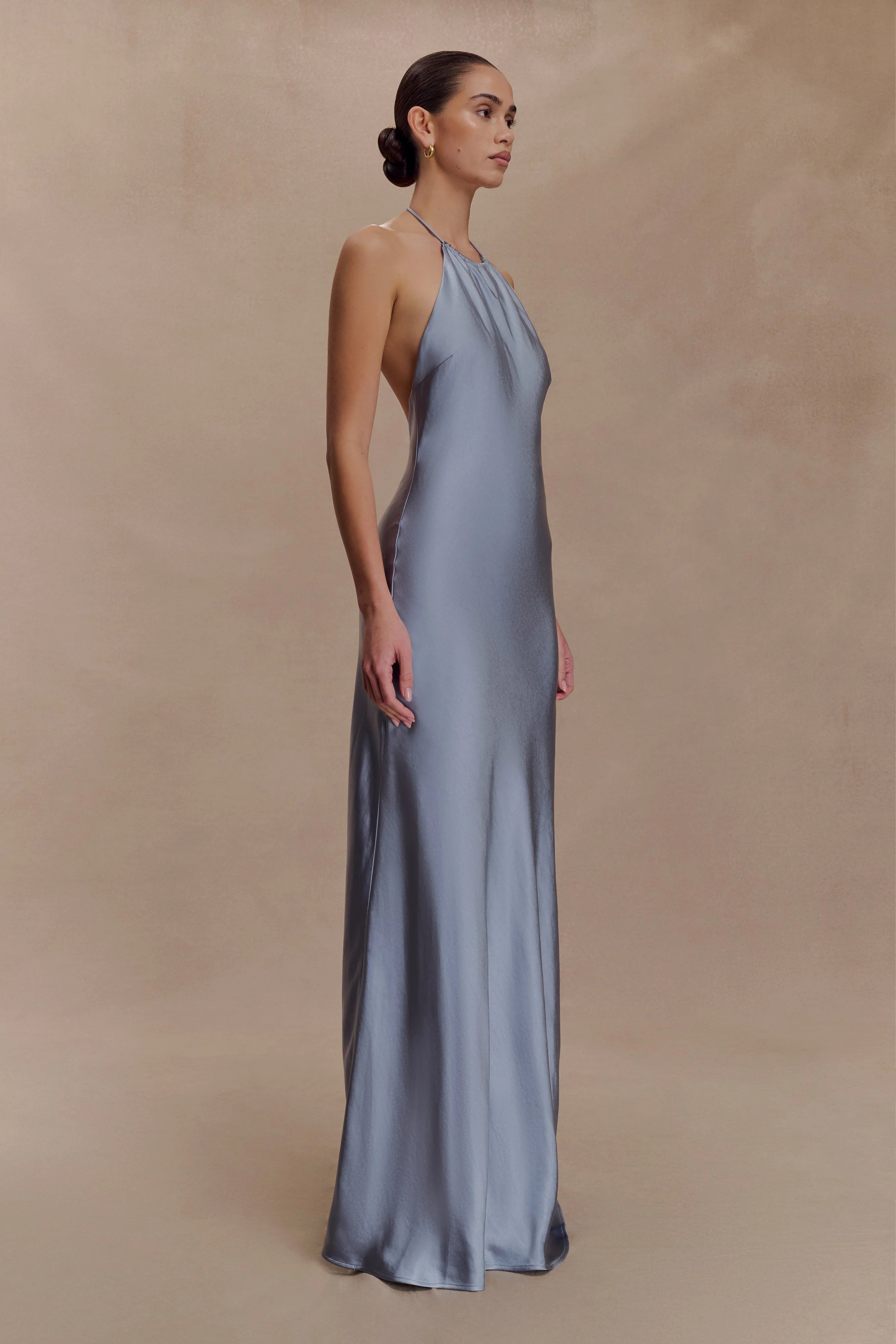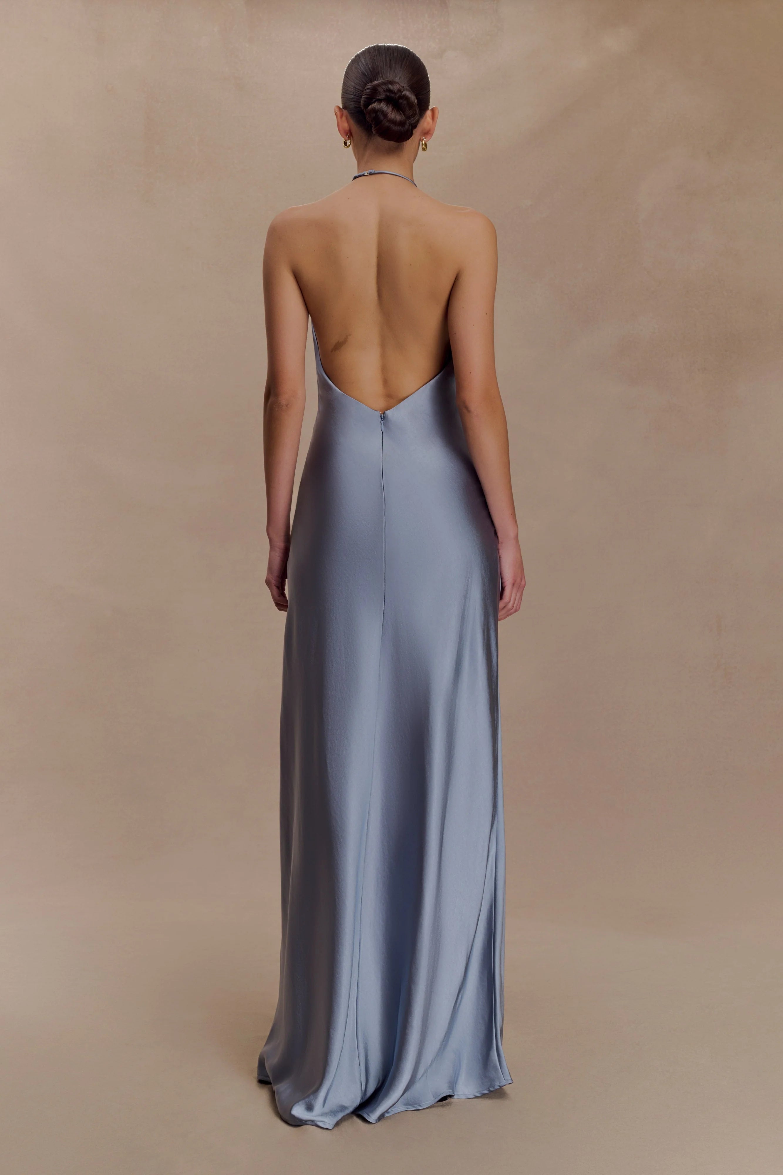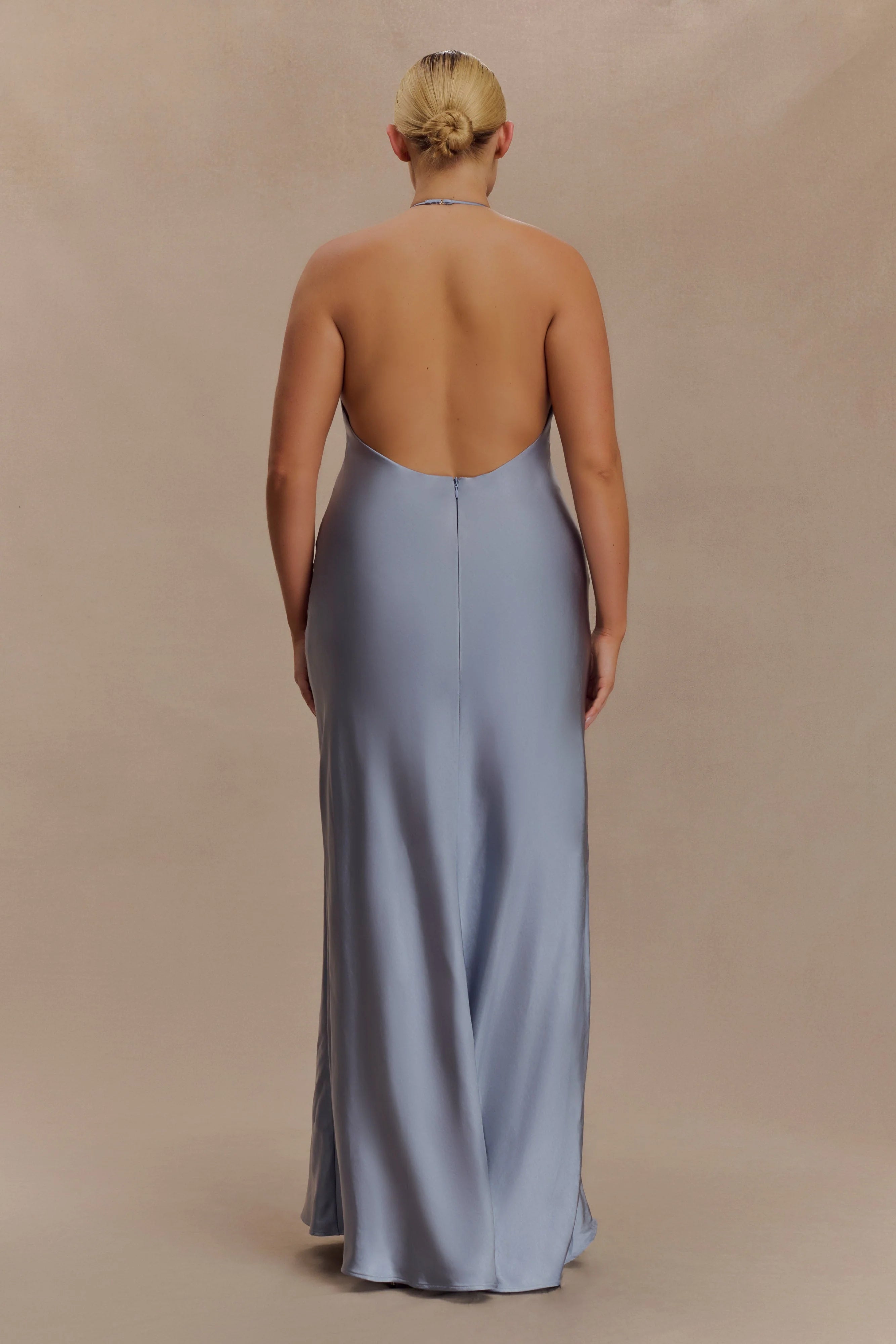 The BELLA Satin Halter Maxi Dress is designed for fluid movement and feminine ease. Featuring an adjustable halter neckline with soft gathers at the front, it flows into a relaxed silhouette that flatters without constraint. The open back adds a touch of sensuality, balanced by a straight skirt that skims the frame to a floor-grazing finish. Crafted in a lustrous satin fabrication and finished with an invisible back zip, this dress is your go-to for sunset soirées, destination weddings, and everything in between.
