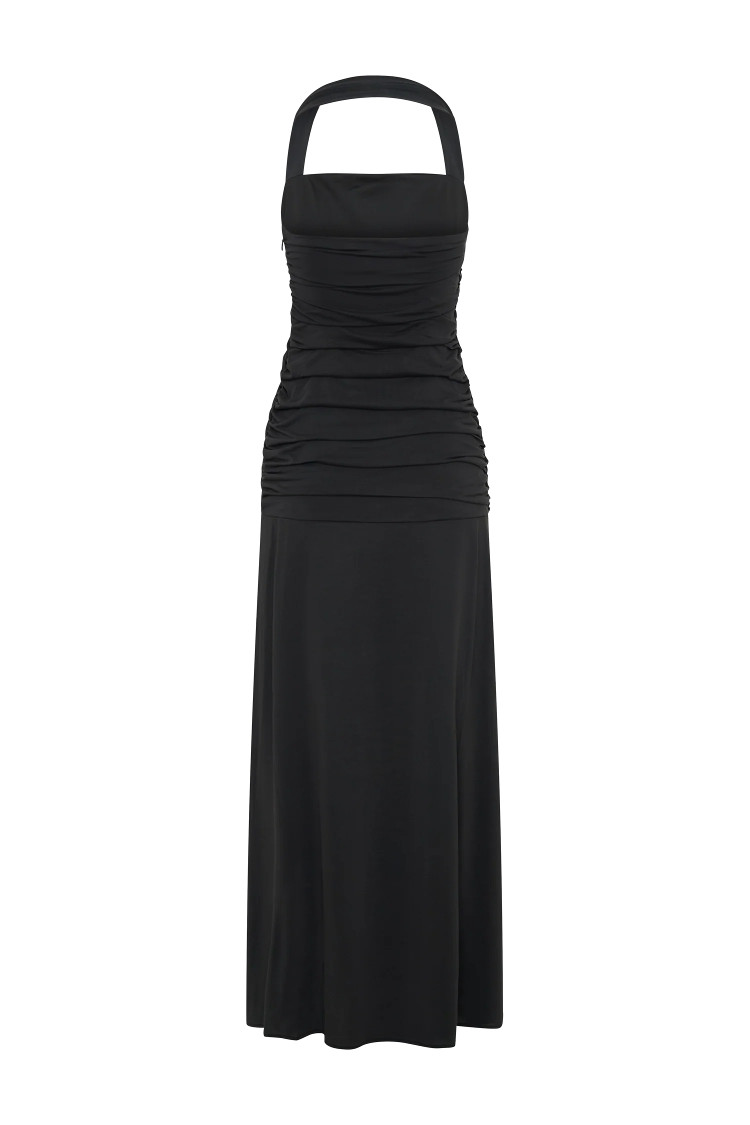 The BENTLEY Peached Jersey Halter Maxi Dress combines modern elegance with a flattering silhouette. Featuring a halter neckline and a ruched bodice that extends to the lower hip, this dress accentuates your figure while providing a comfortable fit. The flared lower skirt adds graceful movement, and the leg split enhances the dress's dramatic effect. Lined for a smooth finish, this dress reaches a maxi length, making it a perfect choice for formal events or elegant evening outings.