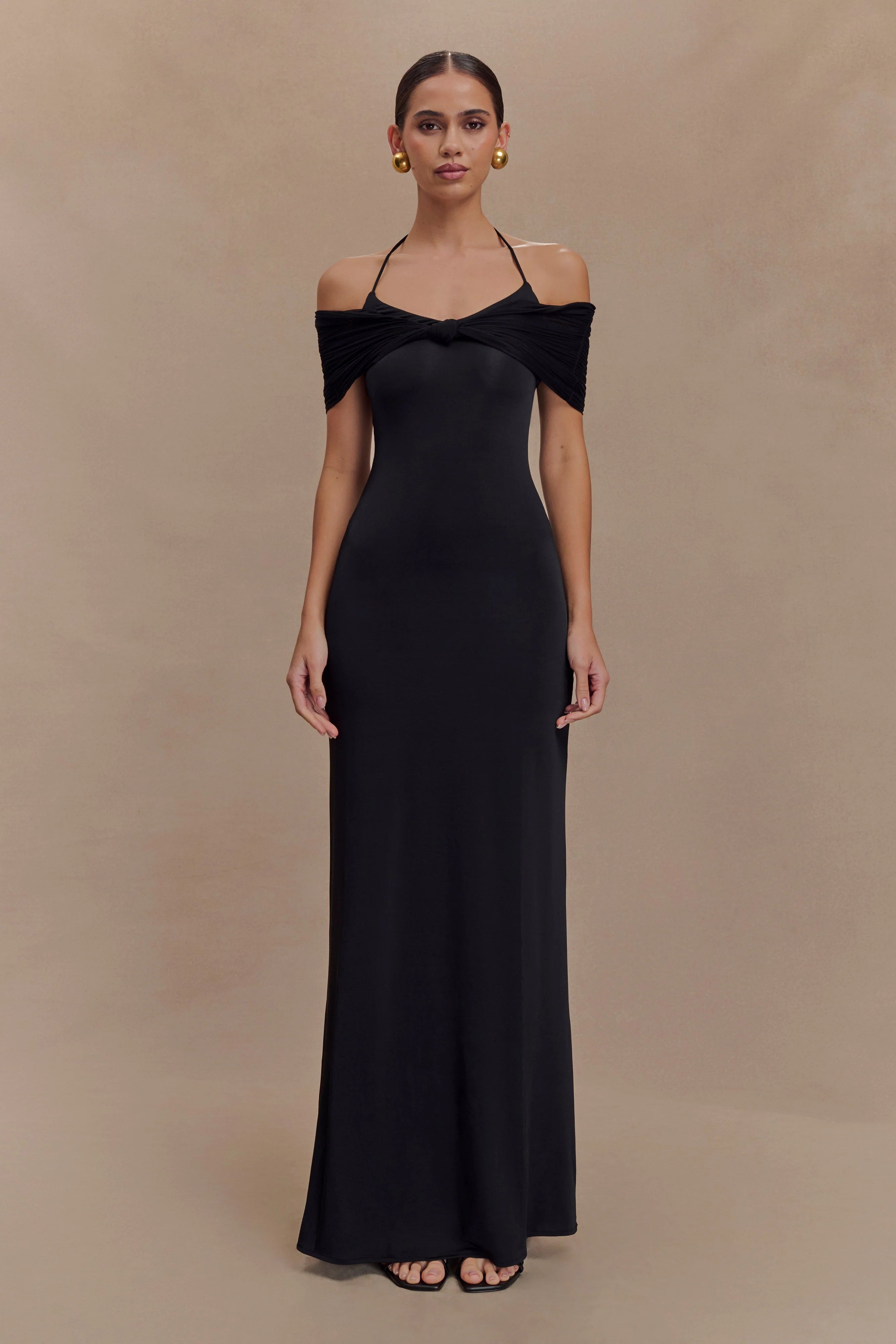 The BERNADINA Mesh And Slinky Halter Maxi Dress is your go-to statement piece for sun-drenched escapes and golden hour glamour. Designed with an adjustable halter neck and a fluid off-shoulder mesh overlay, this maxi silhouette flatters with a straight fit and a centre front knot that softly gathers at the waist. Lightweight and effortlessly elegant, this dress moves with the breeze—making it perfect for poolside cocktails, seaside dinners, and everything in between.
