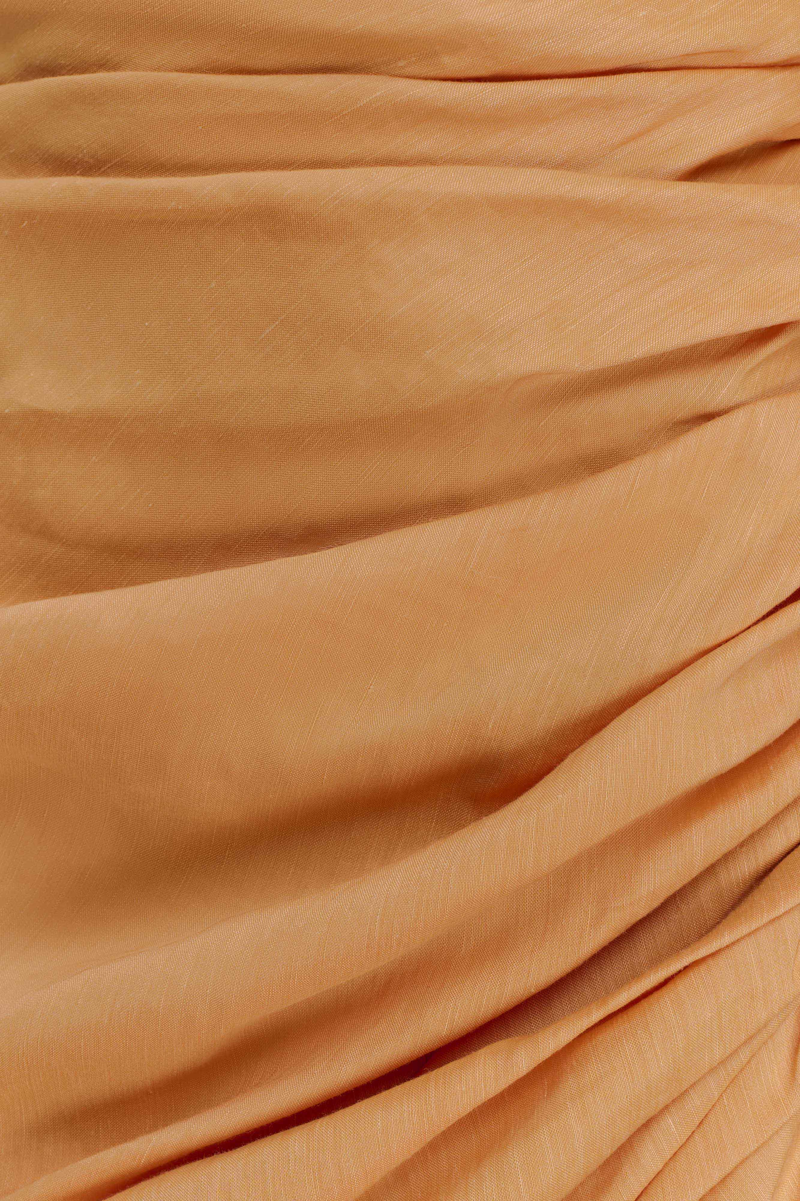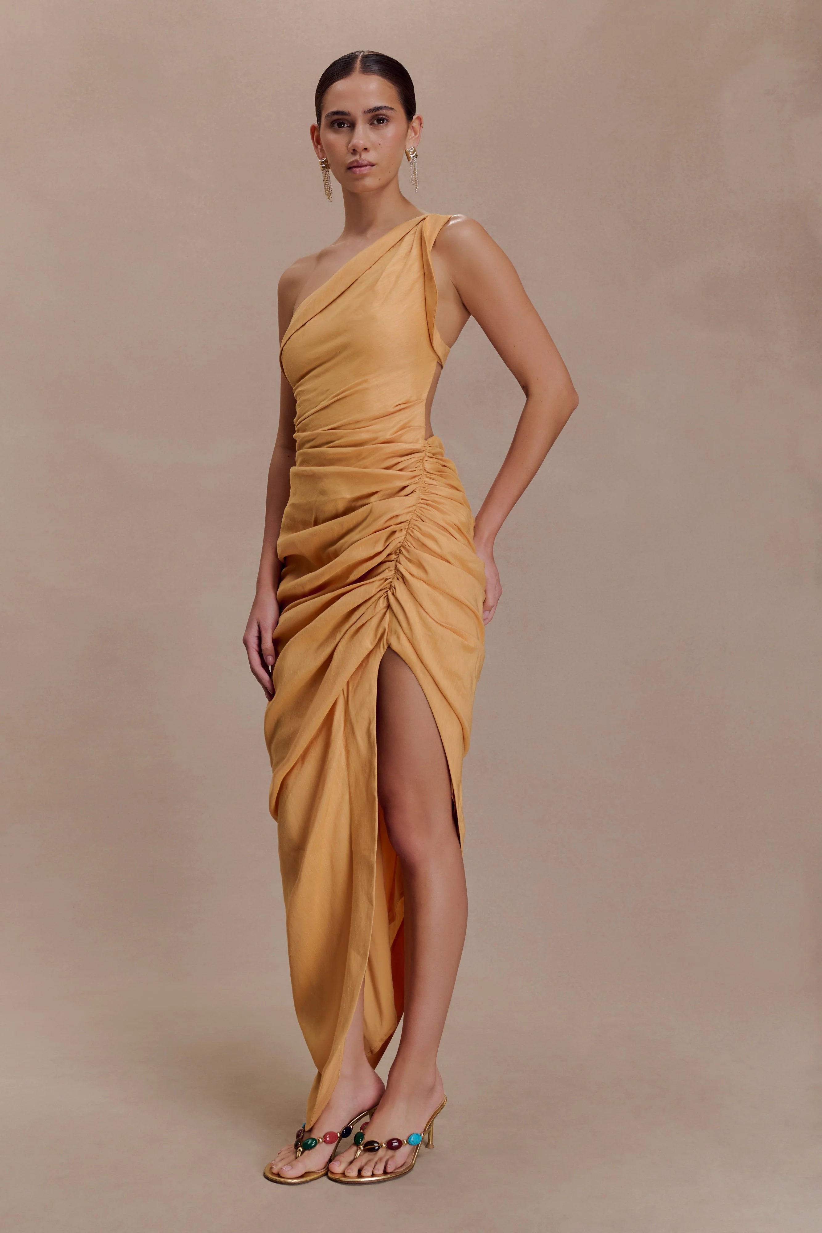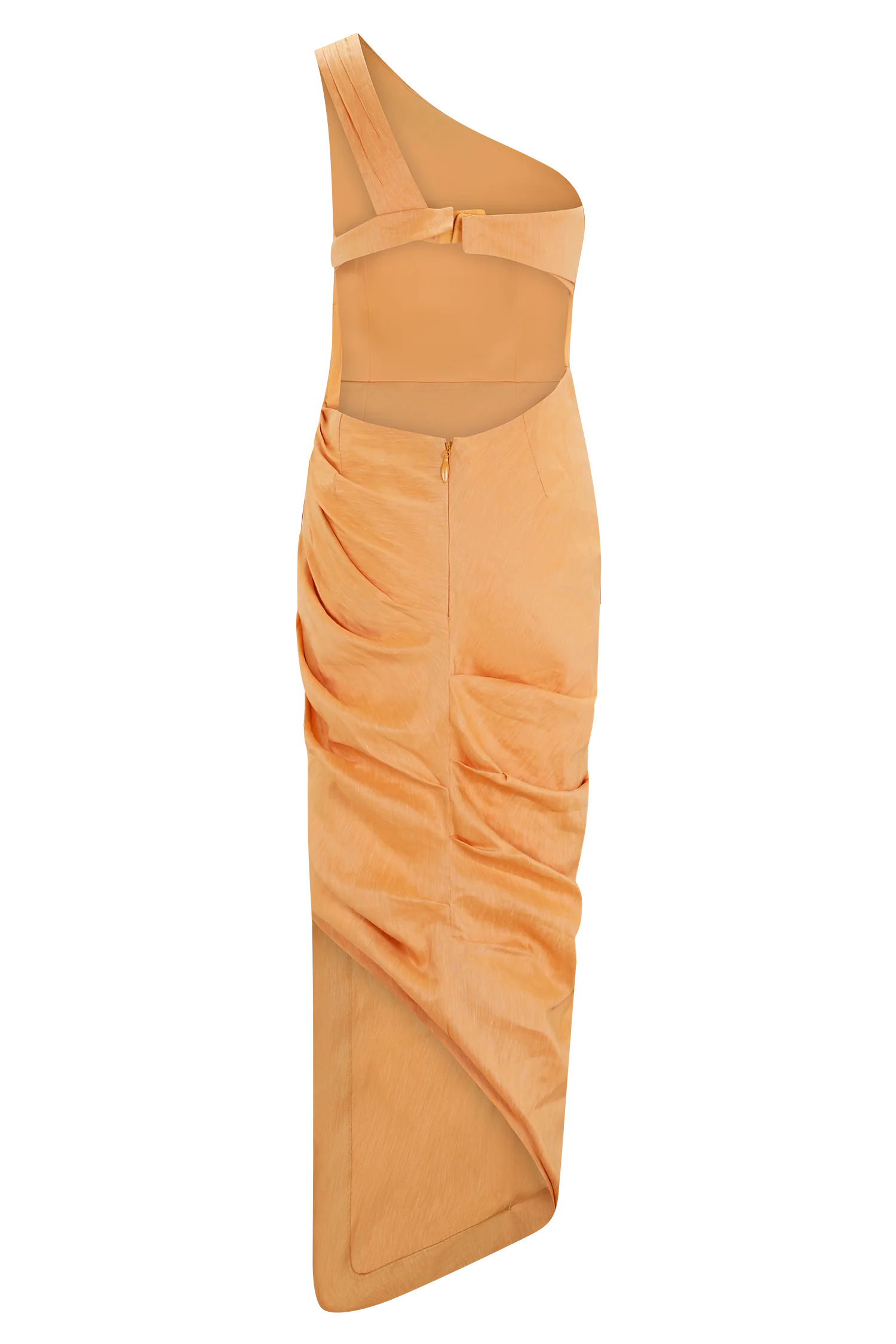The BIRGIT Linen Midi Dress With Hardware brings modern refinement to a timeless silhouette. Designed with a one-shoulder neckline and a fold detail that frames the arm and collar line, it creates a sculptural yet effortless look. Gathering along the side seam flatters the waist and adds soft dimension, while the linen fabrication offers a natural drape and breathable comfort. Fully lined and finished with an invisible back zipper and hook-and-eye closure, this midi-length dress combines minimal polish with quiet strength.