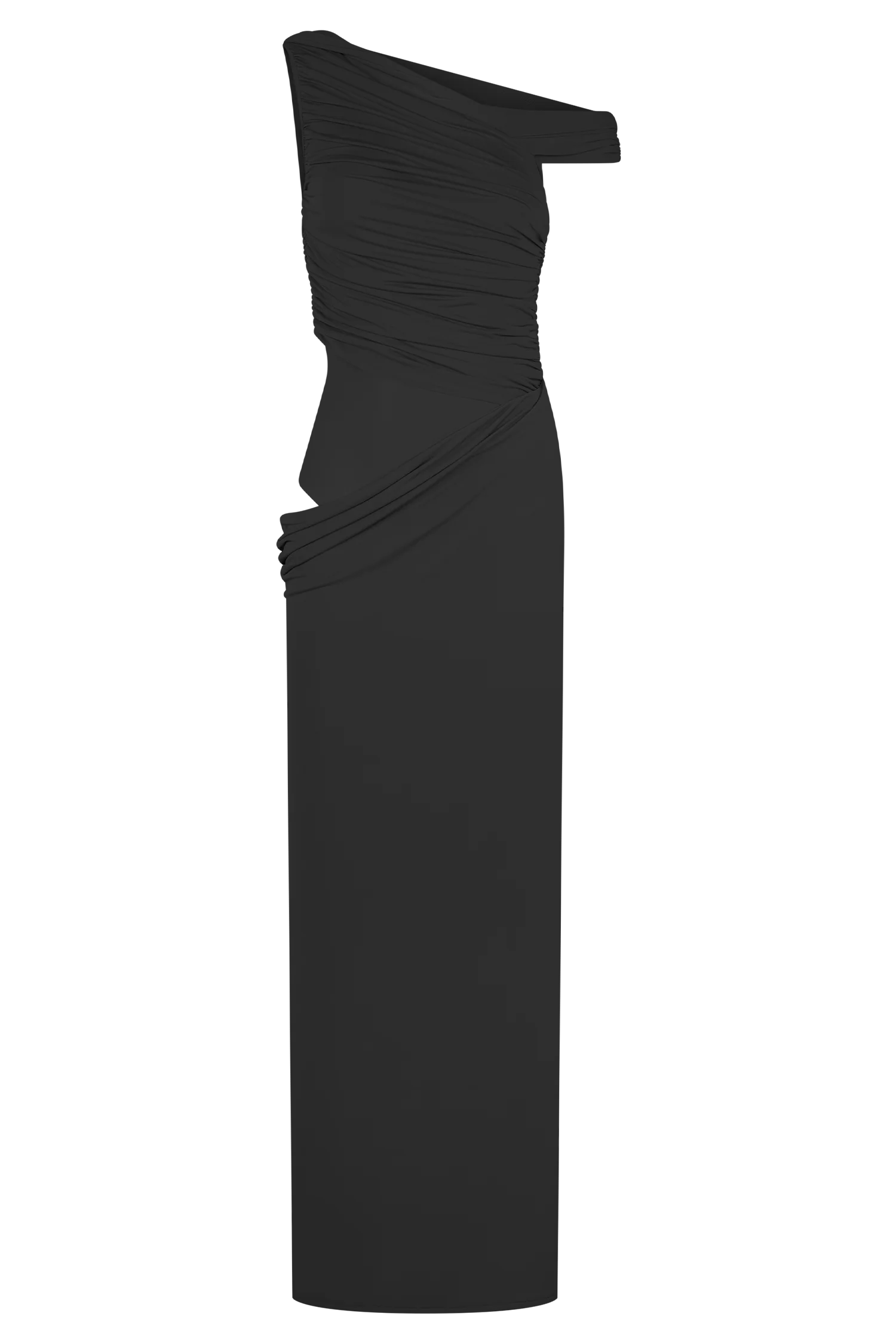 The CALLEN One Shoulder Slinky Maxi Dress is designed to make an entrance. Featuring an asymmetrical neckline with a twisted shoulder detail, this statement silhouette is balanced by a gathered bodice and sheer mesh waist panel that subtly reveals while sculpting the figure. A draped skirt overlay flows into a fishtail hem, creating soft movement with every step. Fully lined for a smooth finish, this dress is the perfect blend of modern drama and timeless elegance—made for evenings that call for something unforgettable.