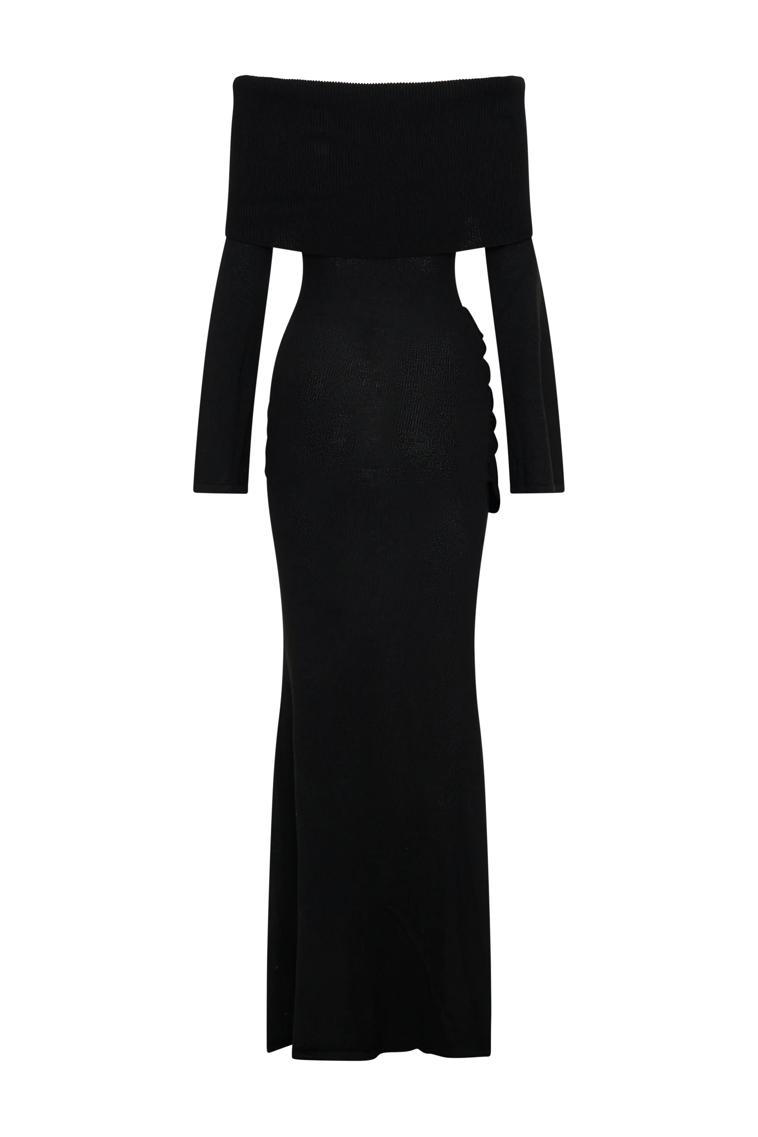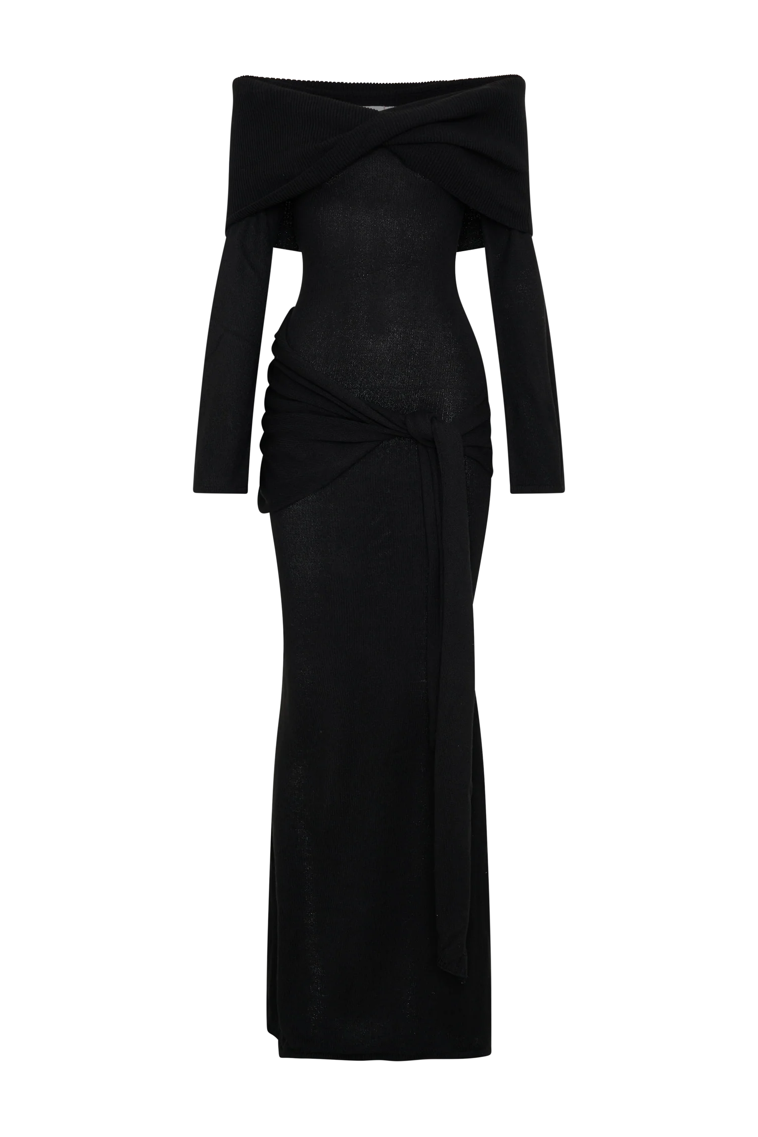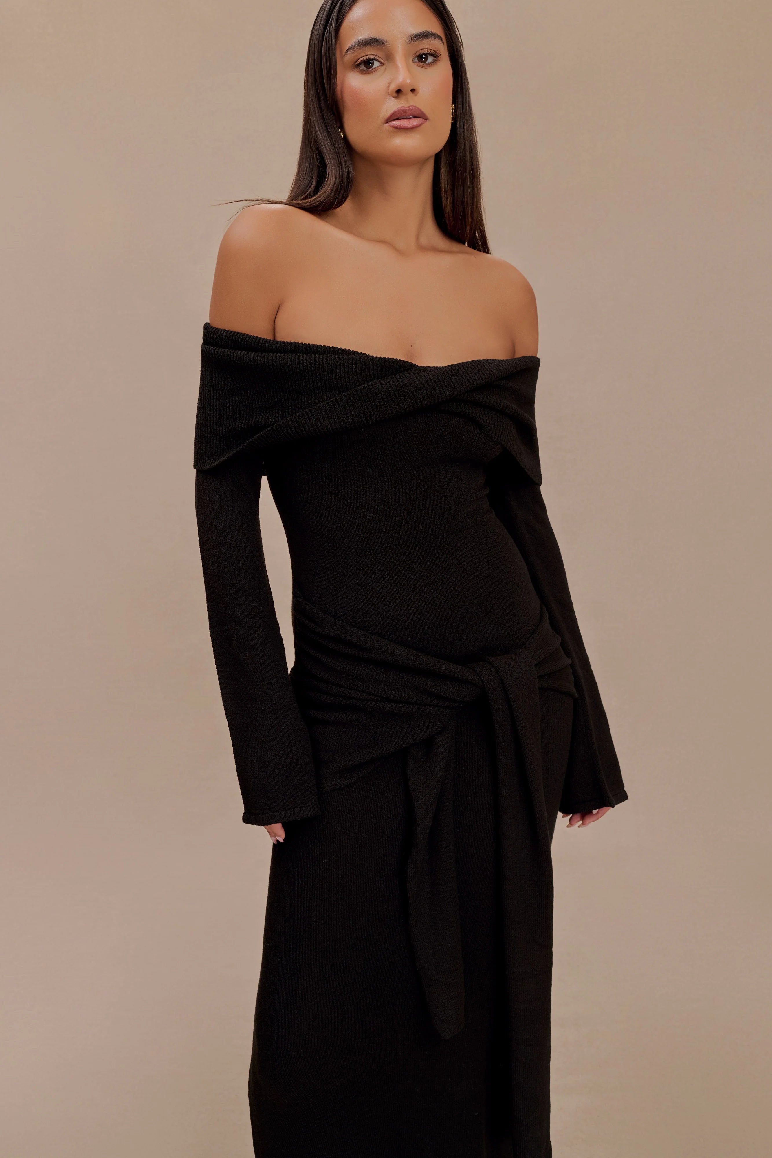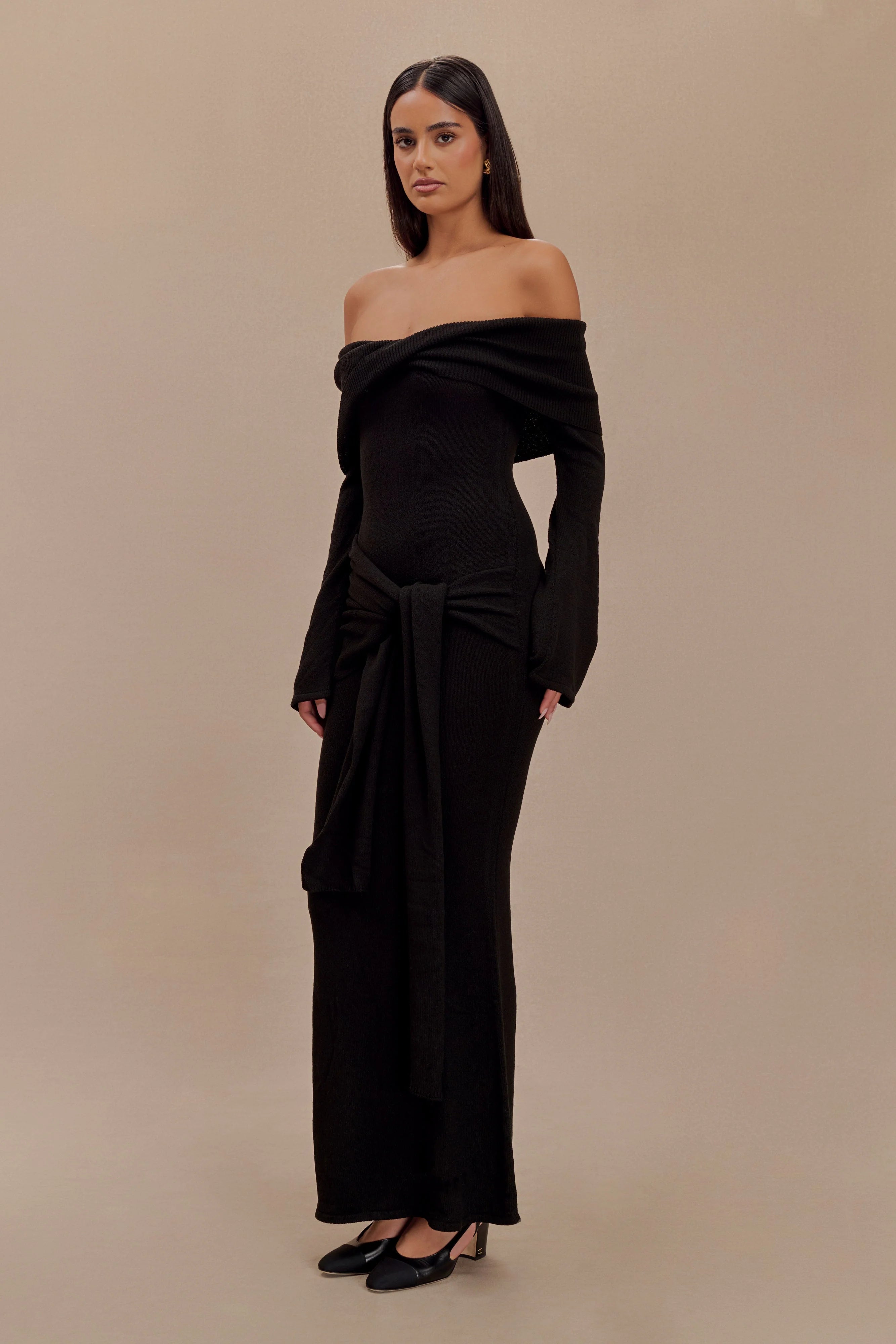 The CAMERON Off Shoulder Tie Maxi Dress is designed to make a statement with its off-the-shoulder neckline and sophisticated twist front overlay. Long sleeves and a bodycon silhouette sculpt the figure, flowing into a striking fishtail hem for added drama. The maxi length is complemented by a delicate tie detail at the hip, creating a refined yet effortless finish. Unlined in a soft knit, Cameron offers a seamless blend of luxury and comfort, perfect for your most elevated occasions.