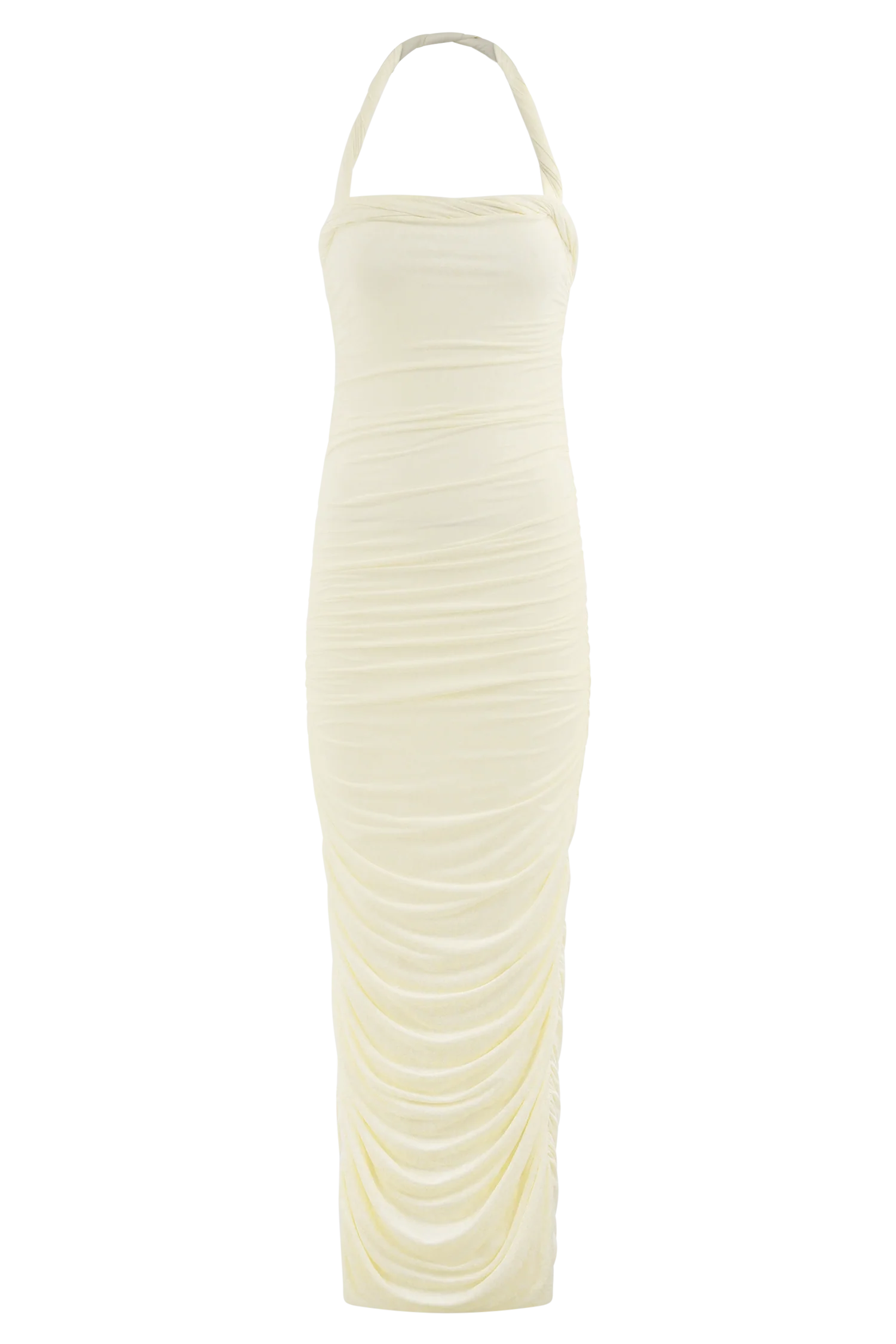 The CAMILA Ruched Halter Midi Dress is designed to contour and captivate. Crafted in soft stretch jersey, this maxi-length silhouette features a ruched body that flatters from every angle. The halter neckline is elevated with a twisted strap and neckline detail, adding a sculptural touch to the sleek design. Fully lined for a smooth finish and easy to pull on, this dress is your go-to for effortless elegance with modern edge.