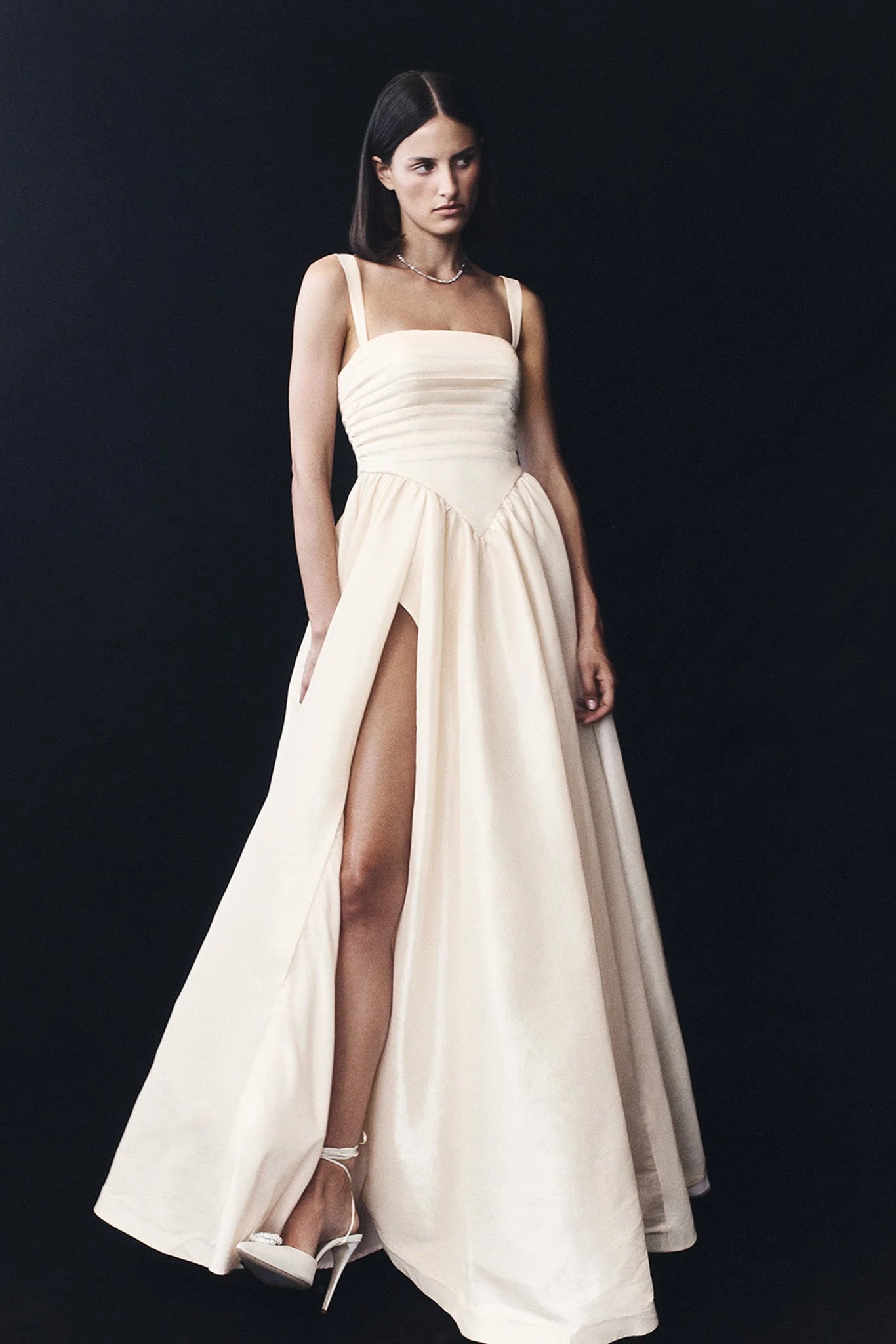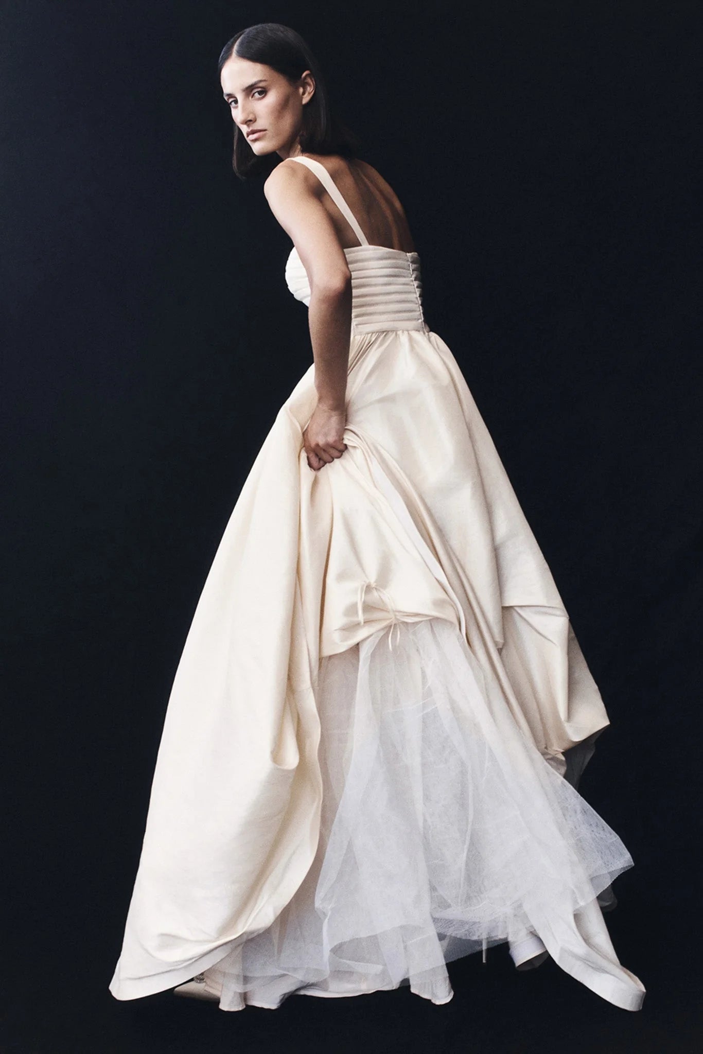 The CARLA Ruched Gown is a masterpiece of refined glamour, designed for unforgettable moments. Featuring a sleek straight neckline and thick removable straps with button-and-buttonhole detailing, this gown offers versatile styling. The pleated bodice and V-point waist sculpt the silhouette, while the gathered waist cascades into a full skirt with a flowing train for breathtaking movement. A daring leg split adds a modern edge, while the internal bustle with ties ensures effortless wearability. Finished with a center-back zip and hook-and-eye closure, the Carla gown is the epitome of timeless sophistication with a contemporary twist.
