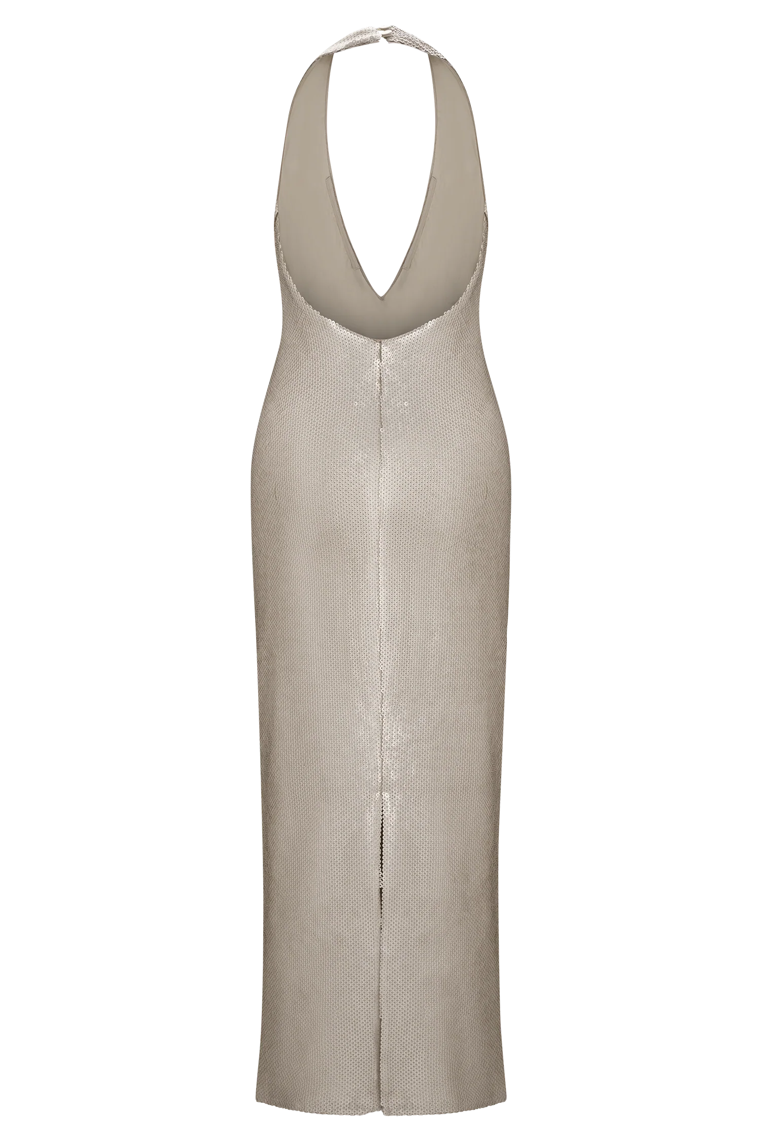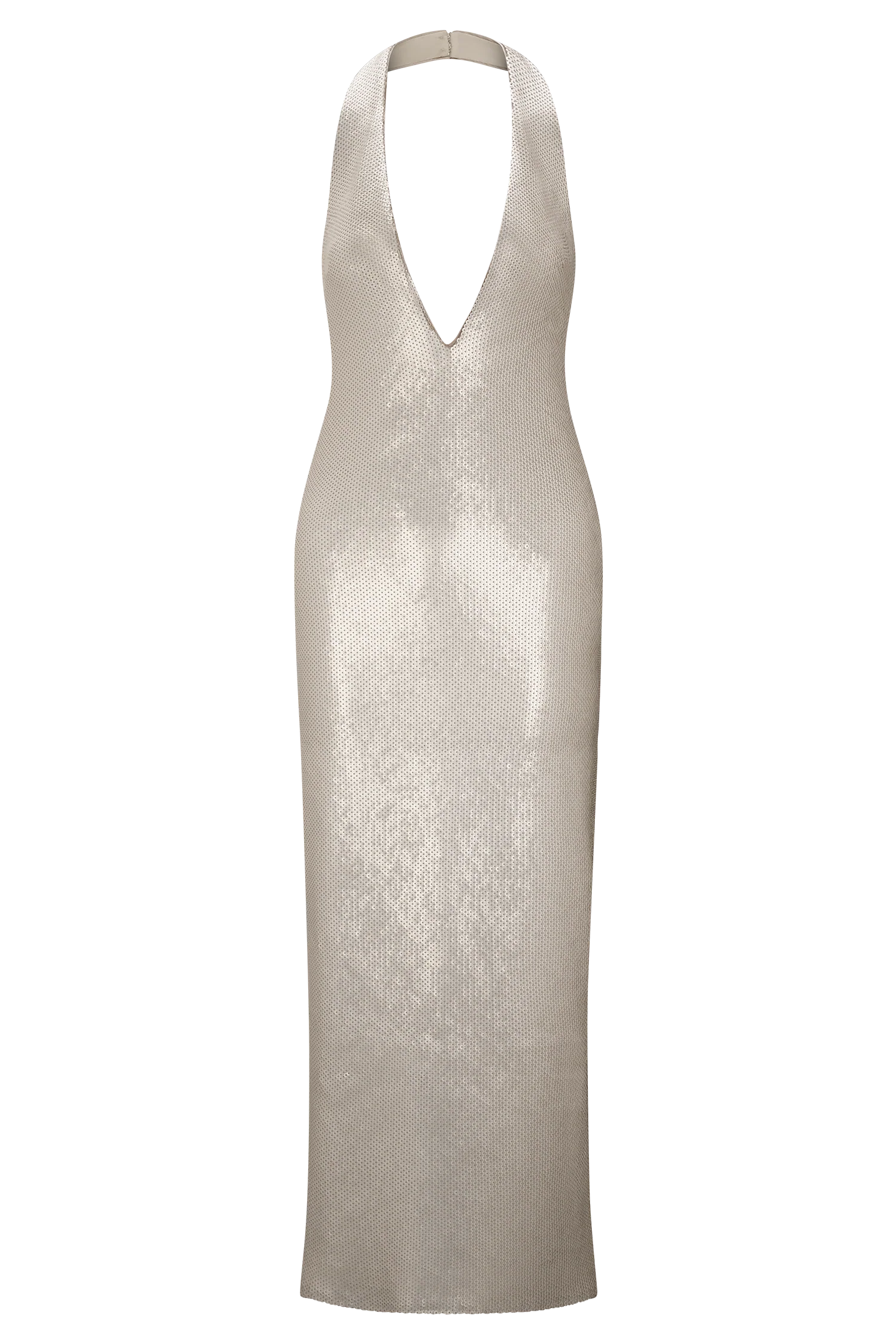 The CARNATION Sequin Halter Midi Dress is designed to dazzle from every angle. Featuring a plunging halter neckline and open low back, this bodycon silhouette is crafted to contour the figure while delivering high-impact sparkle. A button closure at the neck and an invisible back zip ensure a secure fit, while the centre back split allows for graceful movement. Fully lined for comfort, this dress is your go-to for after-dark events where all eyes are on you.