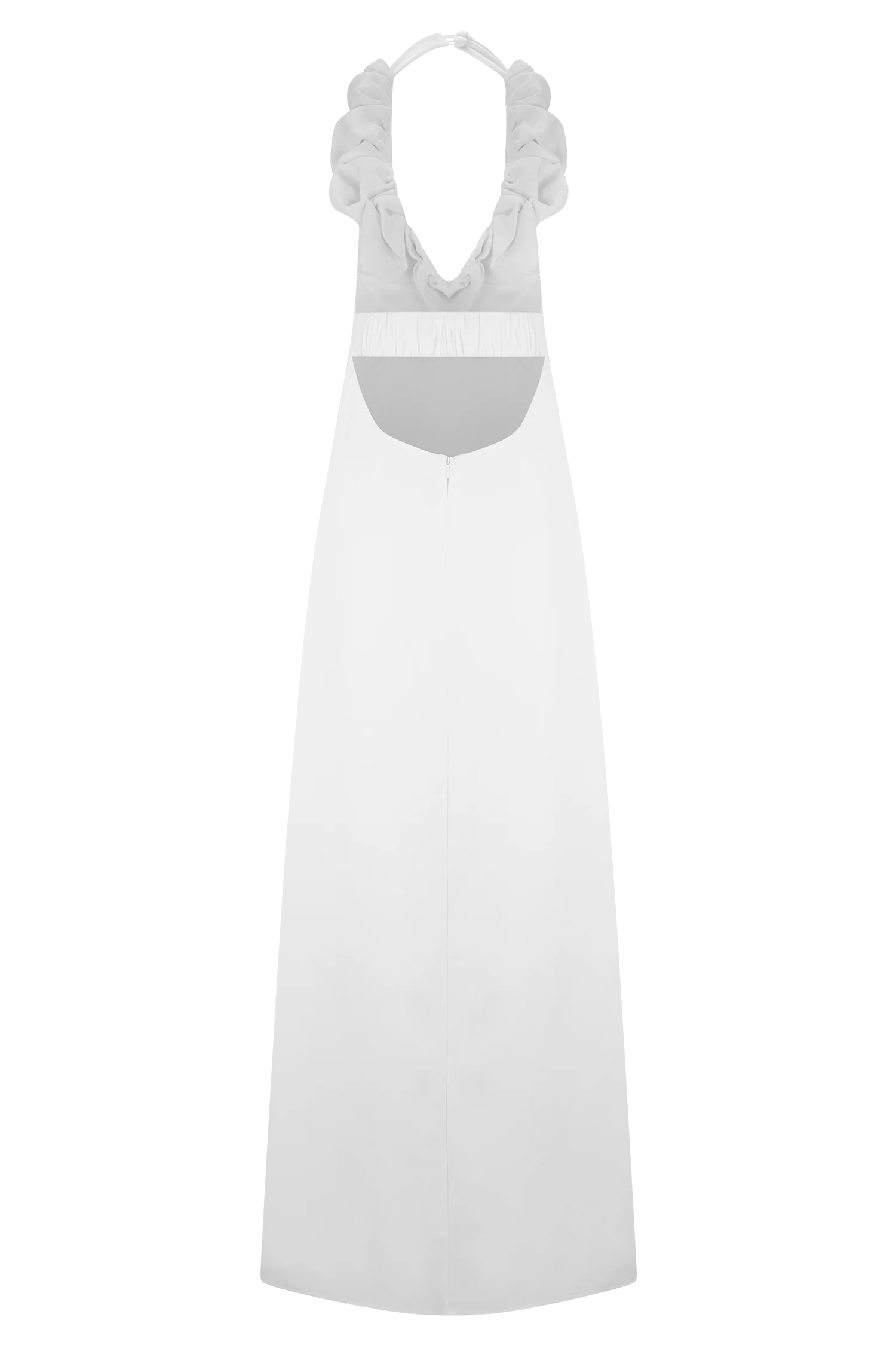 The CAROLYN Linen Bubble Maxi Dress is the perfect blend of playful silhouette and breezy sophistication. Featuring a low bubble neckline and halter neck with button closure, this maxi dress flatters with an airy A-line hem and subtle structure. A back elastic strap ensures a comfortable fit, while a centre back invisible zip keeps the finish clean. Fully lined for effortless wear, this dress is your go-to for sun-soaked days, garden parties, and elevated holiday styling.