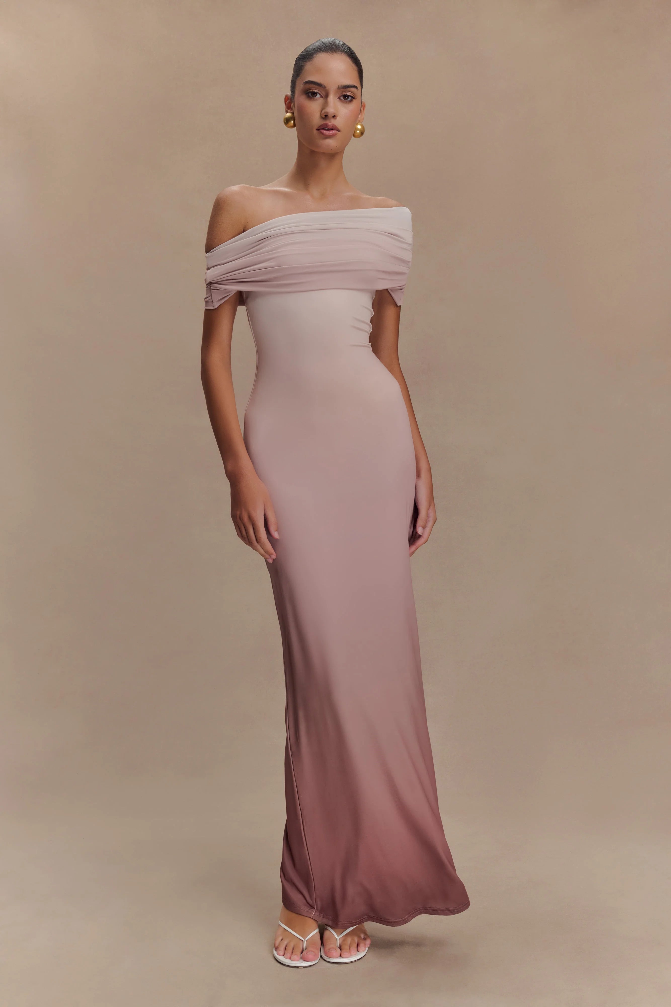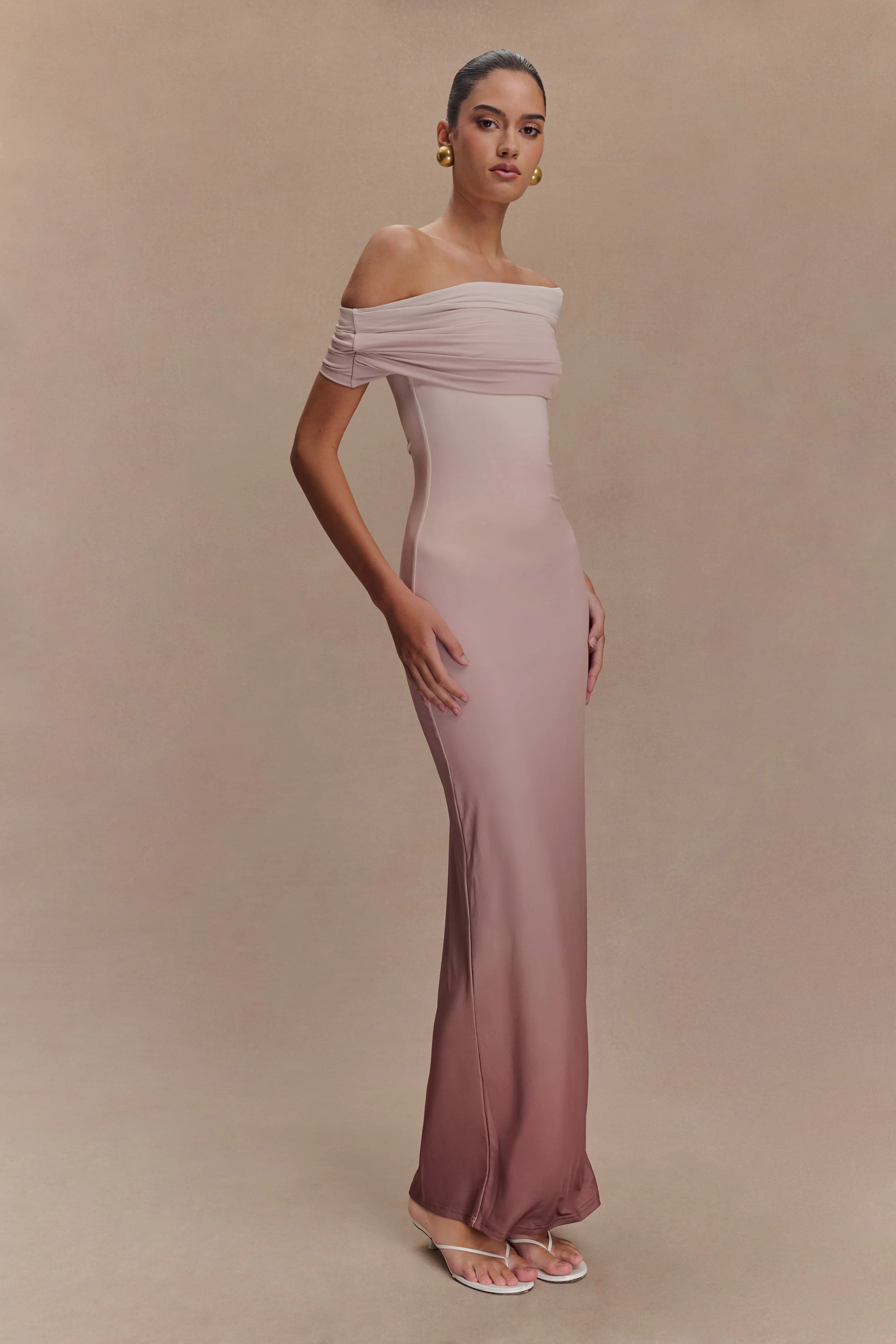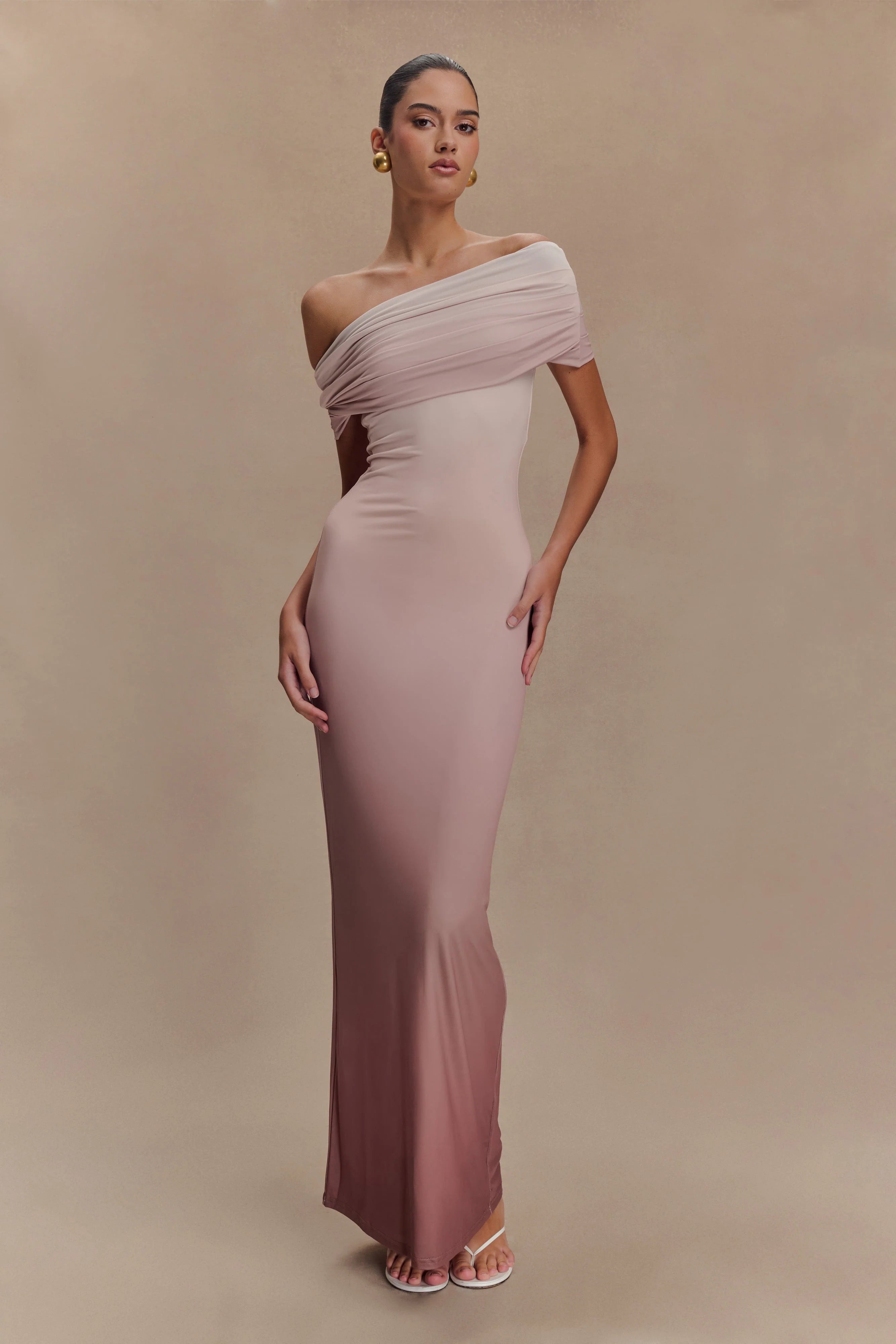 The CASSANDRA Off Shoulder Slinky Maxi Dress exudes sophistication with a touch of allure. Its asymmetrical neckline adds a modern twist, framing the shoulders beautifully. With drop shoulders providing an elegant drape, this dress offers effortless charm. The ruched overlay adds texture and dimension, enhancing the silhouette with subtle intrigue. Lined for comfort and quality, and featuring a bodycon fit, this dress is a versatile and chic choice for any occasion, ensuring you look and feel your best with every wear.