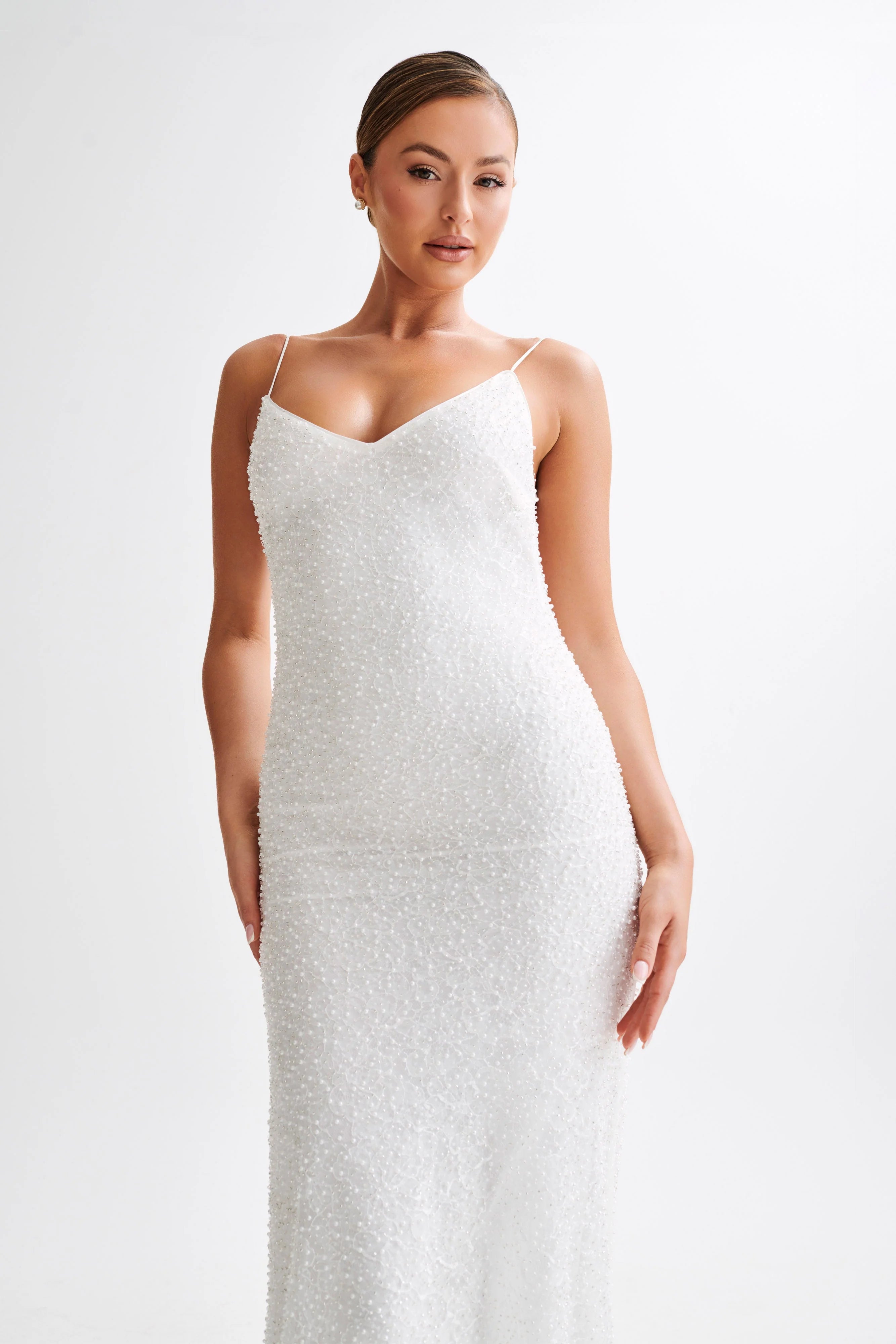Indulge in regal elegance with our CATALINA Pearl Beaded Wedding Gown, a captivating ensemble that exudes grace and sophistication. Featuring a flattering princess neckline and adjustable straps, this gown ensures a perfect fit for every wearer. Lined for comfort, it offers a relaxed fit that flatters any figure. The low back adds a touch of allure, while the centre-back train brings drama and grandeur to your entrance. Plus, with a convenient bustle feature featuring a hook and button, you can secure the train of the skirt up effortlessly, allowing you to dance the night away without worry. Embrace the romance and charm of royalty with our Catalina, the perfect choice for your special day.