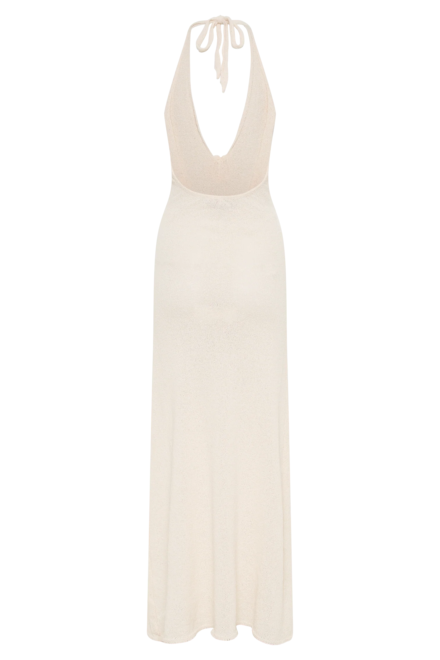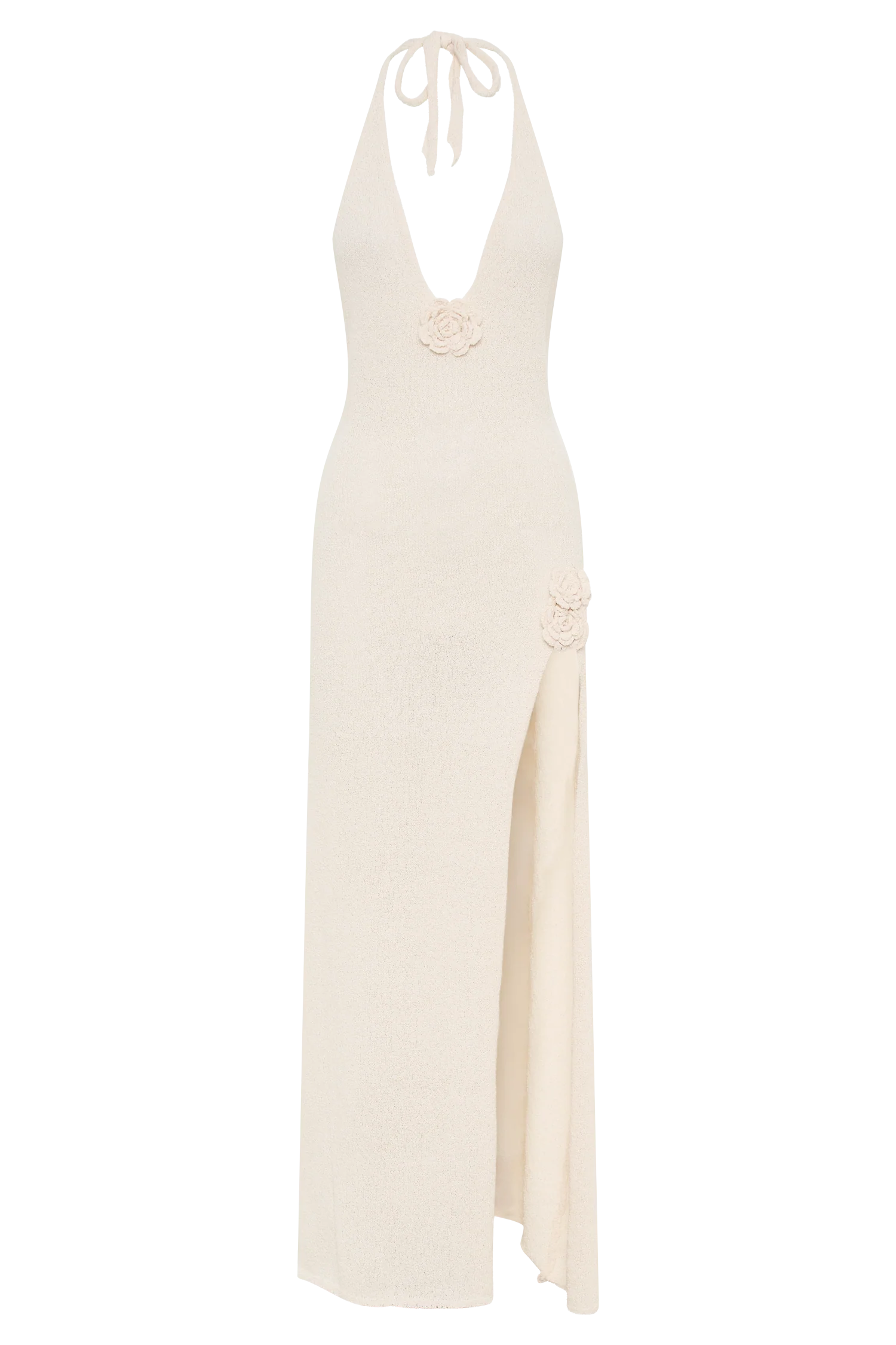 Elevate your style with the CHERIE Knit Halter Maxi Dress, a stunning combination of elegance and allure. Boasting a V neckline and functional halter, this dress offers a chic and customisable fit. The leg split adds a touch of drama, while the open back enhances its modern appeal. Designed with a bodycon silhouette, it exudes sophistication and grace. Featuring flower applique at the centre front neckline, this dress adds a delicate and feminine touch. Unlined and knitted, it ensures both comfort and breathability. Make a statement at any event with the Cherie Knit Halter Maxi Dress, where every detail reflects timeless charm and contemporary style.