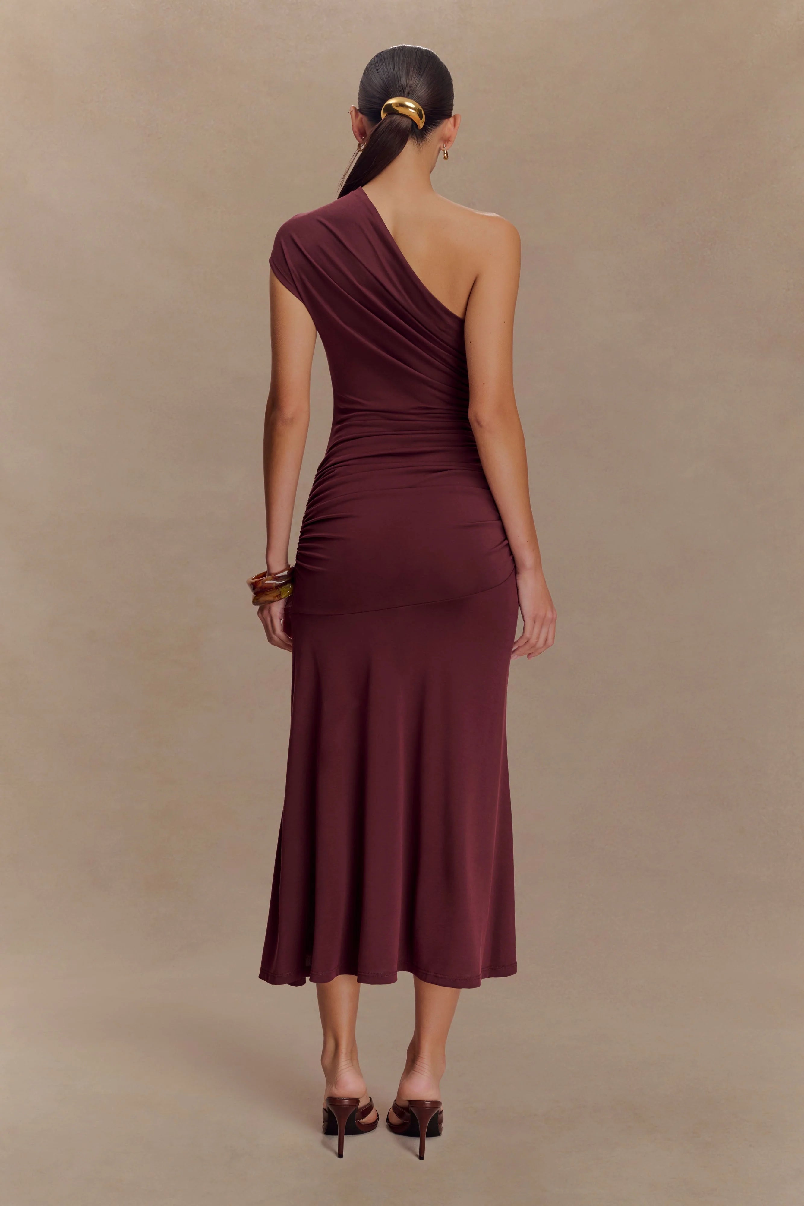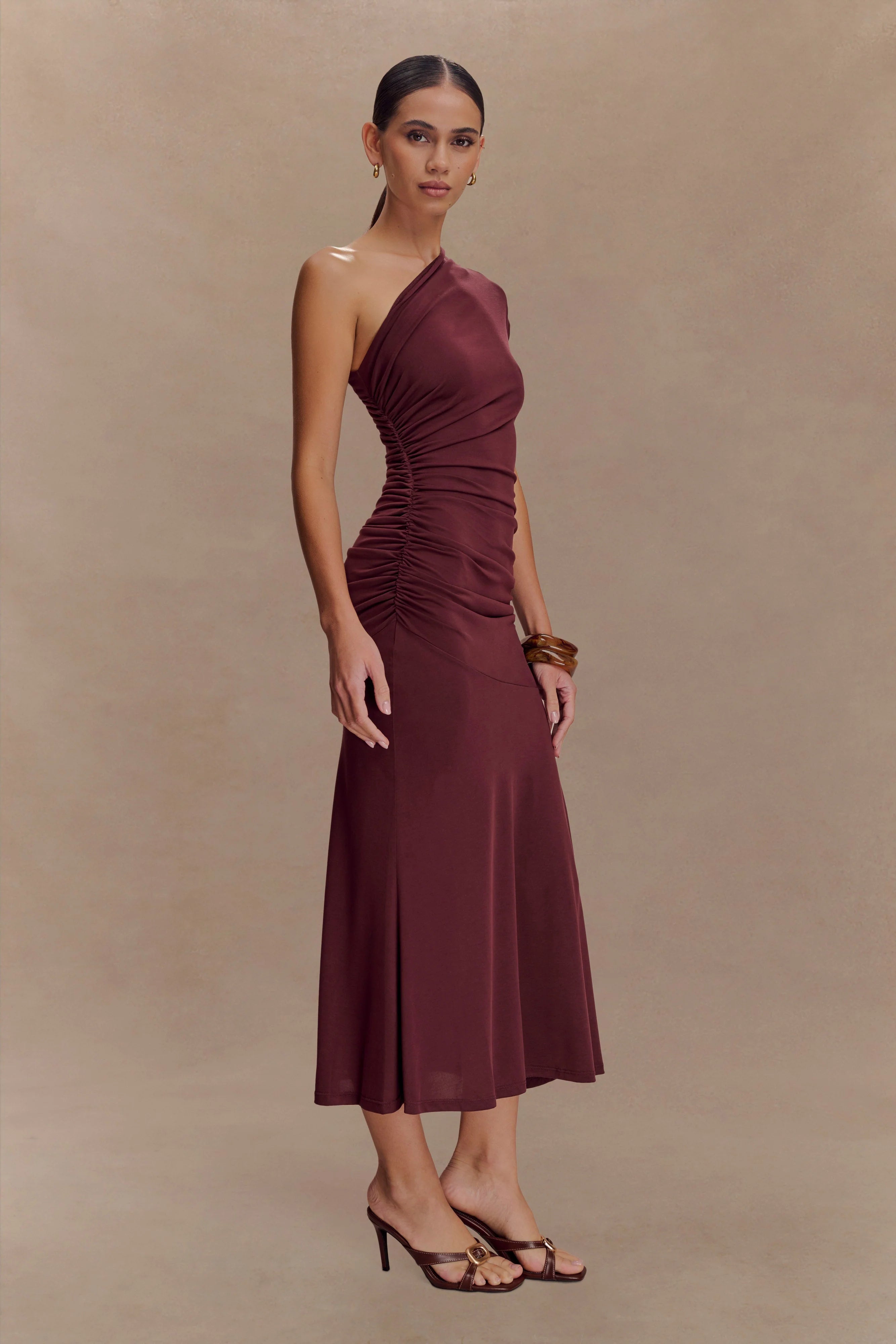 Turn heads in the CHLOE Peached Jersey One Shoulder Midi Dress, a perfect balance of sophistication and allure. Designed with an asymmetrical neckline and a striking one-shoulder silhouette, this dress exudes modern femininity. Waist ruching enhances the figure, creating a flattering and contoured fit, while the fishtail hem adds graceful movement. Crafted in a soft peached jersey, this dress is your go-to for weddings, cocktail events, or any occasion where effortless elegance is key.