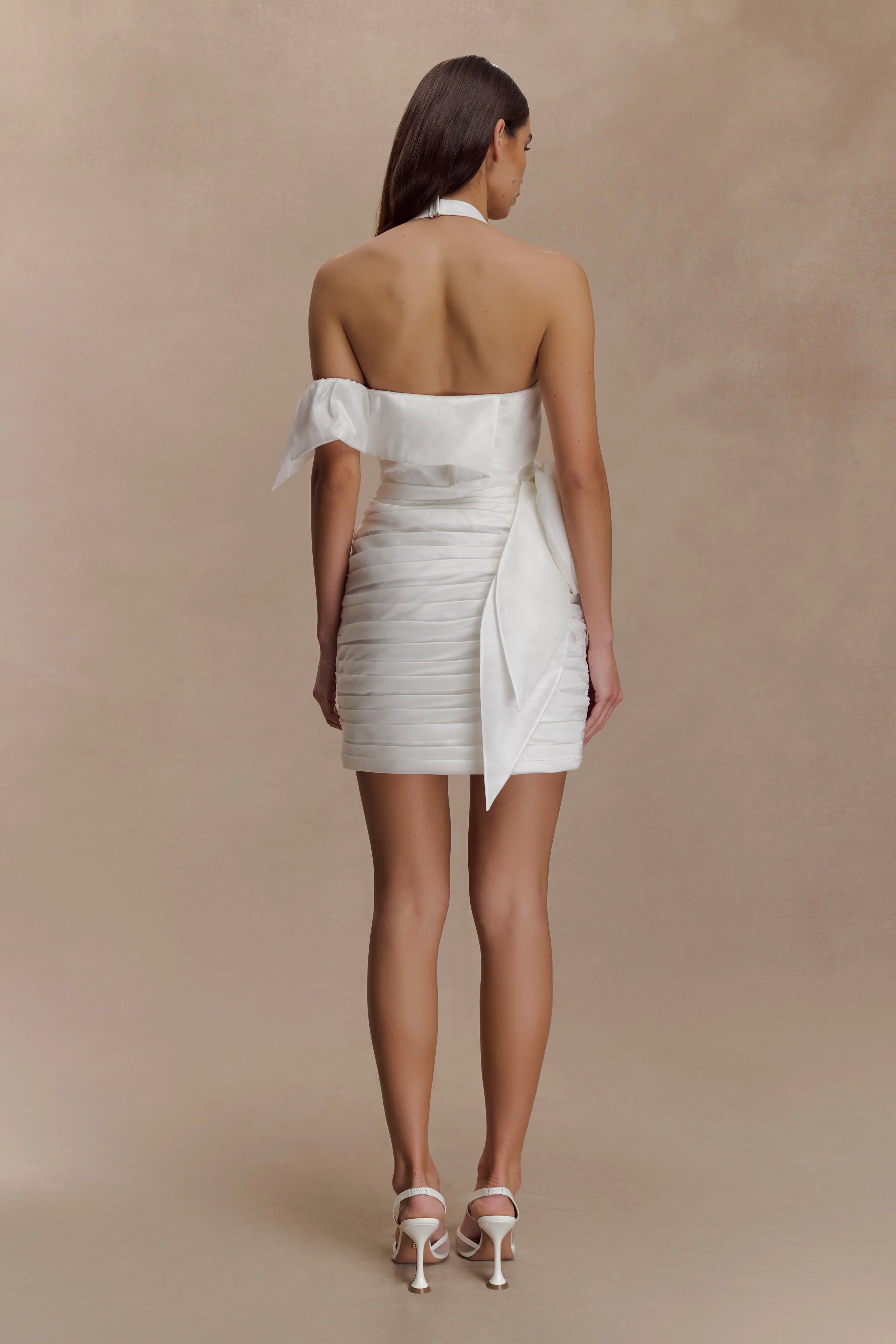 The CLAUDINE Taffeta Floral Mini Dress is a modern masterpiece in silhouette and structure. Featuring an asymmetrical halter neckline and a sleek, fitted bodice, it cinches the waist before flaring into a micro-pleated skirt that moves with architectural grace. Oversized panel detailing adds avant-garde flair, while the crisp taffeta fabrication holds its shape for maximum impact. Designed in a structured mini length, this dress is your go-to for standout styling—where statement meets sophistication.