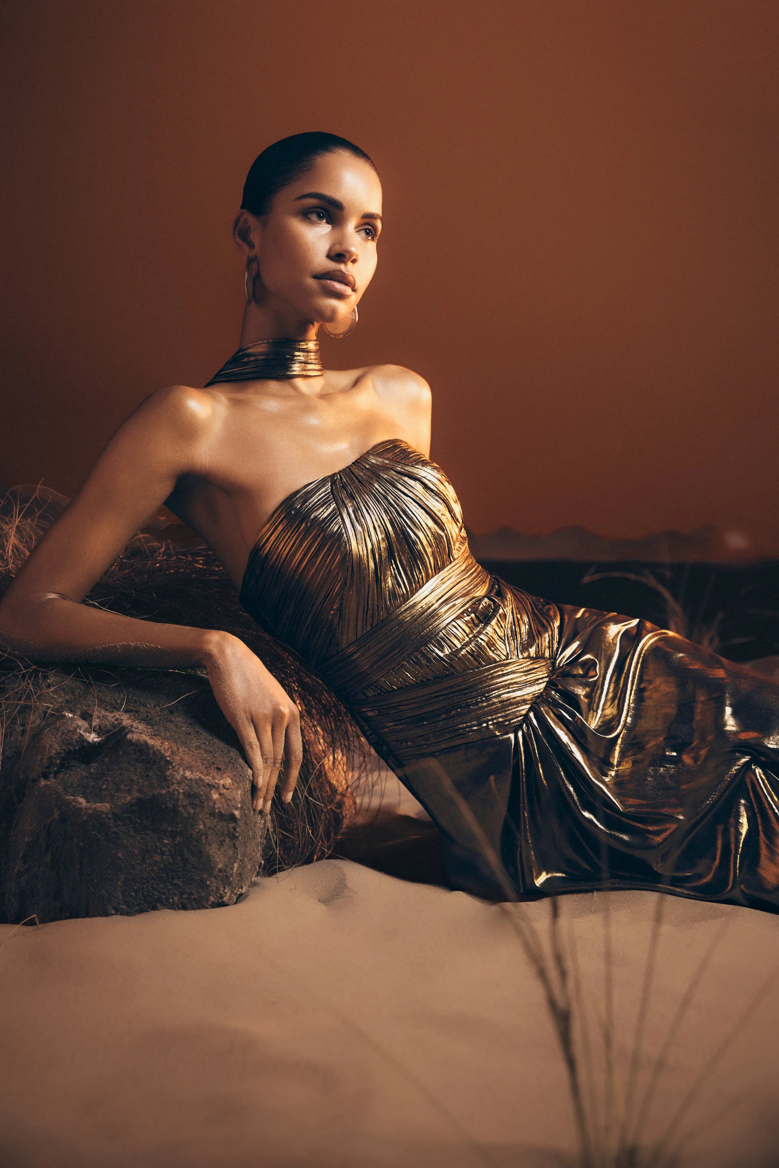 The CLEMENCE Plissé Maxi Dress captures refined movement through precision pleating and a soft draped finish. Designed with a straight neckline and detachable reverse halter strap, it offers versatility with subtle structure. Pleating and panel lines contour the bust and waist before flowing into a relaxed, bodycon silhouette. Finished with a centre front split for fluidity and ease, this dress is fully lined for a smooth fit—balancing sophistication with modern femininity.