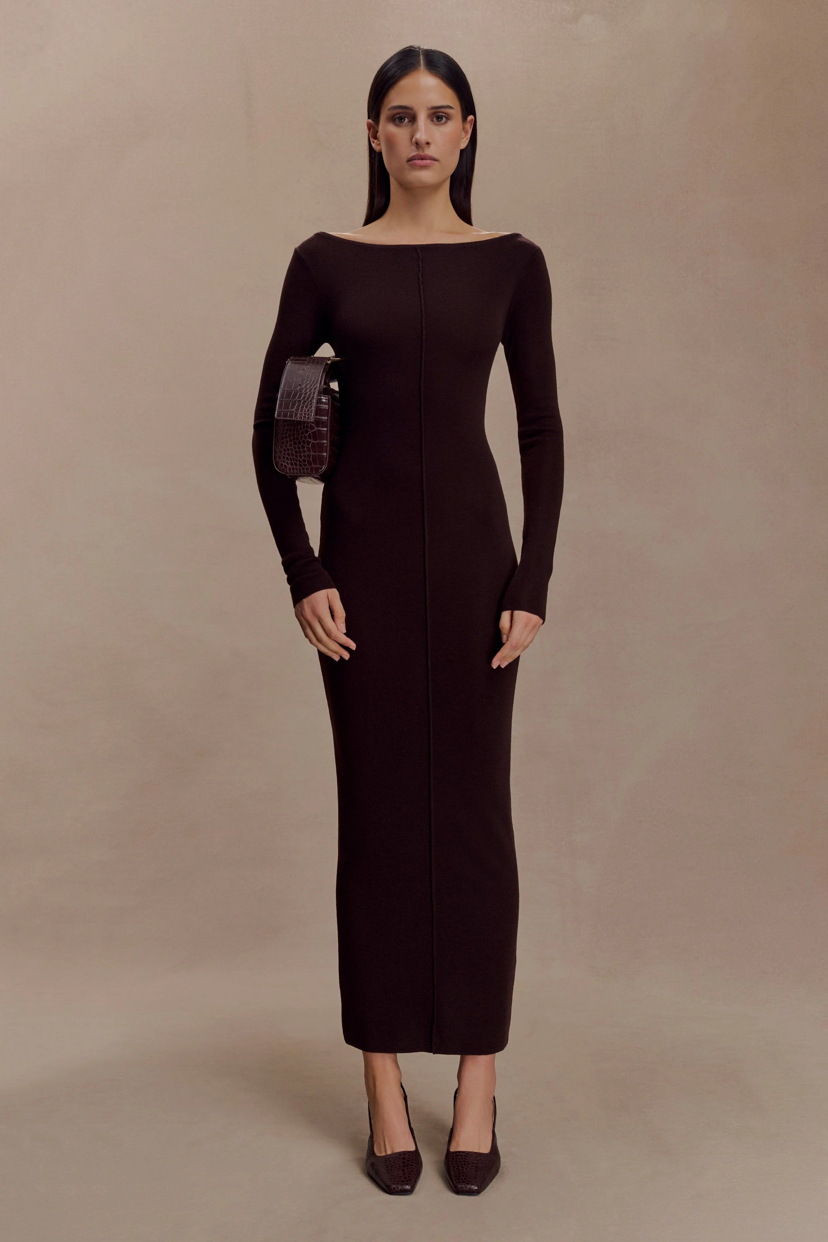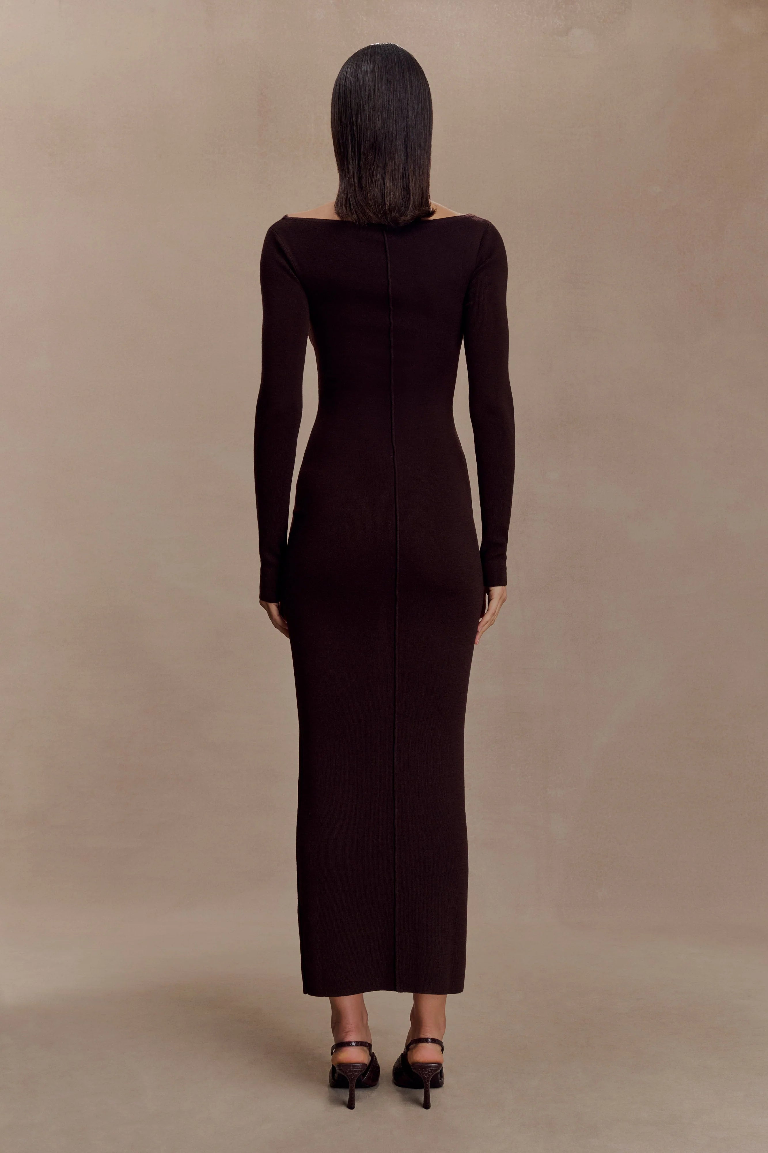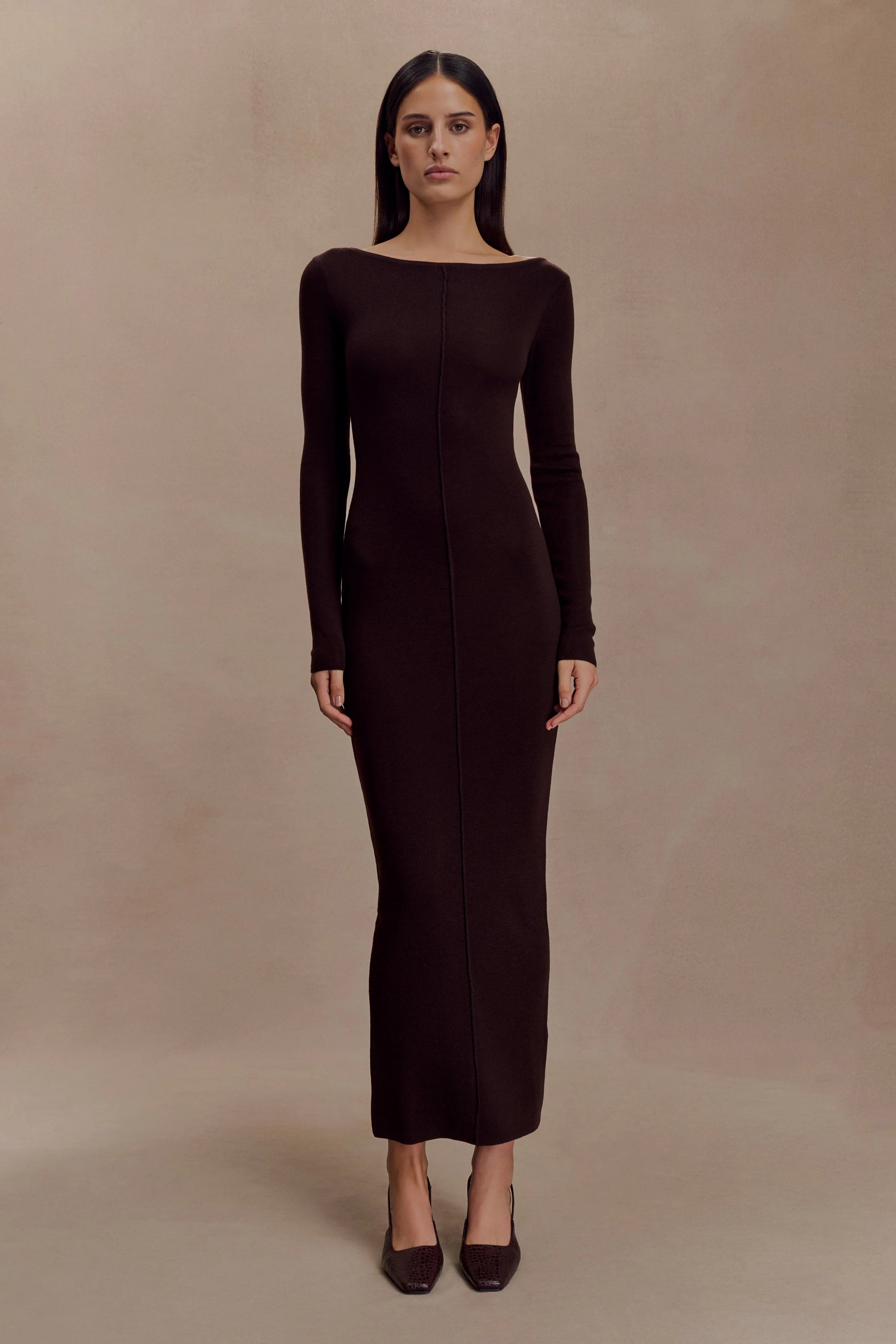 The CLEONA Merino Ribbed Long Sleeve Maxi Dress is a timeless staple with a sculpted edge. Crafted in a soft merino rib knit, it’s designed with a classic boat neckline and long sleeves for a clean, elongating silhouette. Front and back pleat details add subtle texture to its bodycon shape, while the maxi length creates a refined, streamlined finish. Left unlined for a lightweight feel, this dress transitions seamlessly from day to evening with understated elegance.