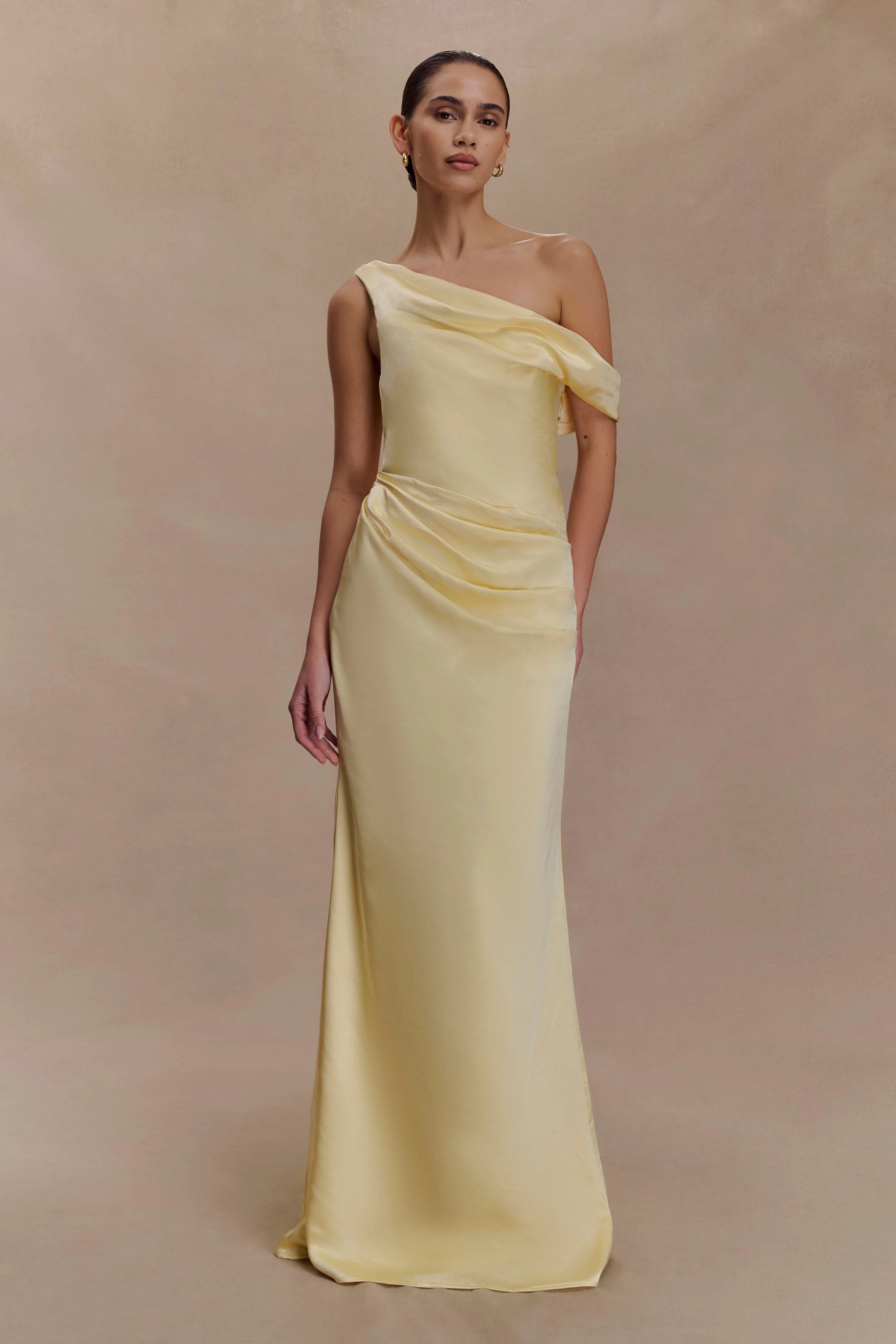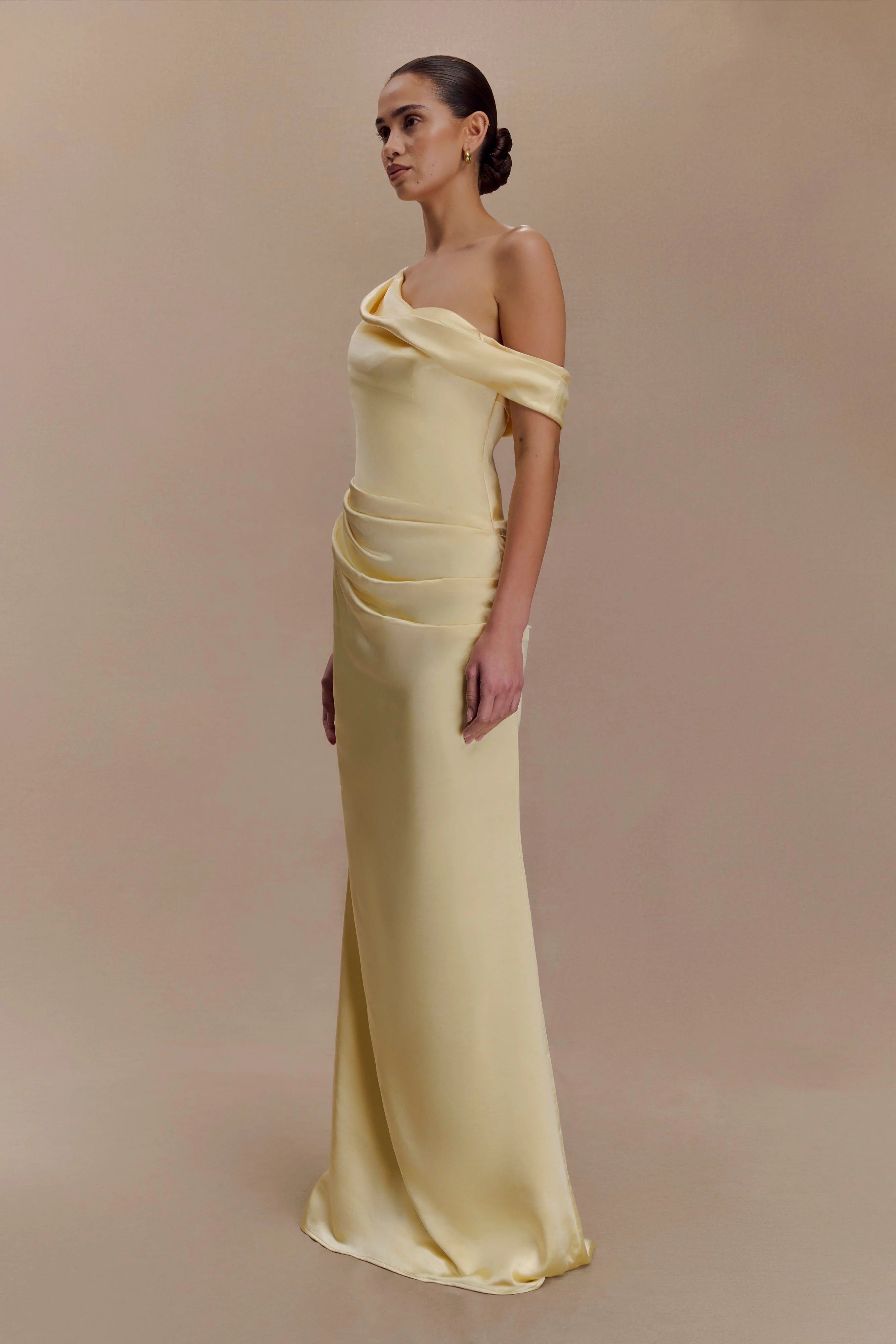 The DALIA Off-Shoulder Satin Maxi Dress is a statement of modern sophistication. Designed with an asymmetrical draped neckline, this sleeveless silhouette exudes effortless glamour. The fitted, boned bodice provides structure and support, while the gathered hip detail enhances the figure with soft, sculptural draping. Crafted in a fluid satin fabric and finished with an internal elastic waist stay for a secure fit, this maxi-length gown moves beautifully with every step. A discreet side zip and hook-and-eye closure ensure seamless wear, making this dress perfect for elegant soirées, black-tie events, or bridal celebrations.