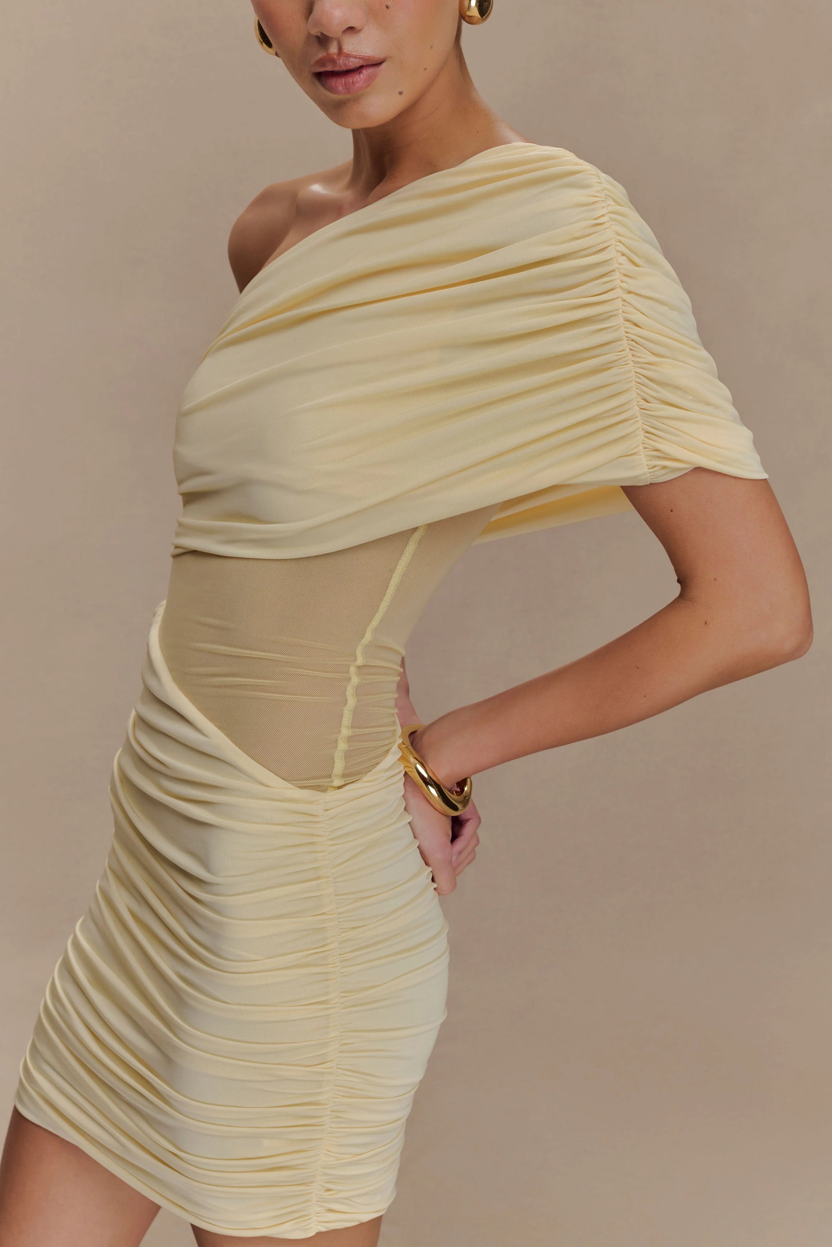 The DALLAS One Shoulder Mesh Mini Dress is designed to turn heads. Featuring a striking one-shoulder neckline and a sculpting bodycon fit, this dress flatters with its gathered waist detail that enhances the silhouette. The sheer mesh and partial lining add dimension and allure, making this your ultimate after-dark statement.
