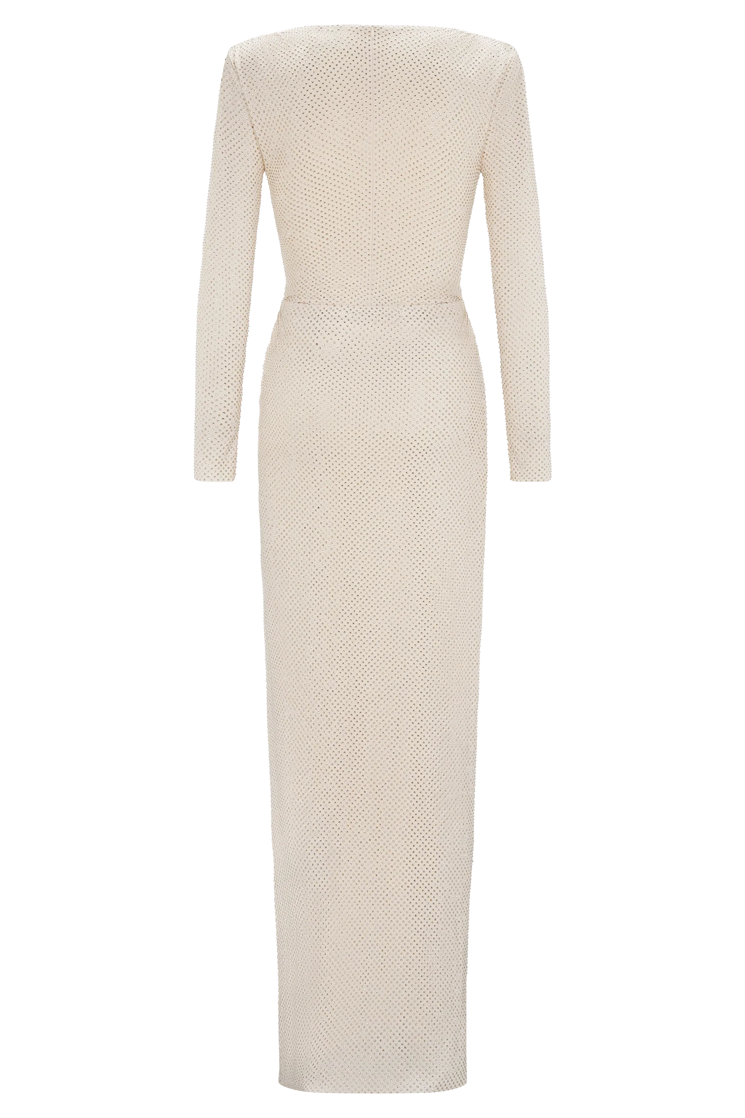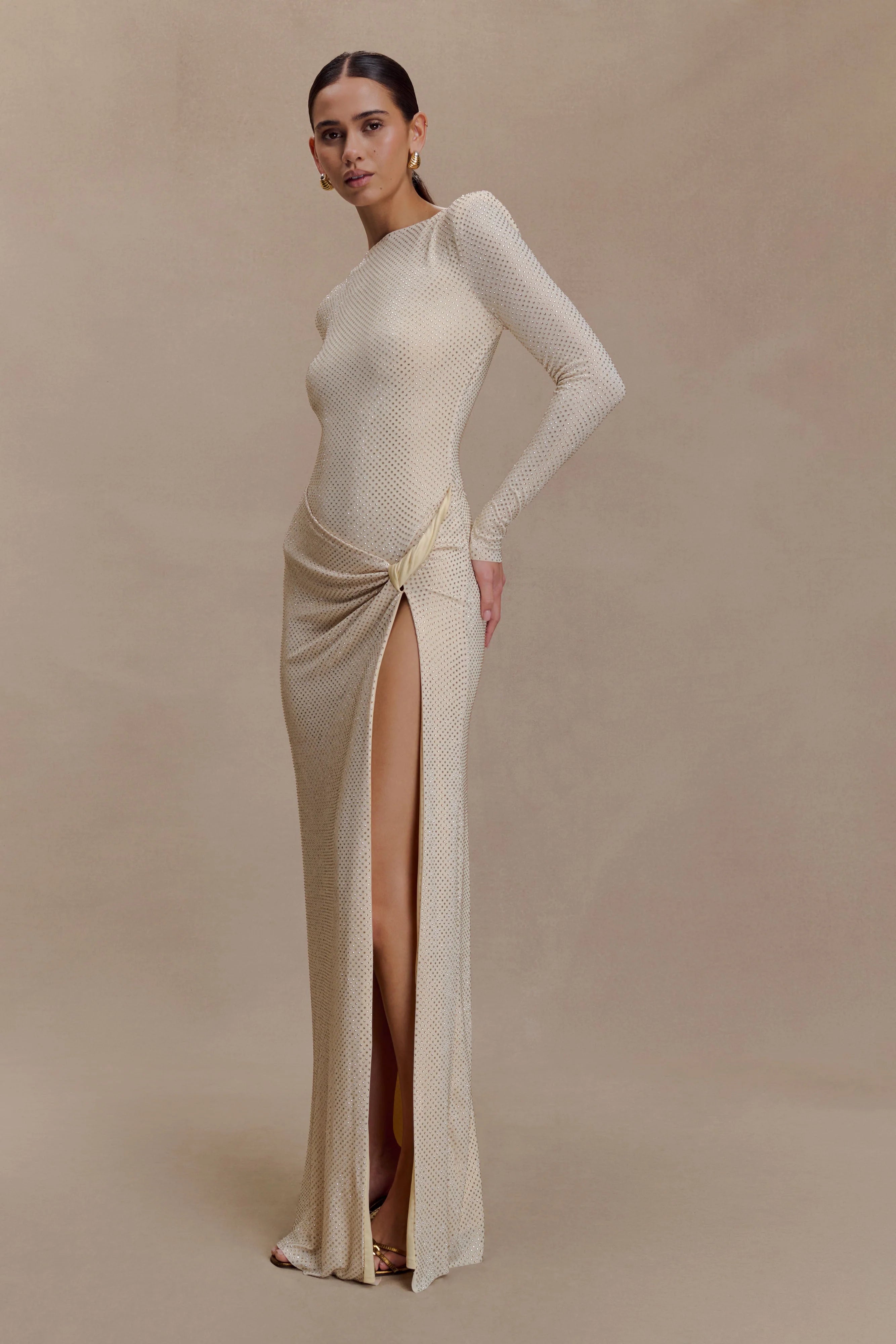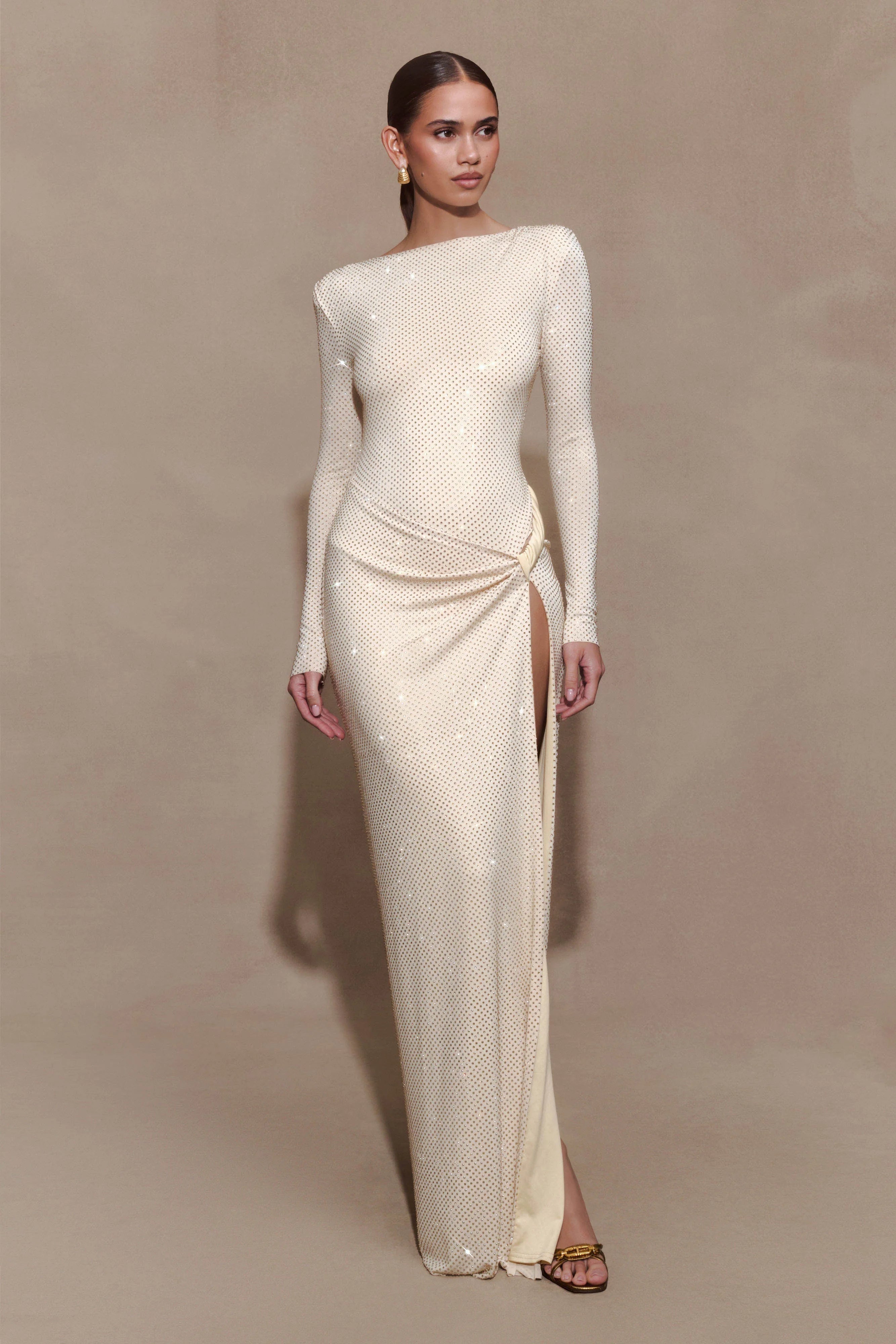 The DEANNA Long Sleeve Diamante Maxi Dress is a statement in sophistication and versatility. Designed with a sleek boat neckline and long sleeves, it features a twist waist detail that accentuates the silhouette in a fitted bodycon cut. The standout feature? Removable shoulder pads — giving you two looks in one, from sharp structure to soft drape. Fully lined for a smooth finish, this dress is complete with a side leg split and back zip closure for ease of wear. Perfect for moments that call for refined glamour with a custom edge.