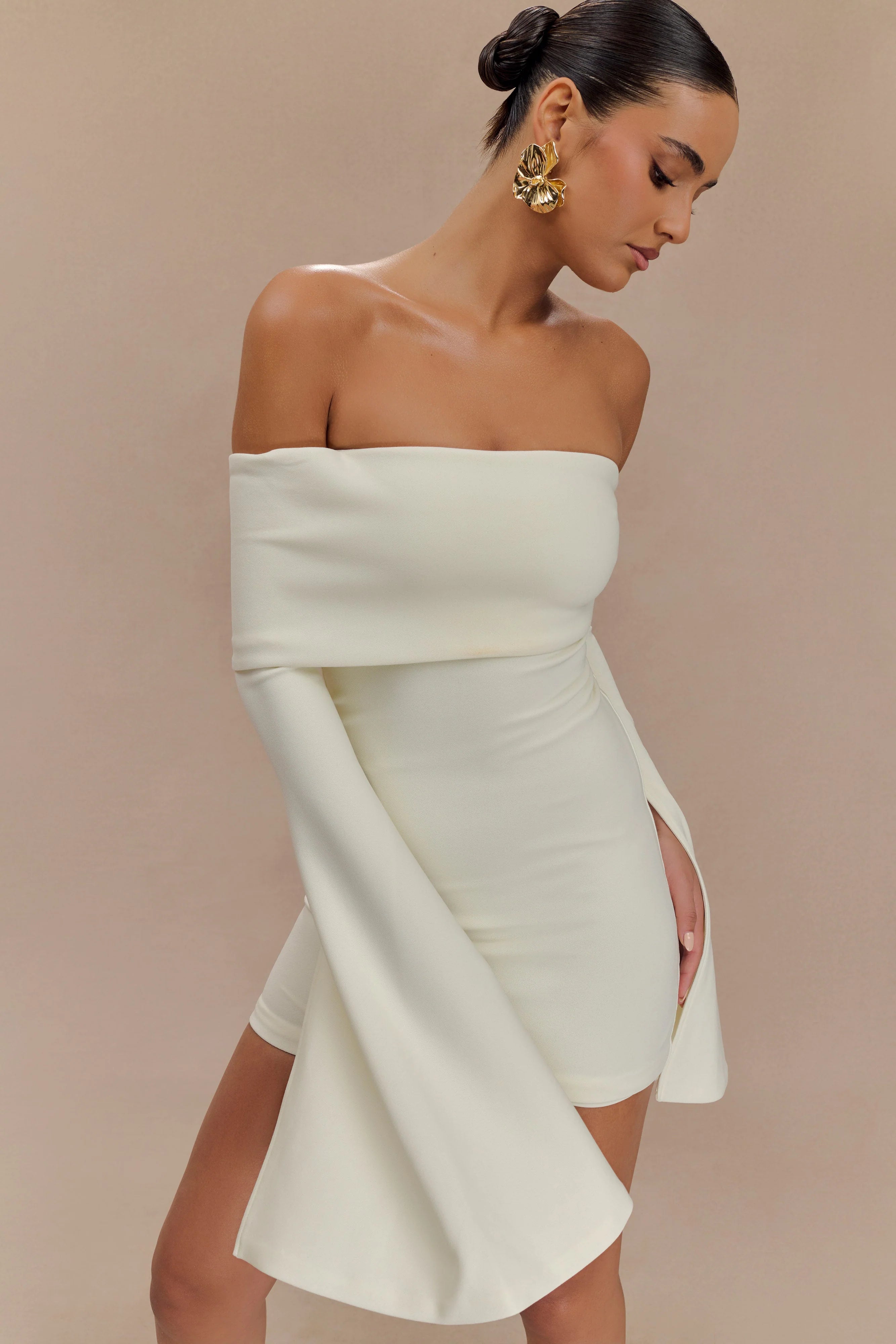 Step into elegance with the DOMINIQUE Off Shoulder Long Sleeve Mini Dress. This striking design features an off-the-shoulder neckline that highlights your collarbone, while the ruched overlay adds a touch of texture and allure. The long flared sleeves bring a dramatic flair, perfectly balancing the fitted silhouette that hugs your curves. Crafted from a stretch fabrication for comfort and ease of movement, this mini-length dress ensures a flattering fit. Finished with a centre back zip closure for a seamless look, this dress is your go-to for turning heads at any occasion.