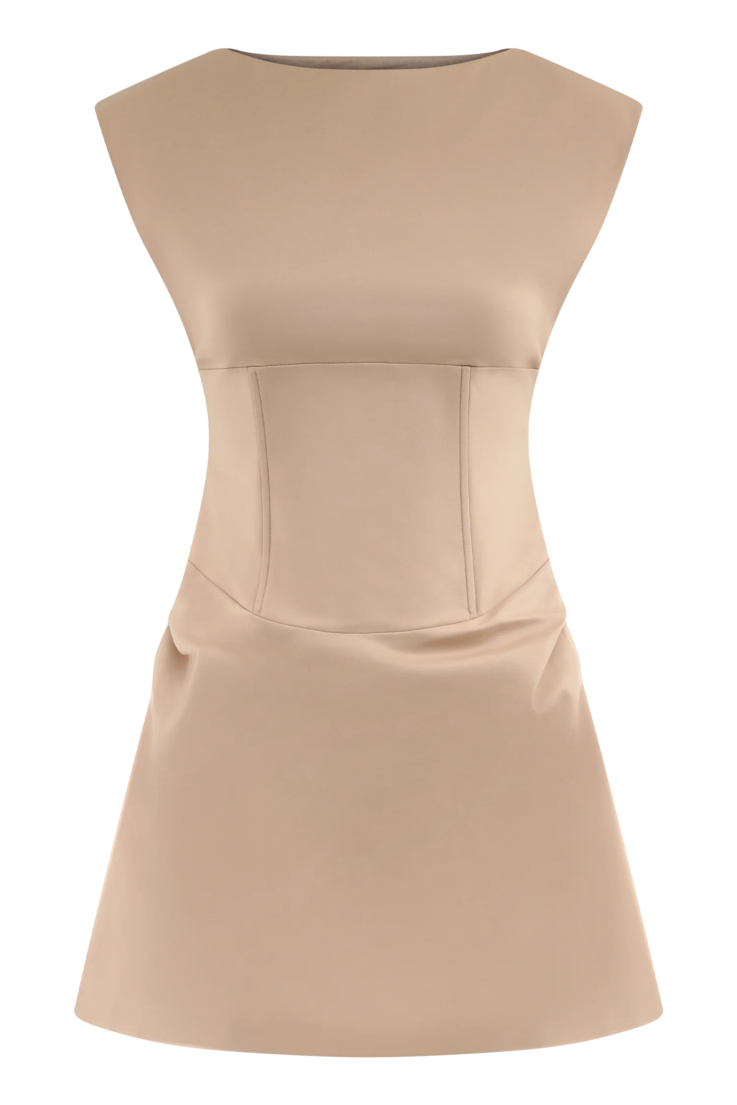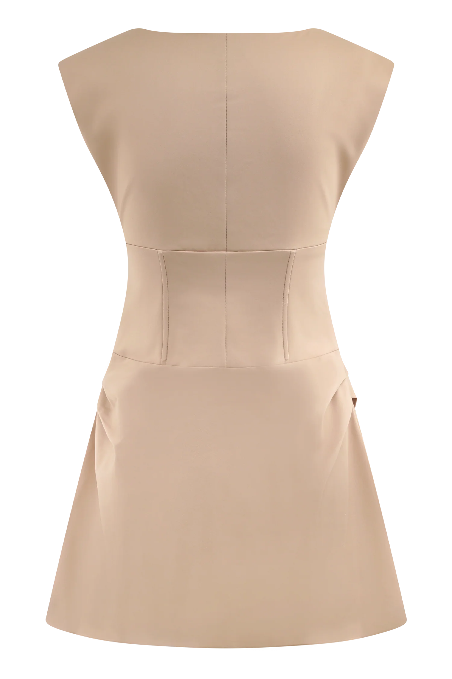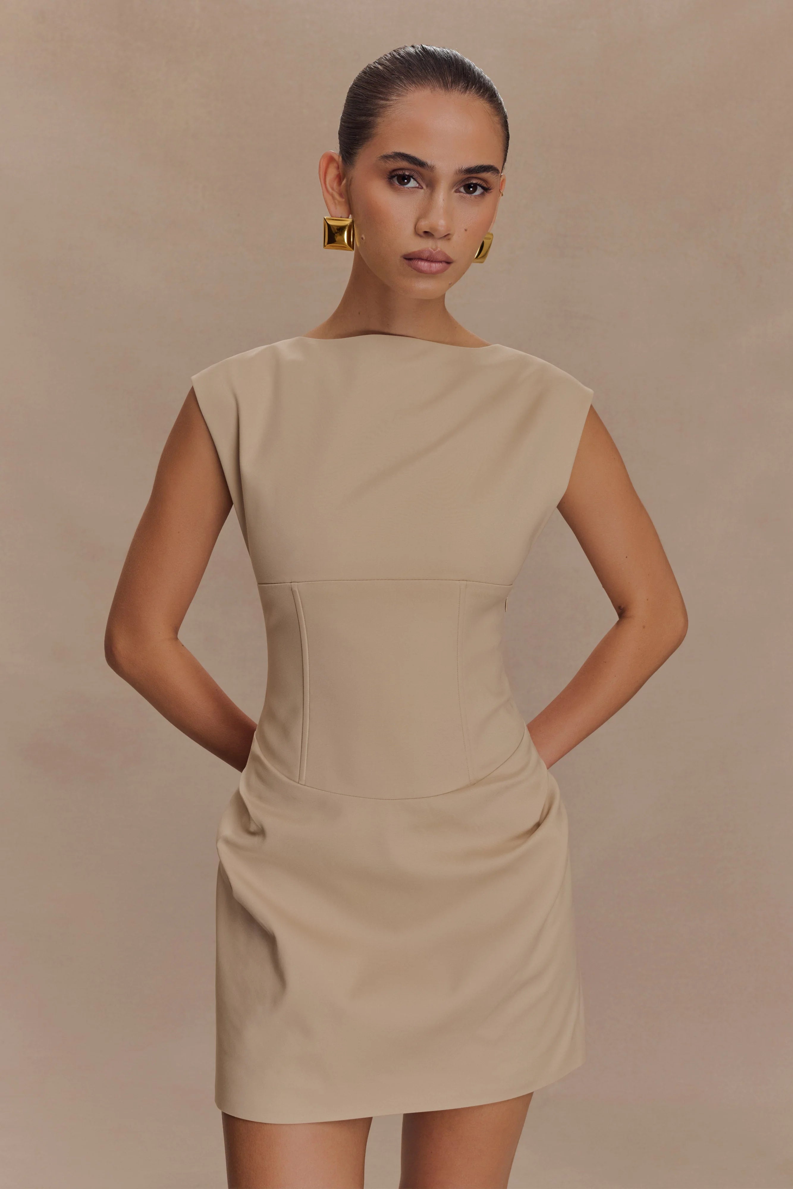 The DORIS Sleeveless Mini Dress is a fresh take on timeless tailoring, crafted for a flattering yet relaxed fit. Featuring a boat neckline and short raglan sleeves, this mini dress is defined by its underbust seam and curved low waist seam that softly shape the silhouette. Side gathers and shaping seams through the body enhance the fit, while the A-line cut adds fluidity and movement. Finished with an invisible centre back zip and unlined for a lightweight feel, this dress is the perfect blend of polish and comfort.
