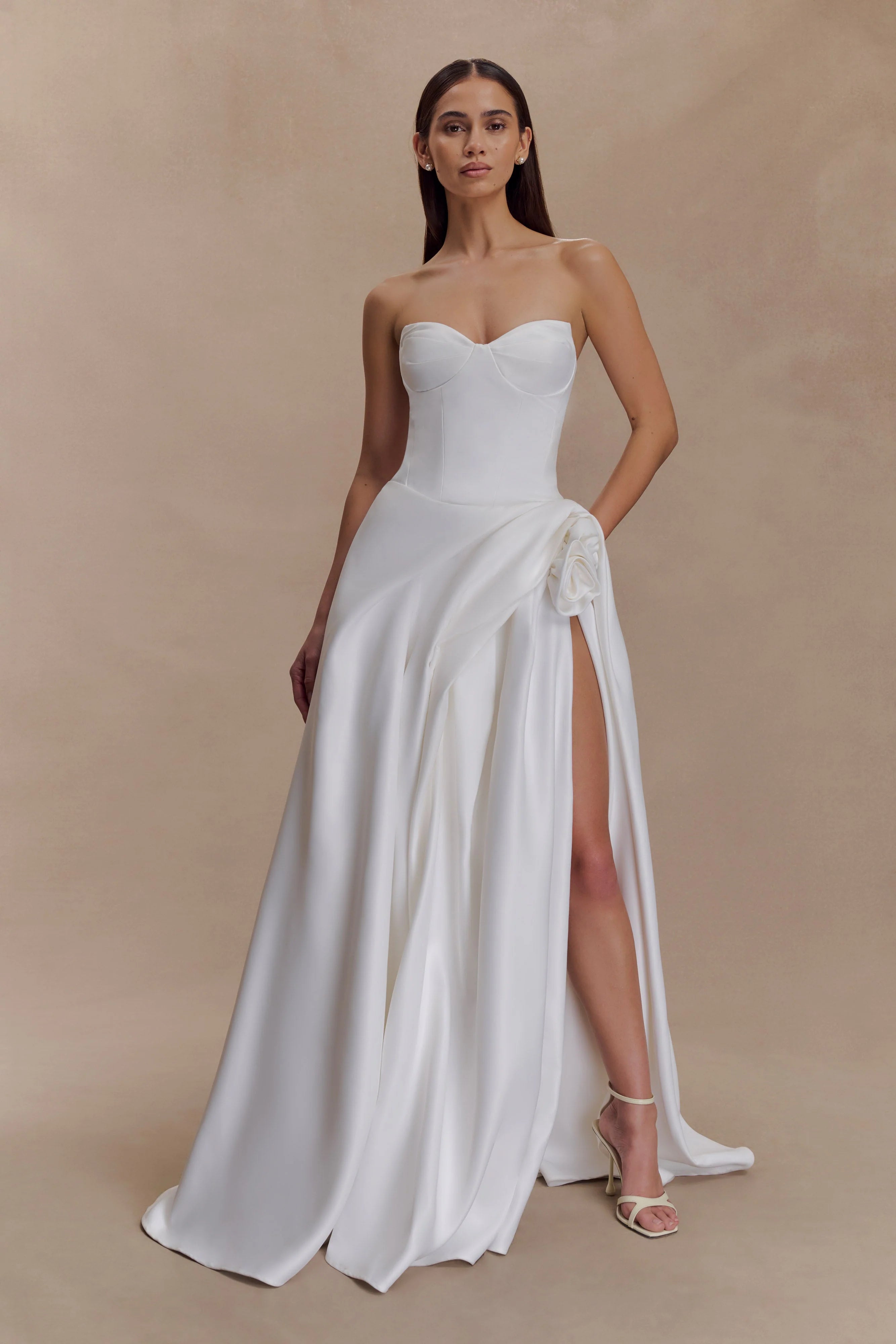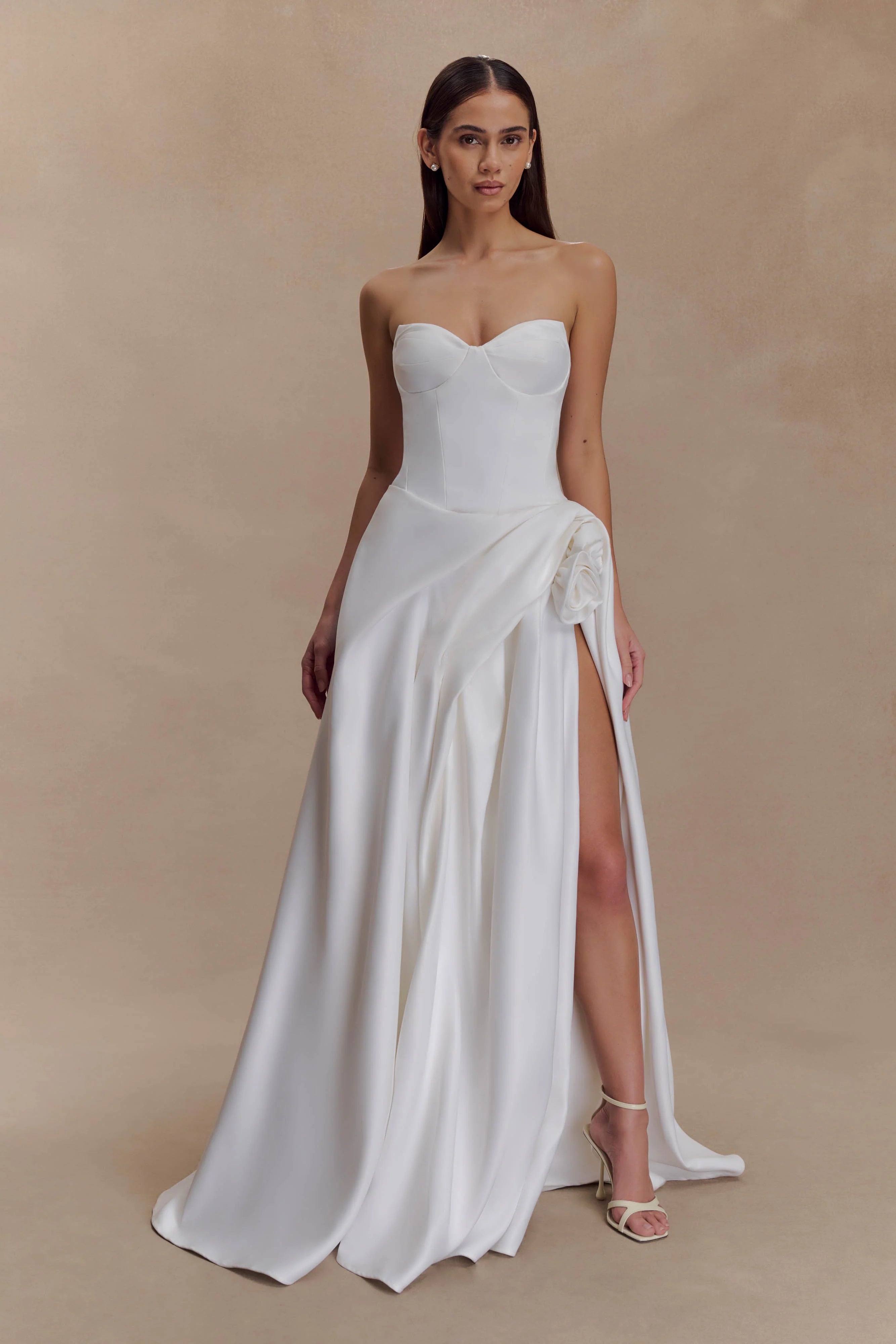 The ELIZABETH Strapless Corset Maxi Dress is the epitome of sculpted elegance. Designed with a sweetheart neckline and a fitted bodice, it features an internal corset with bust cup padding for structure, shape, and support—further secured by an internal waist stay. Fully lined for comfort, this floor-length silhouette is finished with delicate floral trim detailing, adding a romantic touch to its clean lines. Completed with an invisible zip for a seamless fit, Elizabeth is made for moments where timeless sophistication takes centre stage.