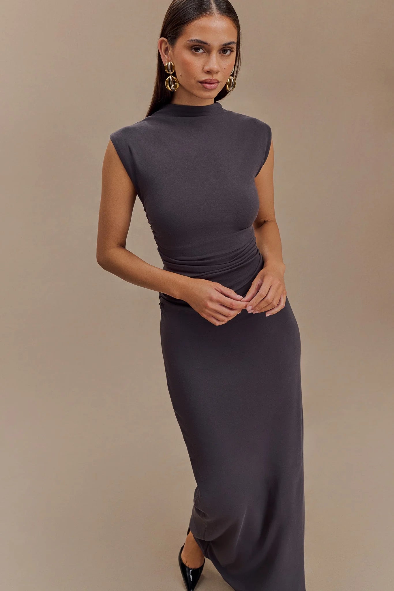 The ELLIOT High Neck Sleeveless Maxi Dress exudes effortless elegance with its refined design and sophisticated details. Featuring a high neckline and sleeveless cut, this maxi dress highlights a sleek, elongated silhouette. The ruched side details add a touch of texture and visual interest, creating a flattering fit that enhances the body's natural curves. Lined for a smooth, comfortable wear, and crafted from soft jersey fabrication, the Elliot Dress combines style with ease. With its graceful maxi length, it’s perfect for making a chic statement at any formal or special occasion.