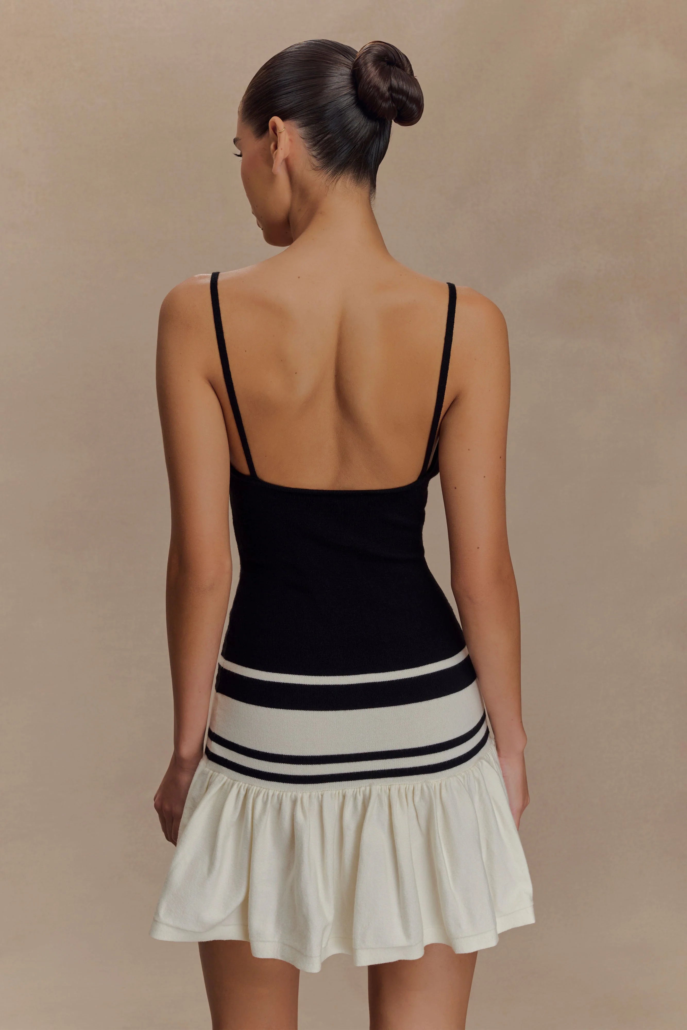 The ELLISON Contrast Knit Mini Dress is your go-to for flirty, fun styling with a modern twist. Featuring a scoop neckline and striking back cross-strap detail, this fitted silhouette hugs the body before flaring into a frilled lower skirt. Bold contrast stripe detailing adds a graphic edge, while the unlined knit keeps it light, breathable, and ready for warm-weather days. this dress is perfect for weekend plans, sunlit strolls, and everything in between.