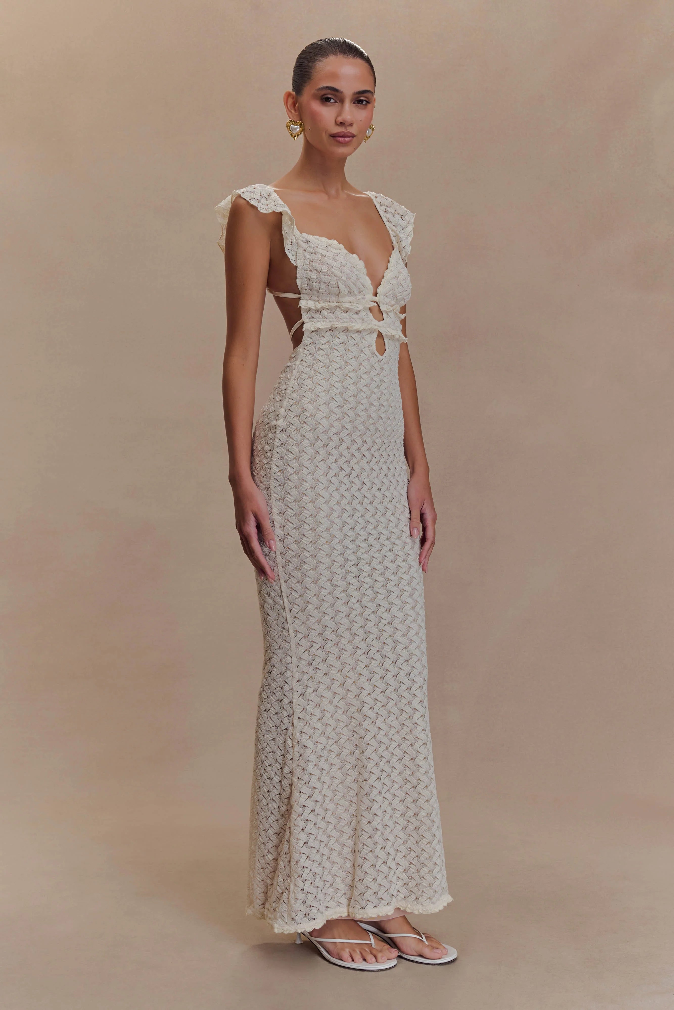 Indulge in the chic allure of the EZRA Knit Maxi Dress, a captivating piece that effortlessly blends comfort and style. The V neckline and flutter sleeves add a touch of femininity, creating a flattering silhouette. Self-ties at the back allow for a personalised fit, while the centre front keyhole adds a hint of intrigue. The dress boasts a patterned knit that exudes modern charm, and being unlined knitwear, it provides a breathable and relaxed feel.