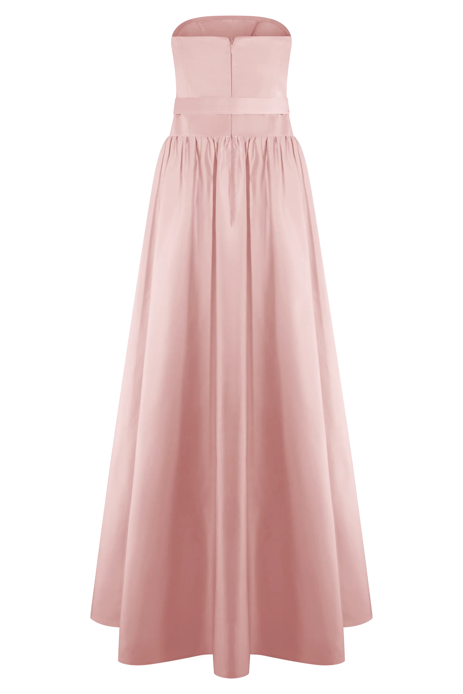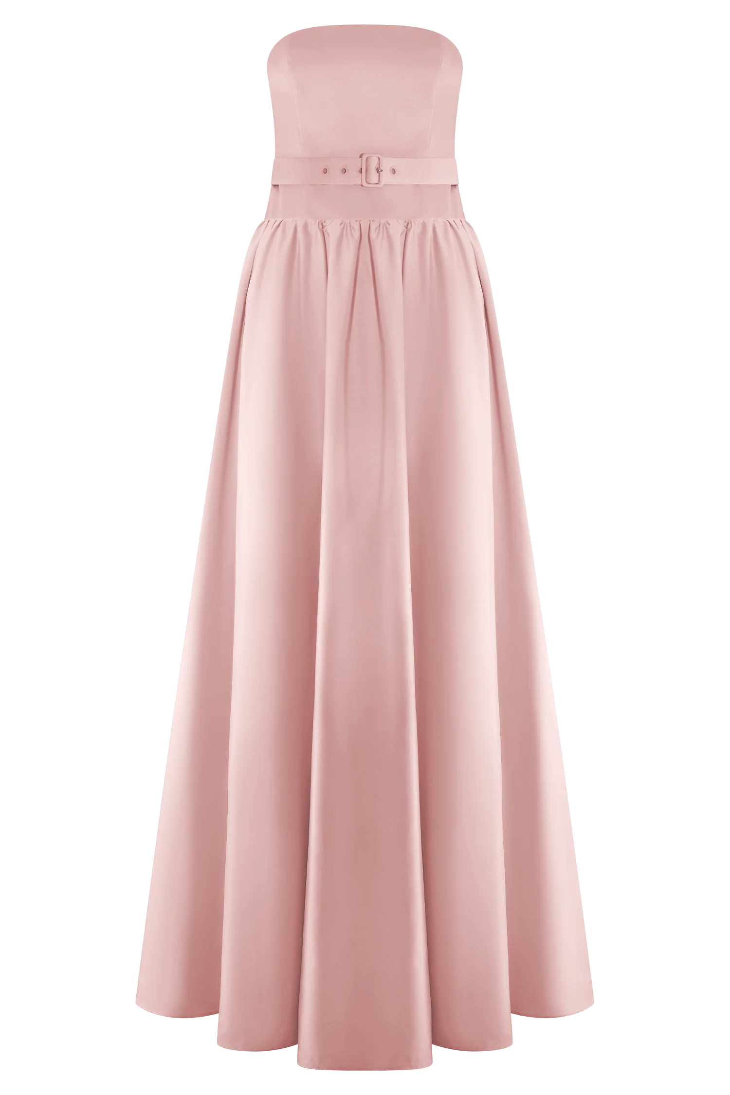 The FLORENCE Strapless Belted Maxi Dress is a timeless statement of elegance and fluidity. Designed with a sleek strapless neckline, this silhouette is cinched at the drop waist with a coordinating belt to create a flattering, elongated shape. The gathered waist flows into a voluminous full skirt, adding effortless movement and drama. Fully lined for a smooth fit, this maxi-length gown is finished with a center-back zip and hook-and-eye closure for seamless wear. Perfect for black-tie events, weddings, or special occasions, this dress embodies refined sophistication with a modern touch.