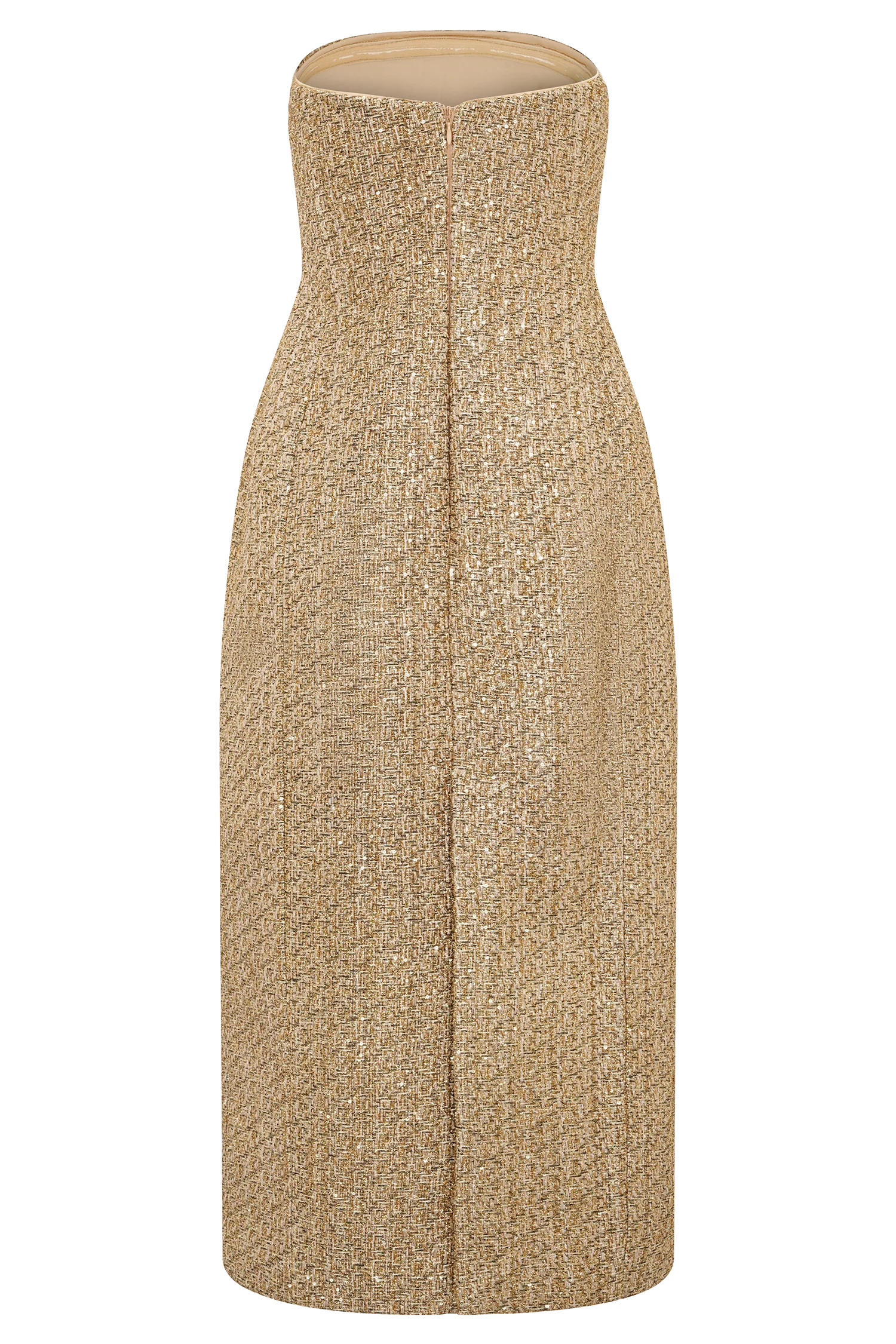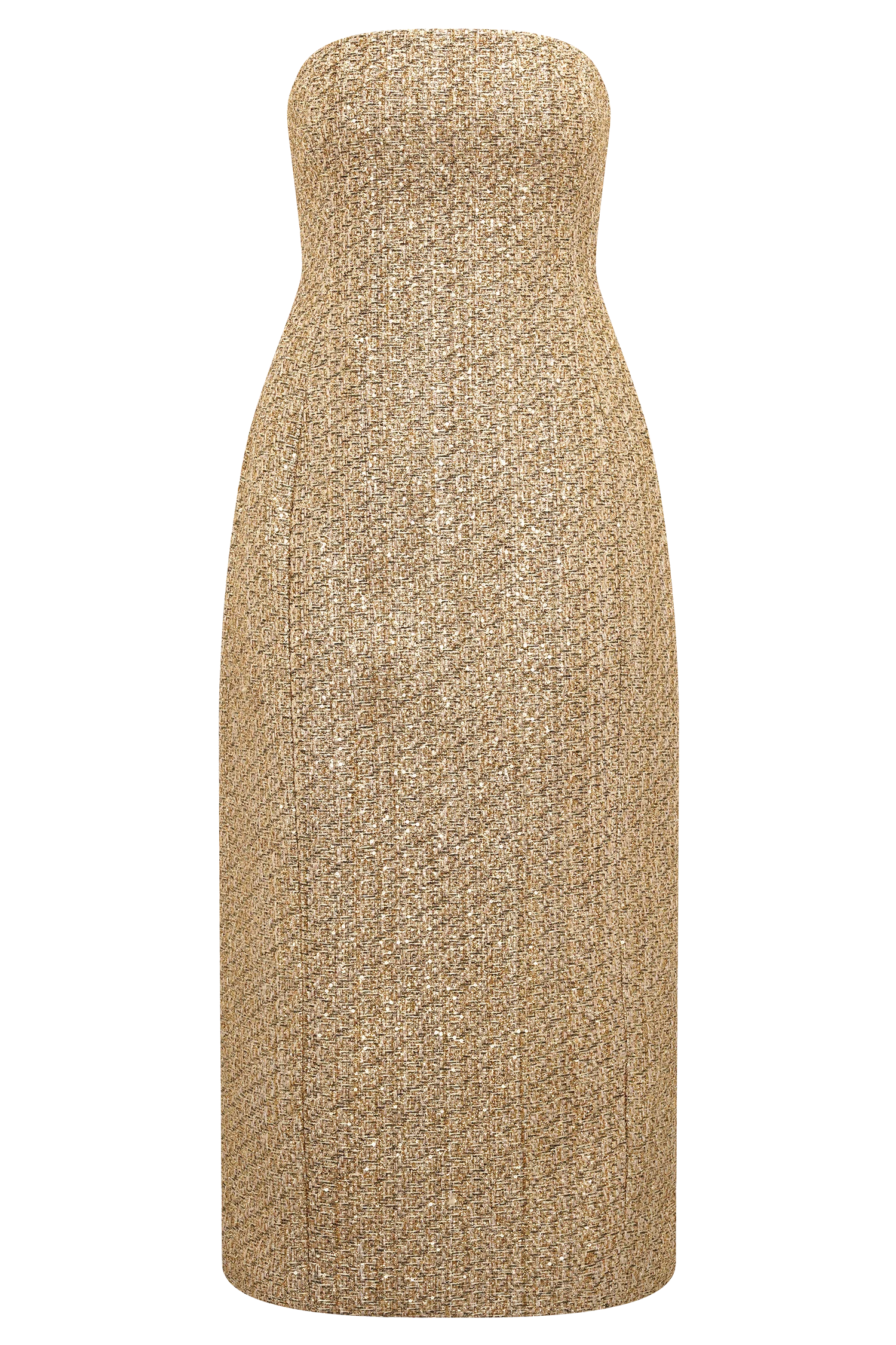 The GALA Strapless Tweed Midi Dress combines timeless tailoring with a sleek, feminine silhouette. Designed in a structured tweed fabrication, it features a strapless neckline that highlights the shoulders and neckline with refined simplicity. Fully lined for comfort and finished with an invisible centre back zip, the midi-length cut is completed by a subtle back split for ease of movement. This dress brings polish and poise to any occasion—where classic texture meets contemporary design.