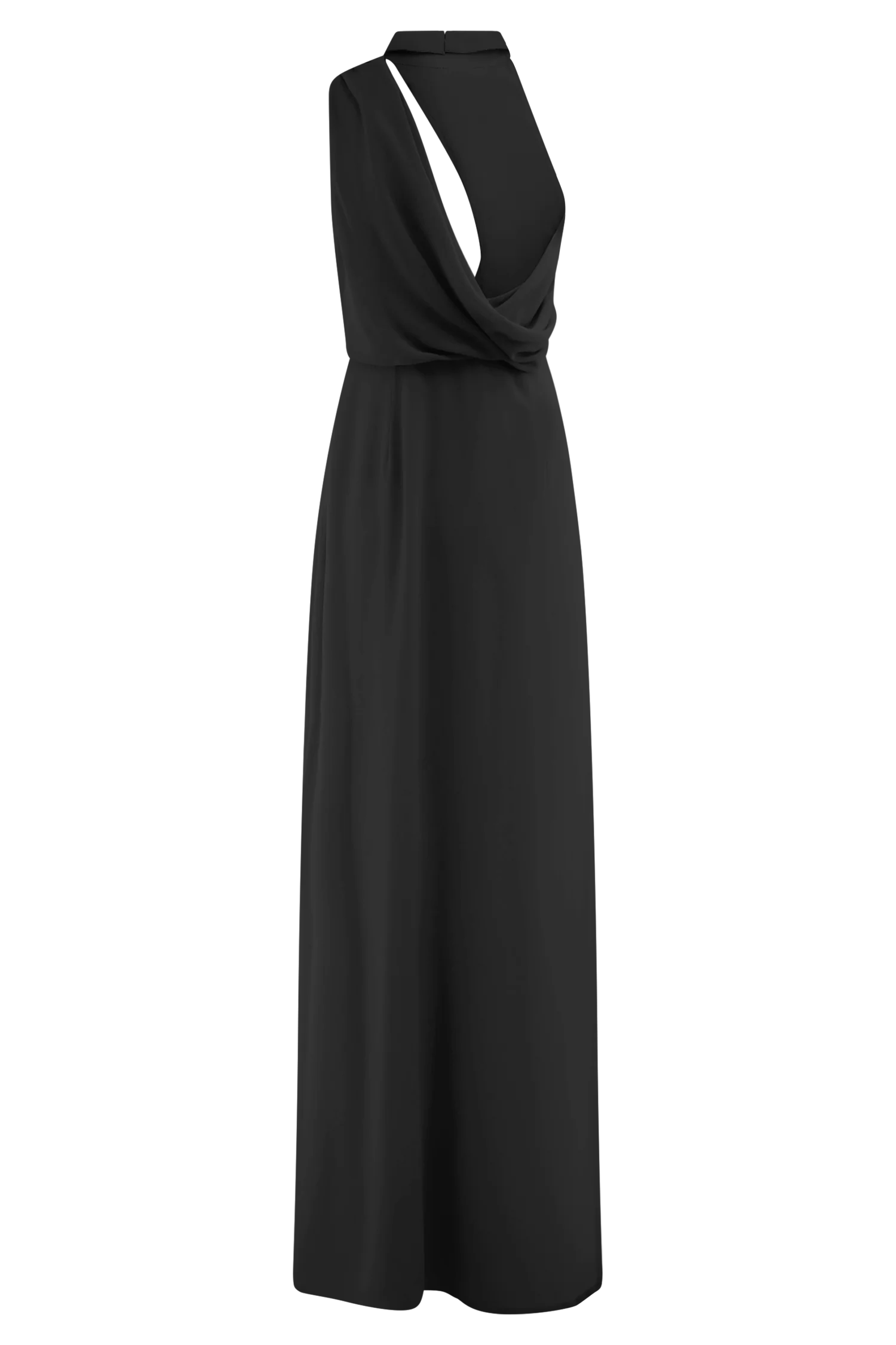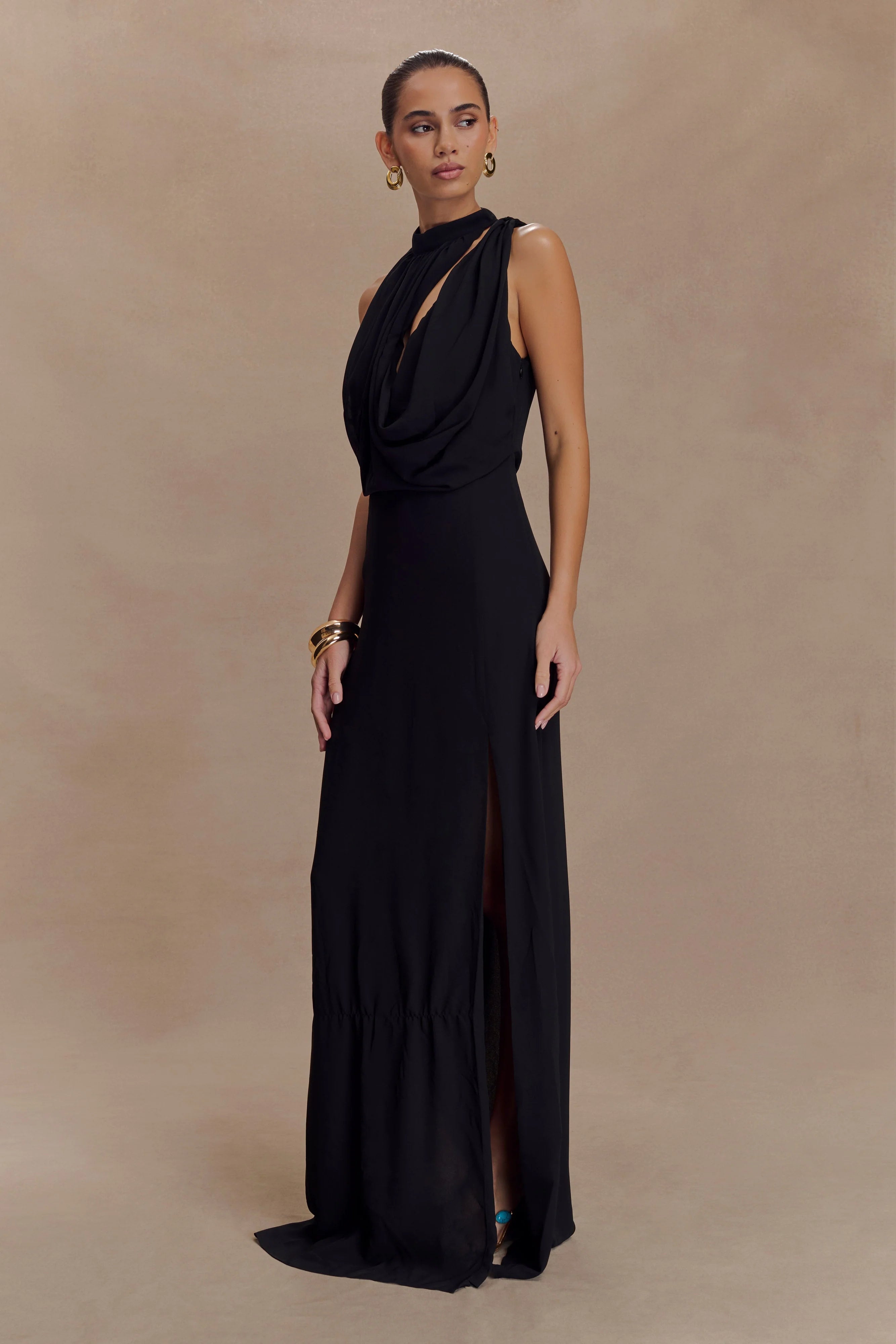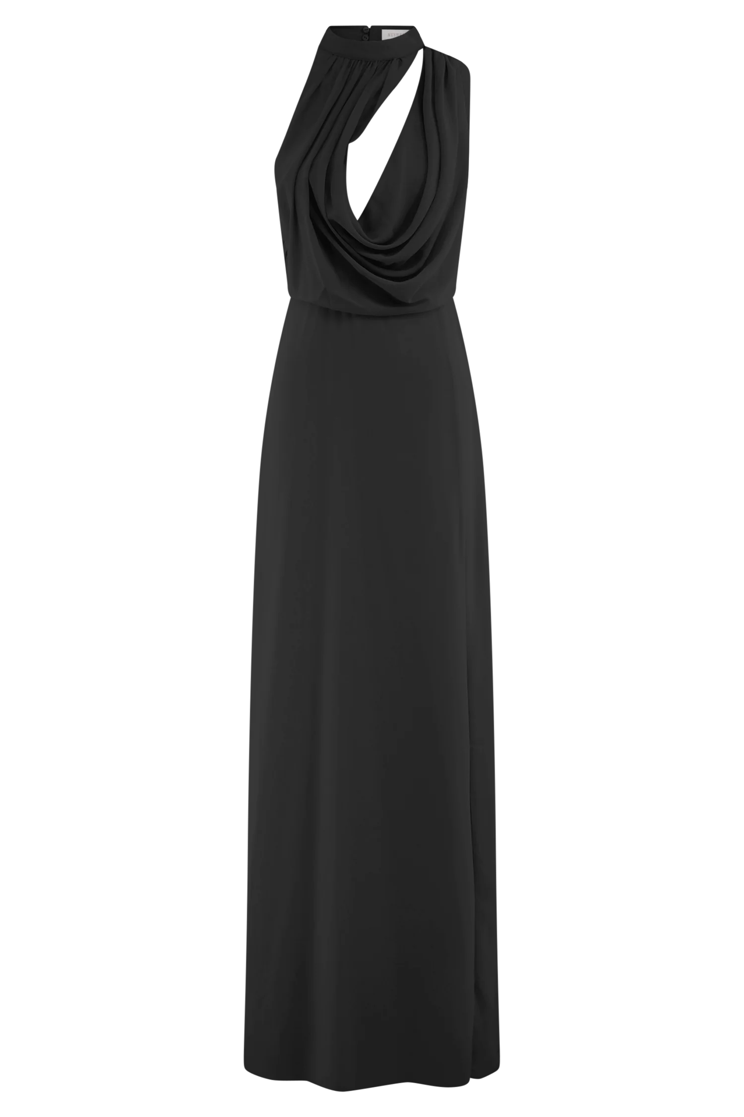 The GALIA Cowl Neck Maxi Dress is designed to captivate from every angle. Featuring a fluid halter neckline with a back draped tie and a single shoulder strap, this silhouette blends elegance with modern edge. The asymmetric draped back adds soft movement, while the high leg split brings a sultry touch. Cut in a flattering A-line shape with a maxi length, and finished with an invisible side zip, this dress is unlined for a lightweight feel that is perfect for warm nights and statement moments.