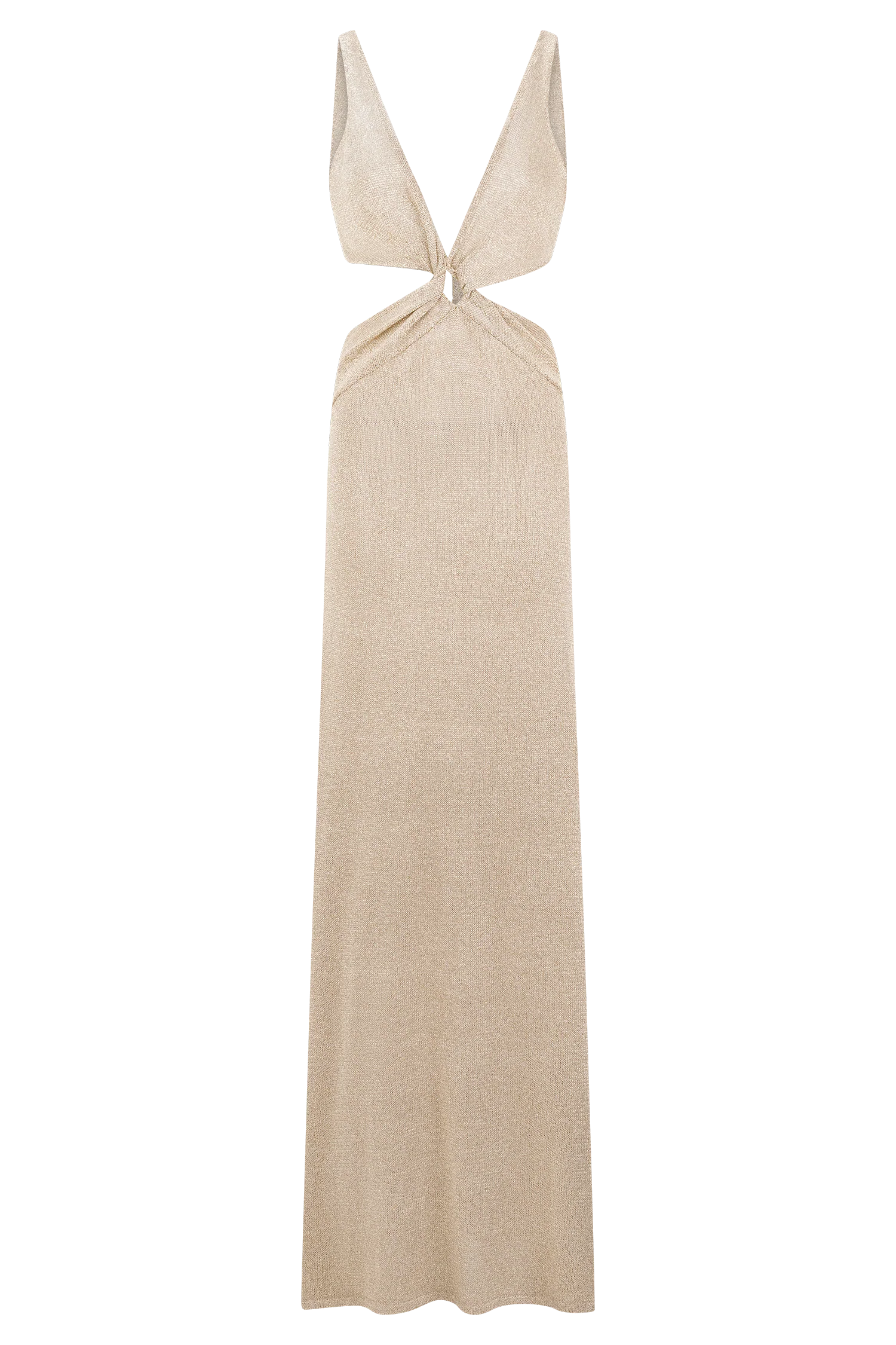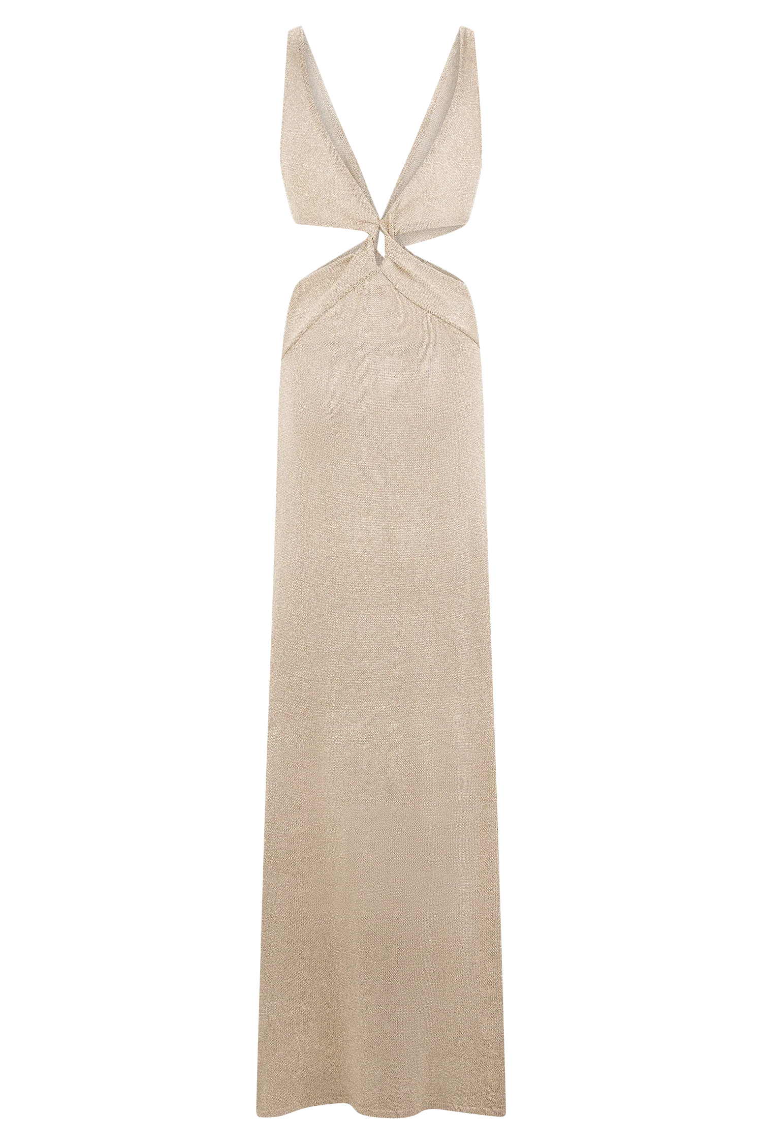The GRACELYN Twisted Metallic Knit Maxi Dress is designed to make a bold, unforgettable entrance. Featuring a deep plunge neckline and low open back, this statement silhouette is elevated with front and back twist detailing and waist cutouts that sculpt and define. Crafted from shimmering metallic yarn, the unlined knit hugs the body with a soft stretch and a straight skirt shape that elongates the figure. Perfect for after-dark events, sunset soirees, or any occasion where all eyes are on you.