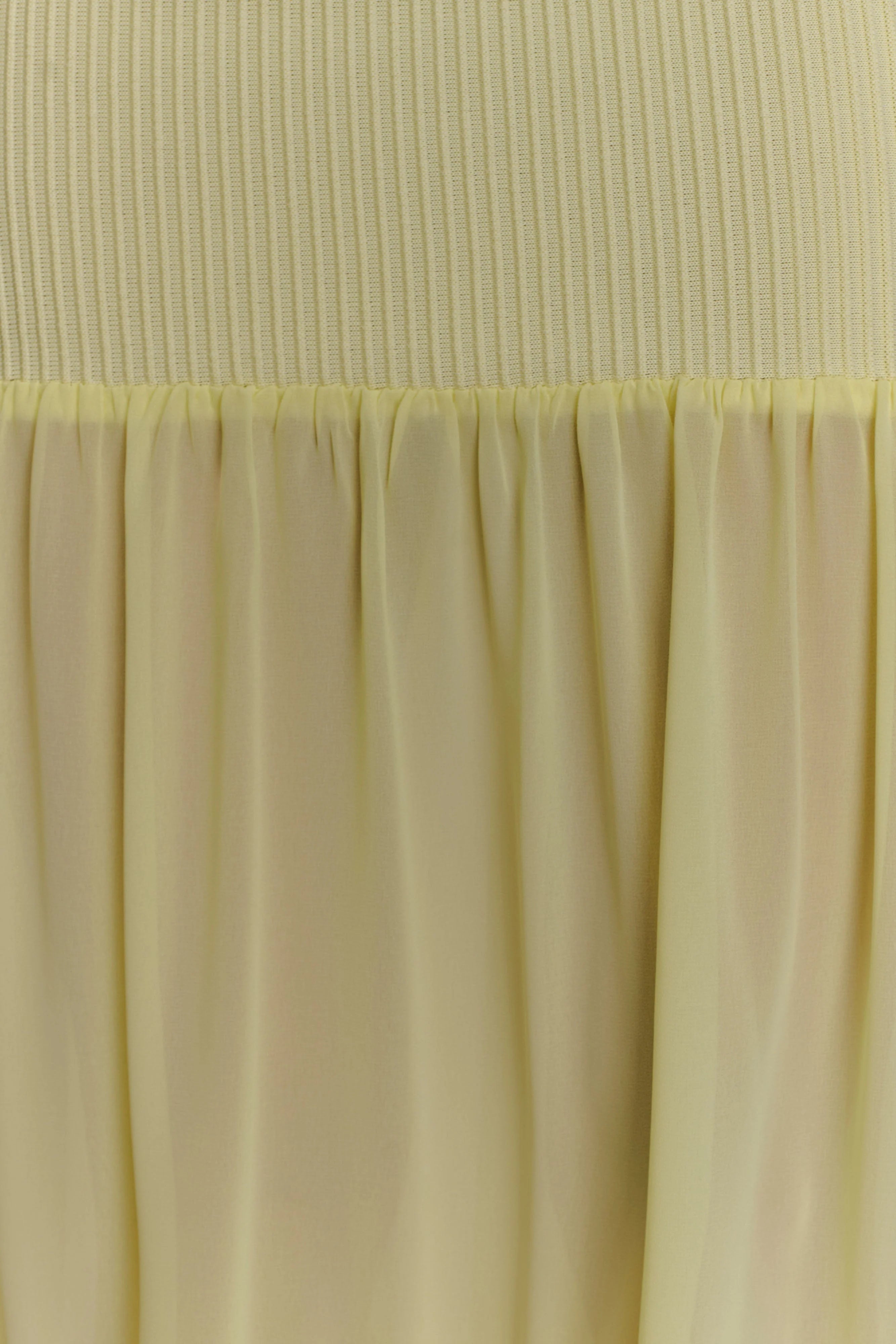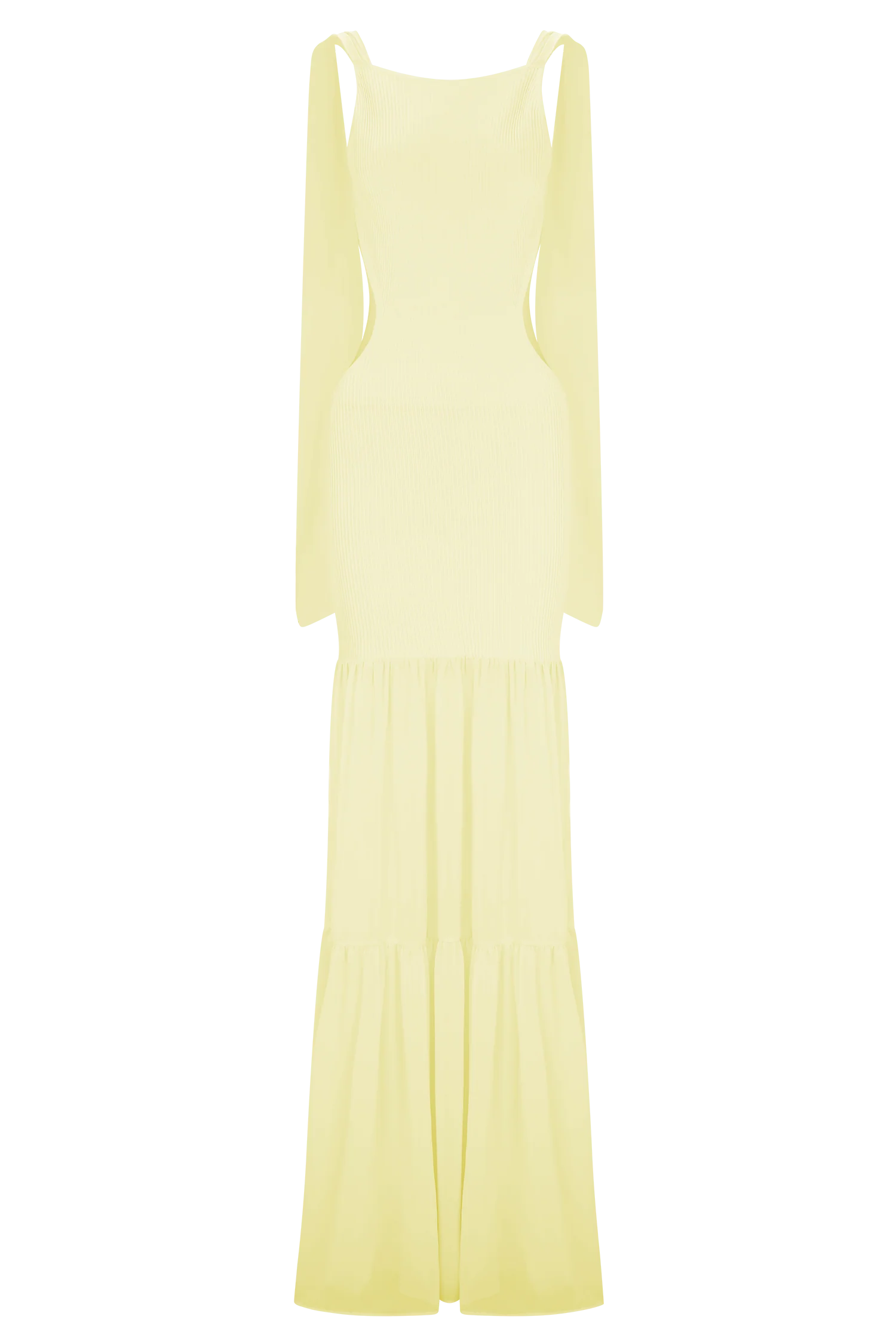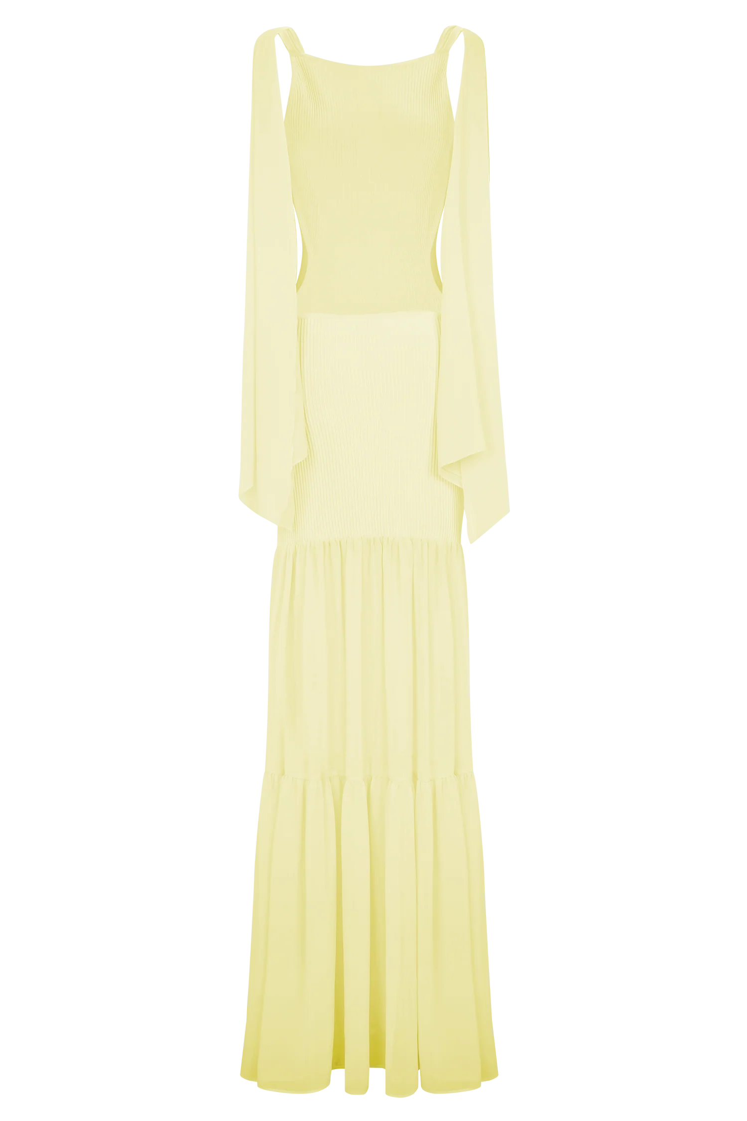 The HAILLE Knit Chiffon Maxi Dress blends contemporary texture with romantic fluidity. A ribbed knit bodice creates a sculpted silhouette, balanced by side waist cutouts and an airy open back. The boat neckline is accented with a chiffon shoulder scarf that drapes effortlessly, adding softness to the structure. Finished with a tiered chiffon skirt that flows with every step, this dress is made for movement—from daylight affairs to twilight celebrations.