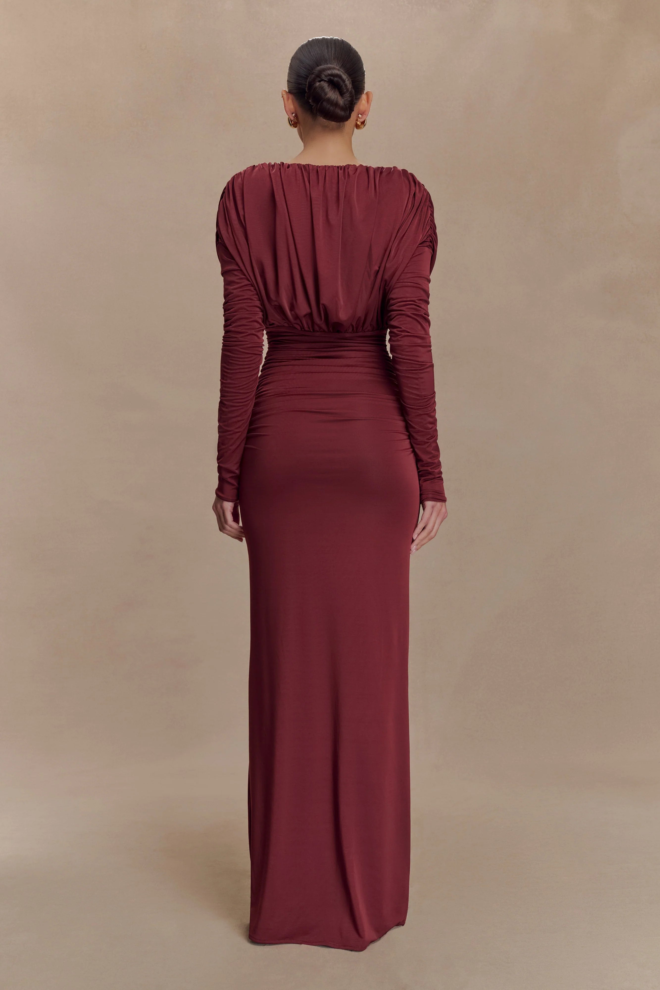 The HAYDEN Long Sleeve Plunge Maxi Dress is a masterclass in modern sophistication. Designed with a daring deep V-plunge neckline and sharp shoulder pads for structure, this maxi silhouette balances boldness with fluid ease. The gathered waist detail softly defines your shape, while the full lining ensures a smooth finish. With long sleeves and a relaxed fit, this dress is your go-to for statement evenings with a touch of nonchalance.