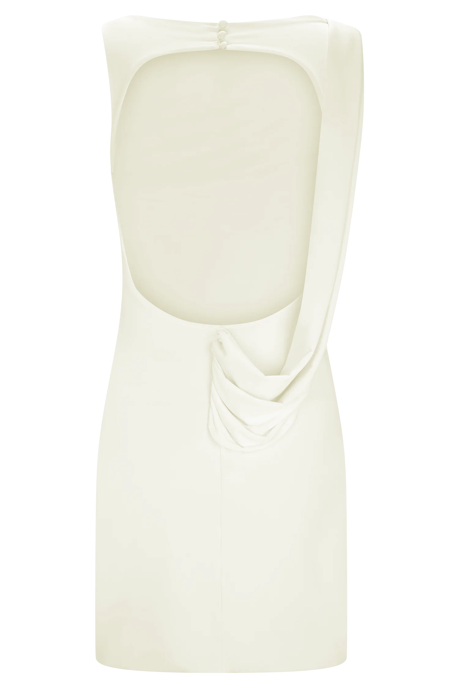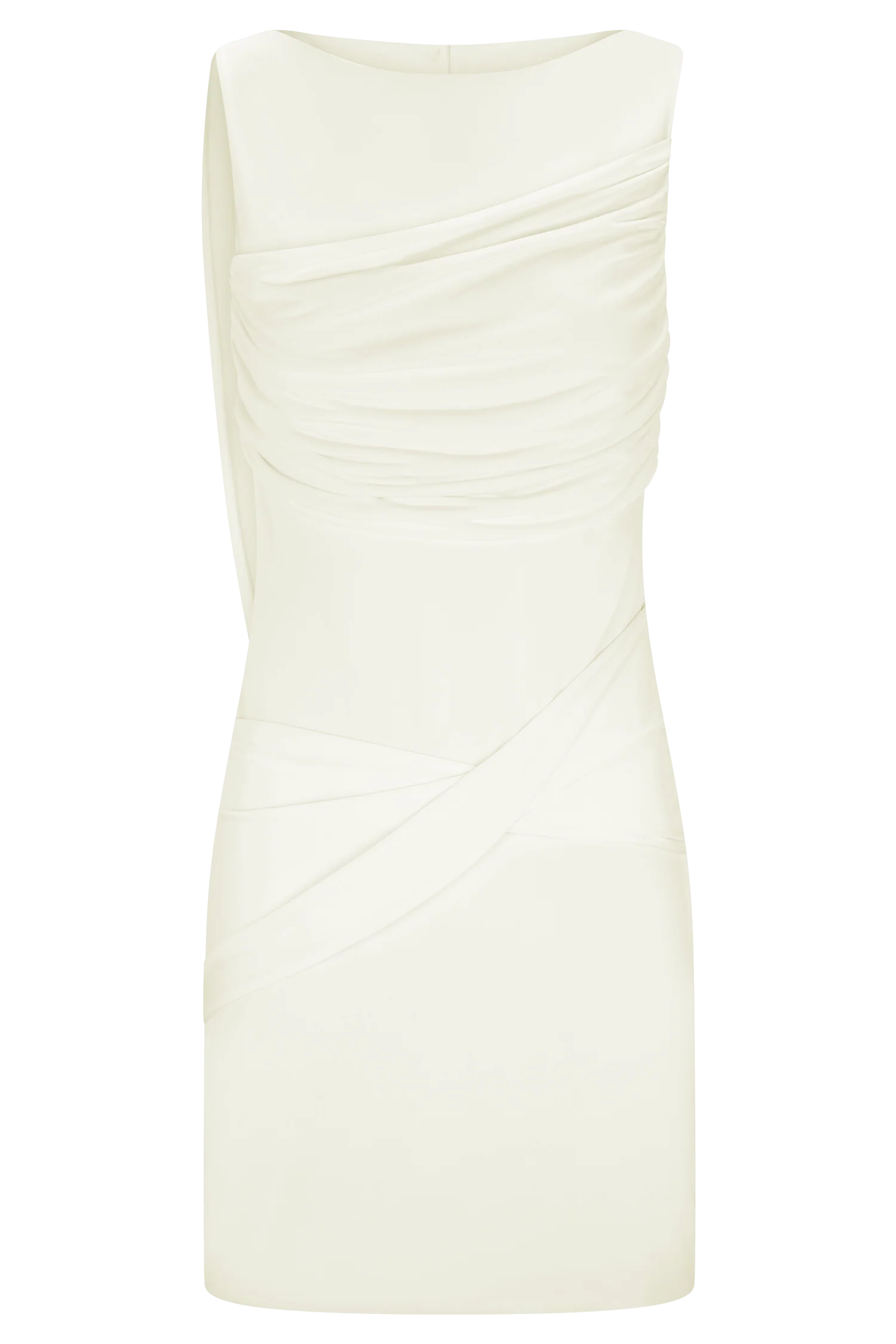 The HENLEY Slinky Drape Mini Dress is designed with refined movement and modern detail. Featuring a clean boat neckline, it opens into a low back secured with a delicate button closure. Draped overlays cascade across the bust and waist, flowing into a tie detail that falls elegantly from the right shoulder. Cut to a bodycon fit and mini length, this dress balances sculptural shaping with fluid lines for a sleek, statement finish.