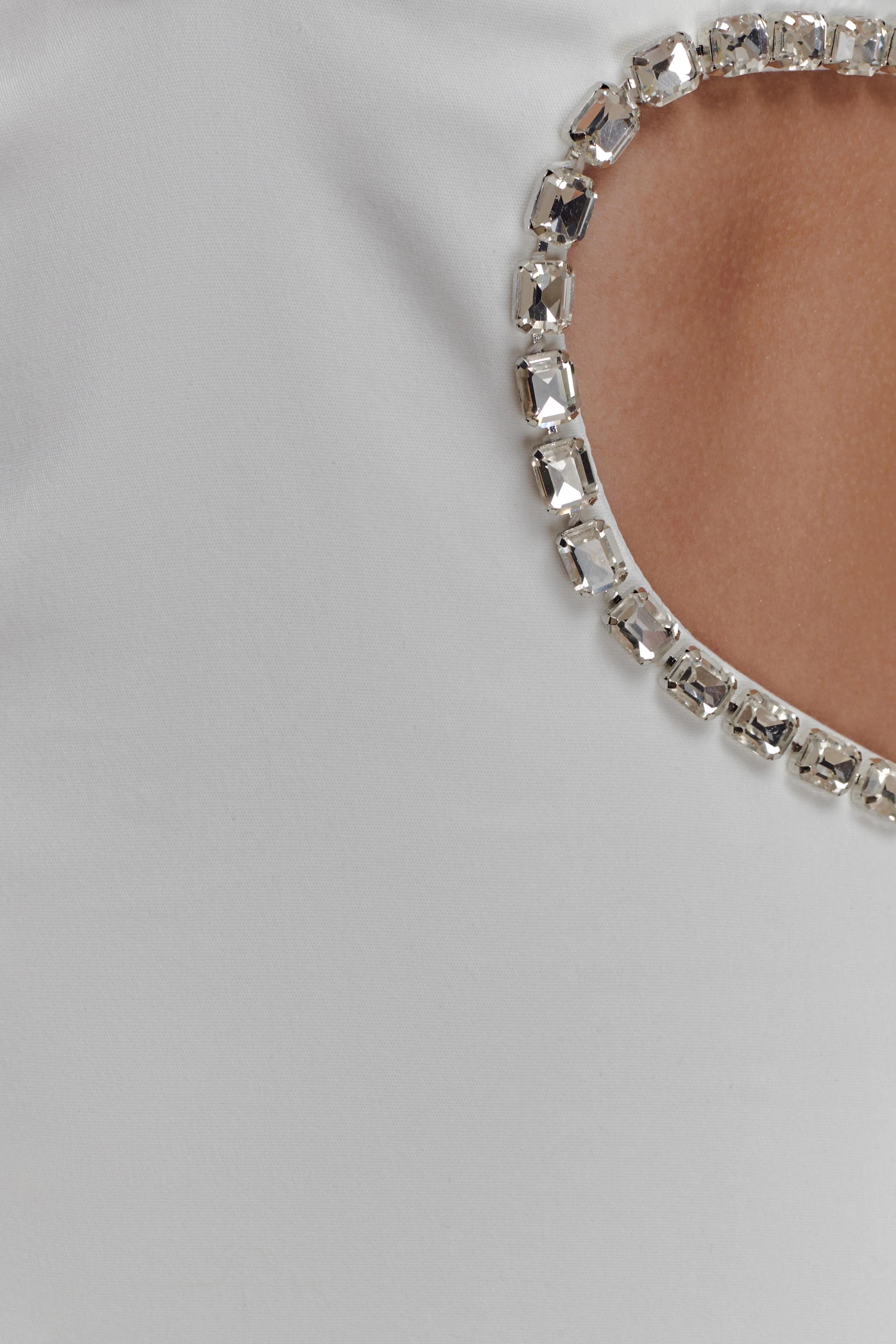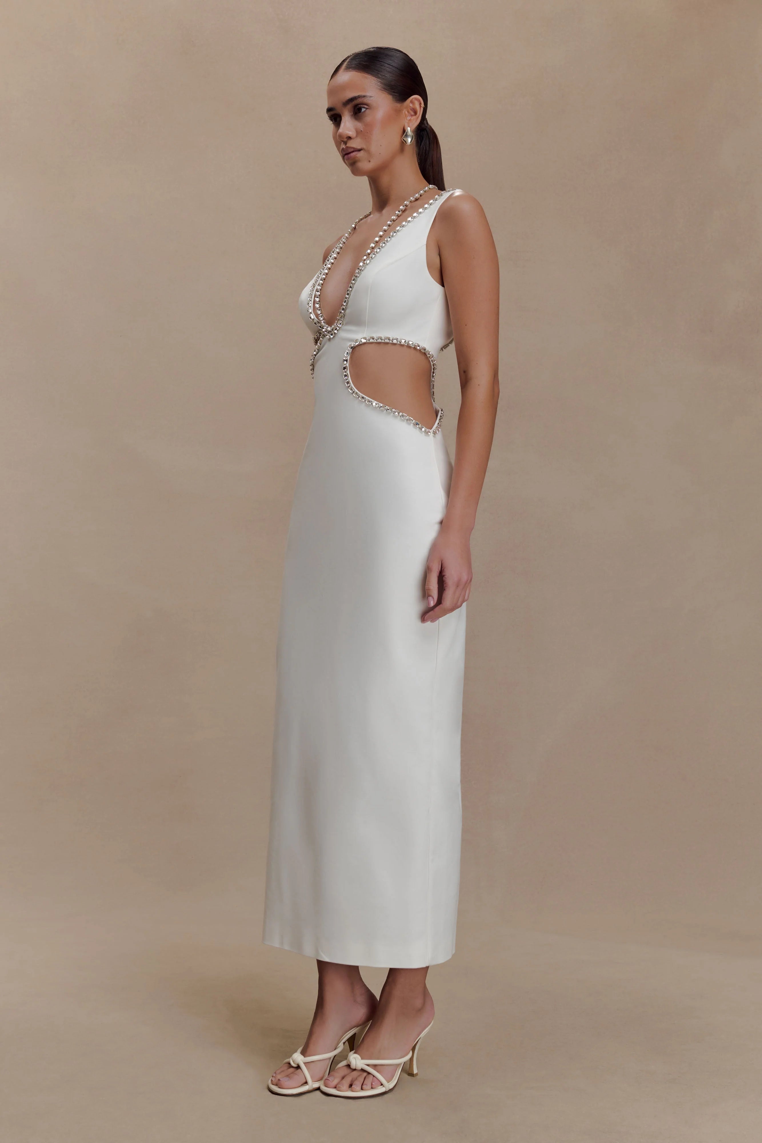 The HENNY Diamante Trim Cut Out Midi Dress is a statement silhouette designed for after-dark impact. Featuring a low V neckline framed by a diamante-trimmed necklace that connects elegantly at the bust, it adds a refined sparkle to the look. Waist cut-out details accentuate the figure, while the fitted shape and centre back split create balance and movement. Finished with an invisible back zip for a seamless closure and cut to a midi length, this dress embodies modern glamour with a bold edge.