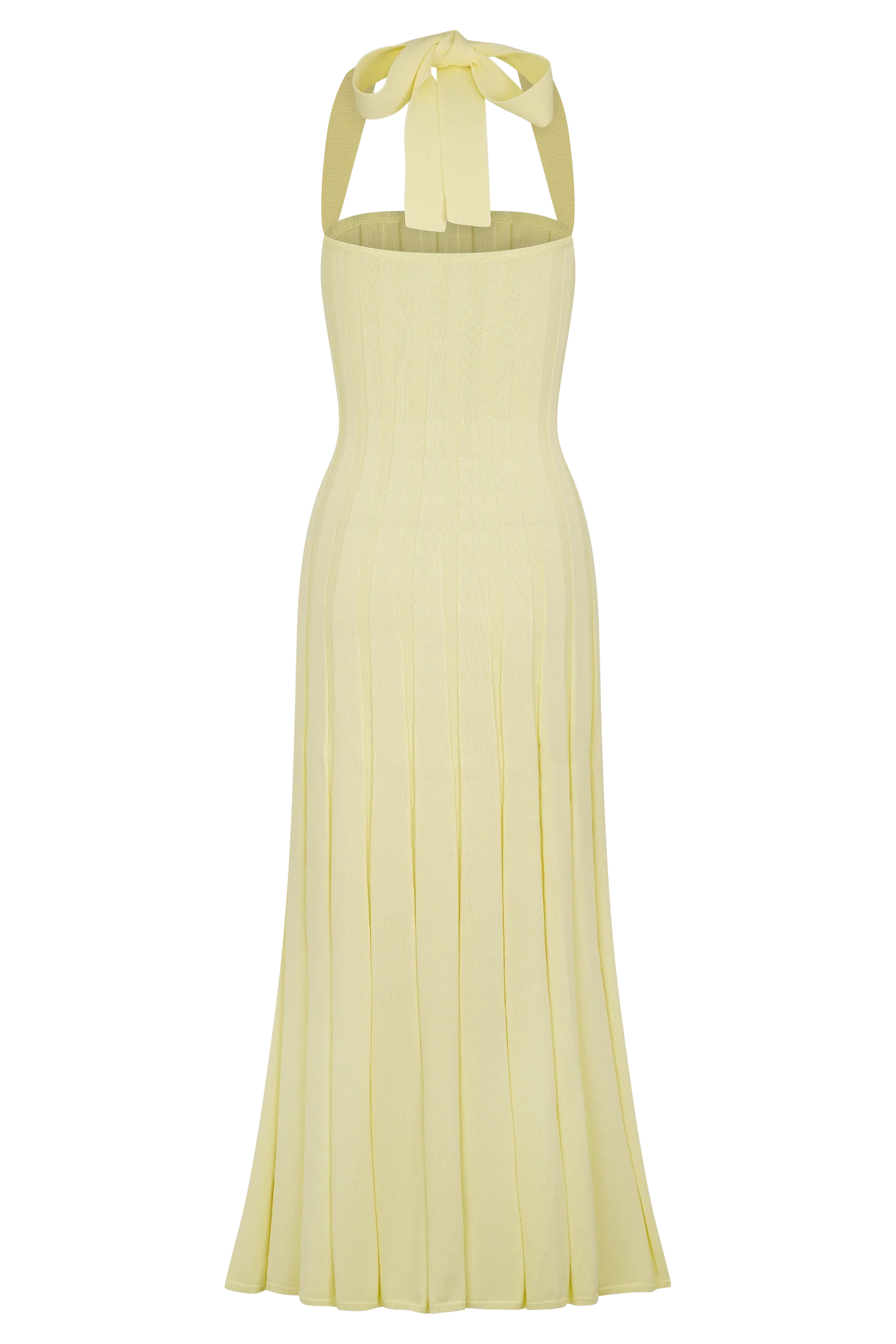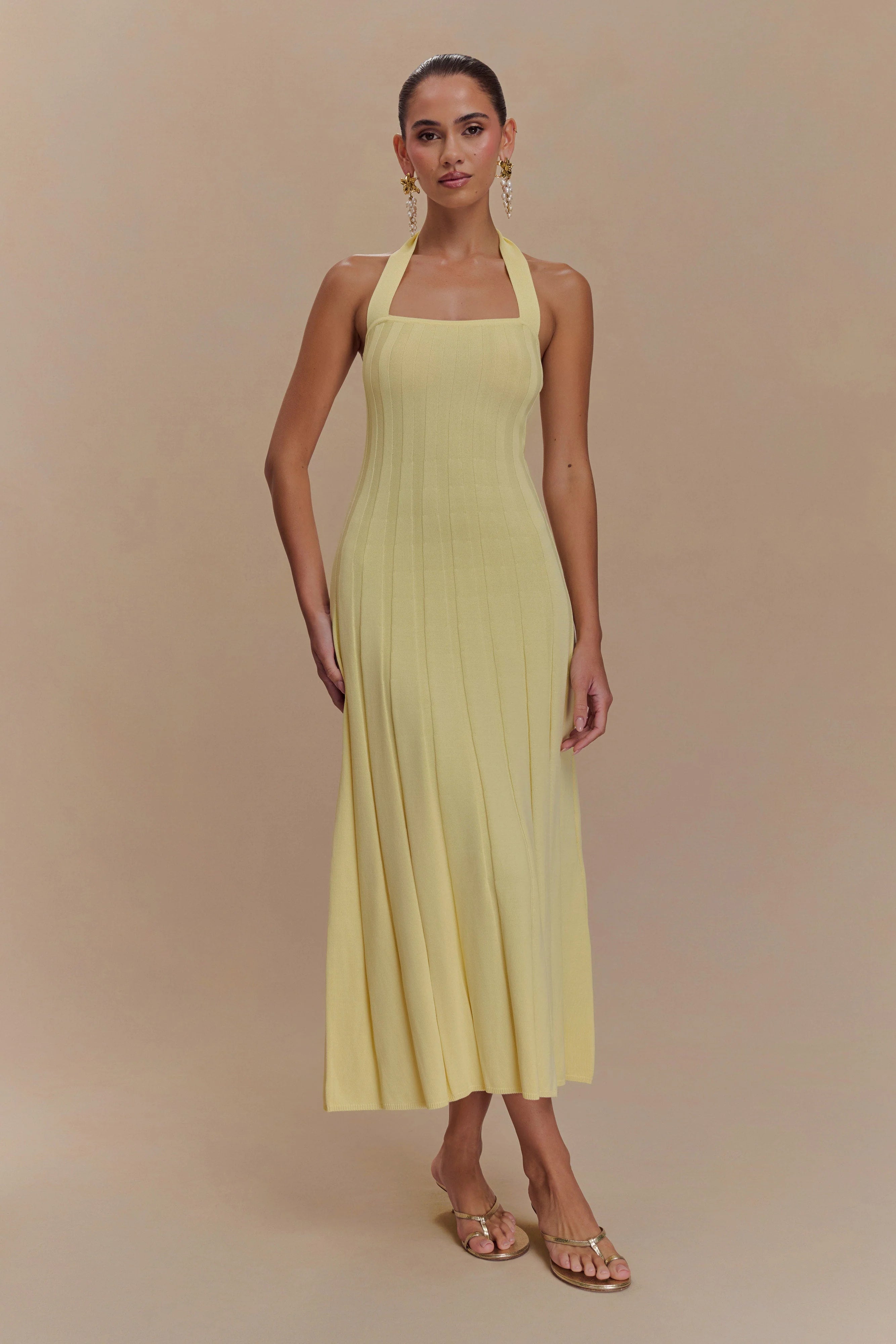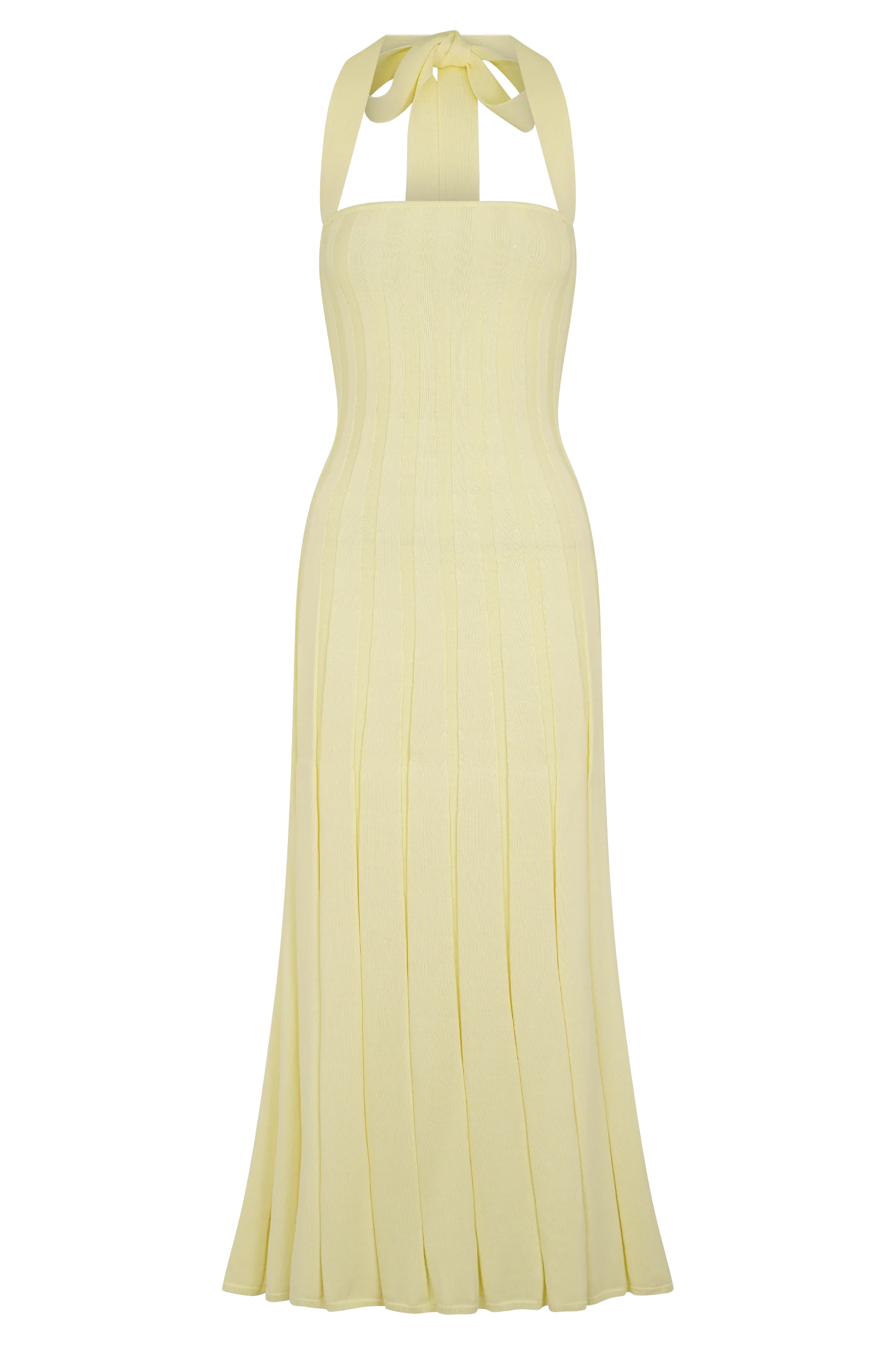 The JACQUI Halter Knit Midi Dress is a refined blend of modern simplicity and feminine charm. Designed with a sleek halter neckline, this dress beautifully elongates the silhouette while offering a timeless, sophisticated look. The ribbed knit fabric provides a figure-hugging fit, while the pleated hem detail adds movement and texture for an elevated finish. Unlined for a lightweight feel, this midi-length dress is perfect for both casual and dressy occasions.
