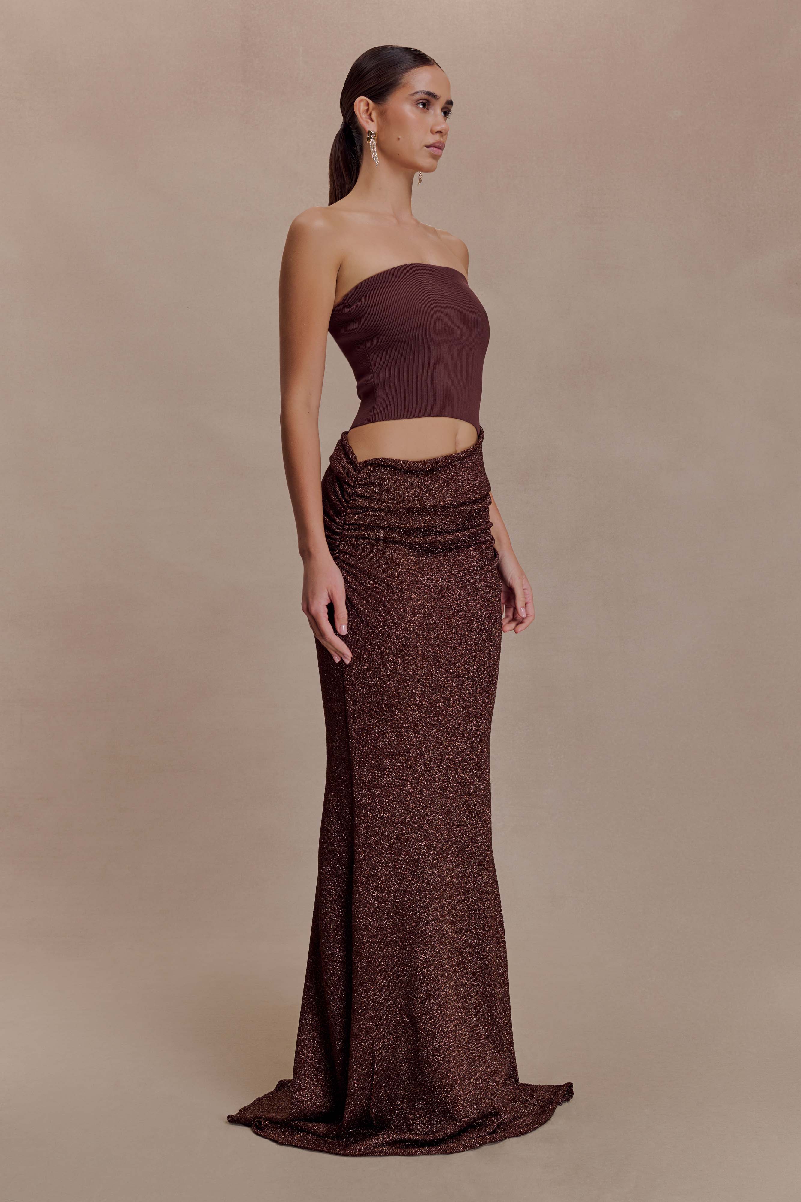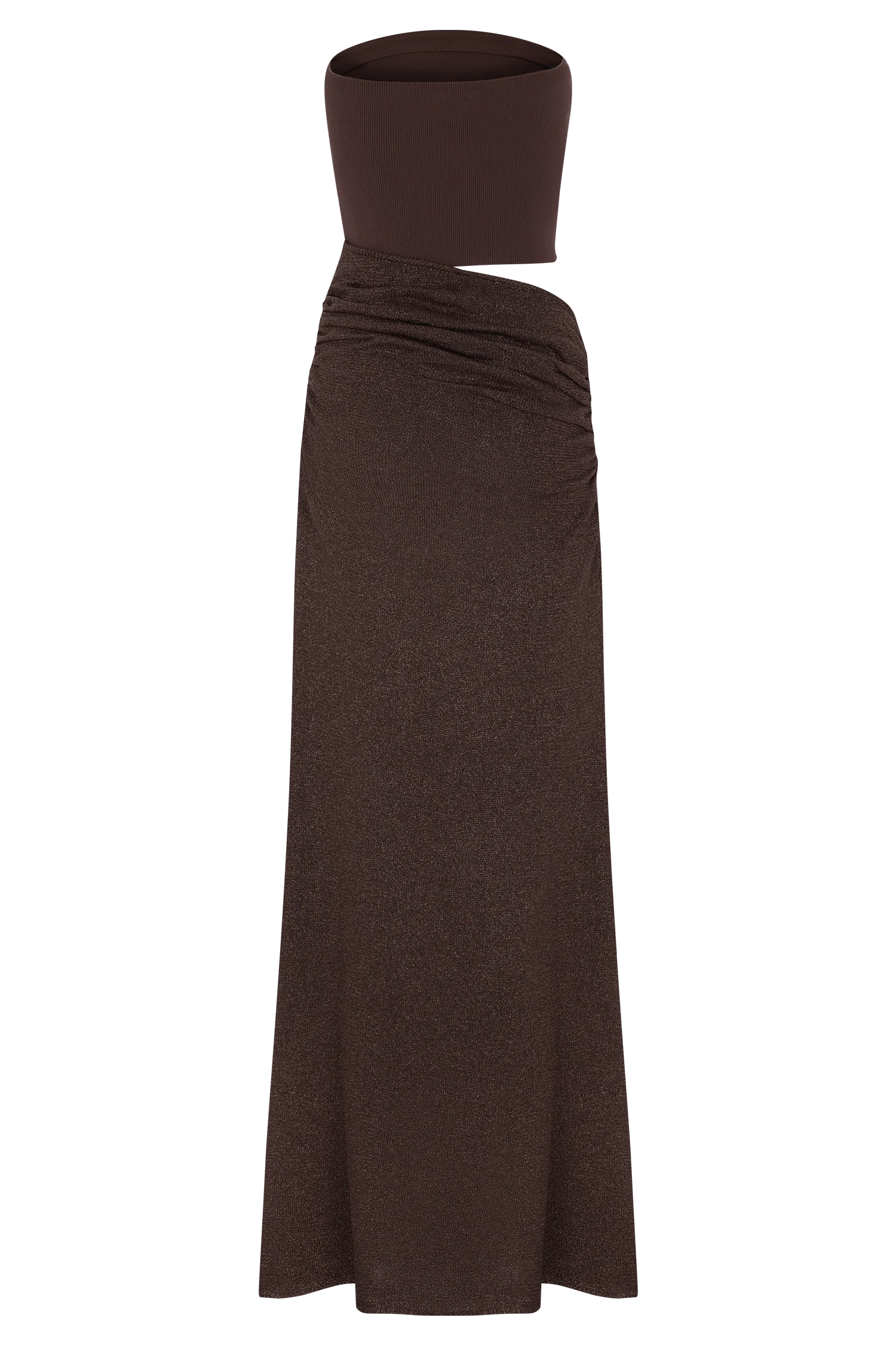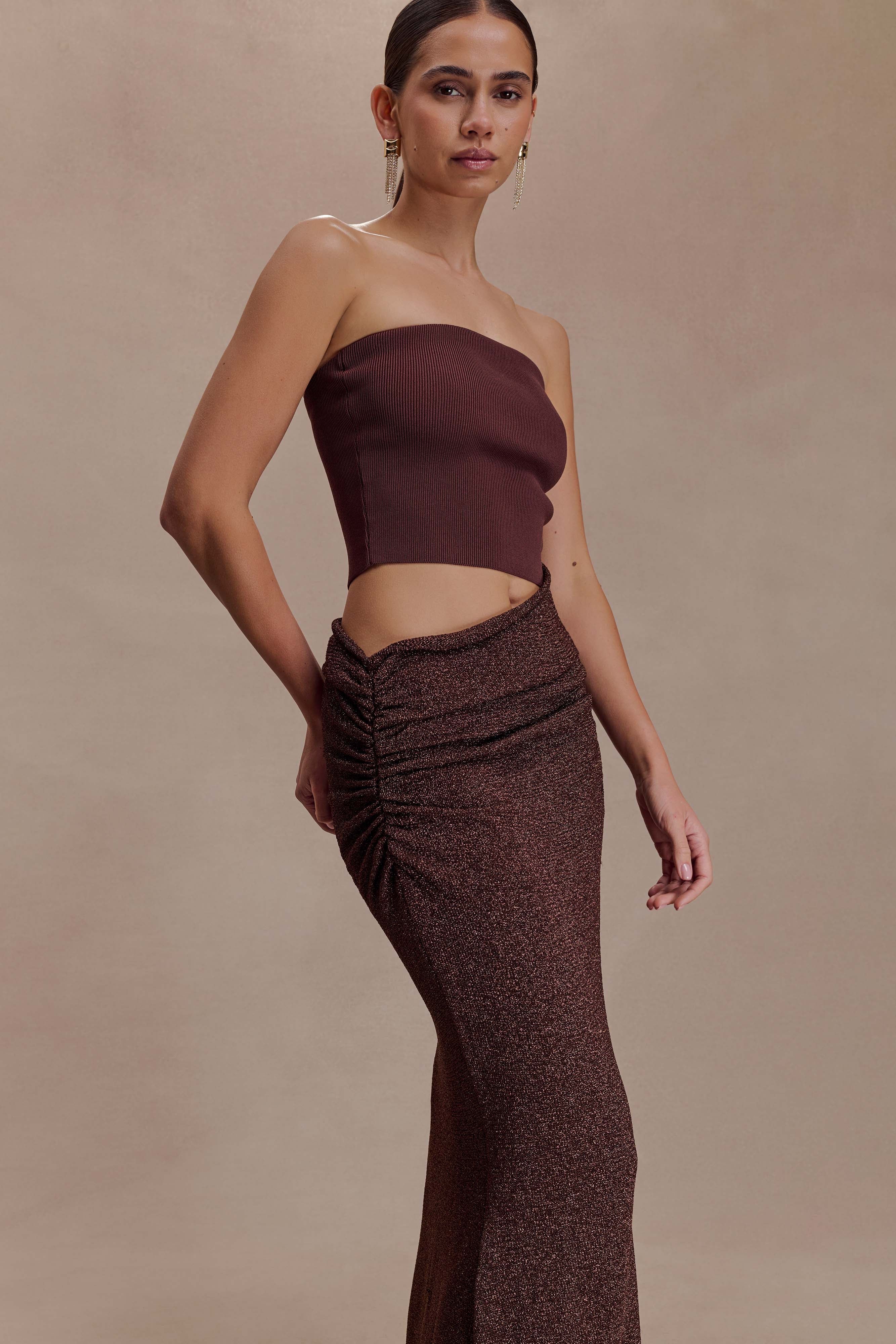 The JASIEL Strapless Knit Maxi Dress is designed to flatter with effortless ease. Featuring a fitted strapless bodice and a contrast knit skirt, this unlined maxi dress is elevated by an asymmetrical waistline and gathered hip detailing that enhances the body’s natural curves. The fishtail hem adds graceful movement, making this piece perfect for warm evenings, coastal escapes, or elevated everyday dressing with a refined twist.