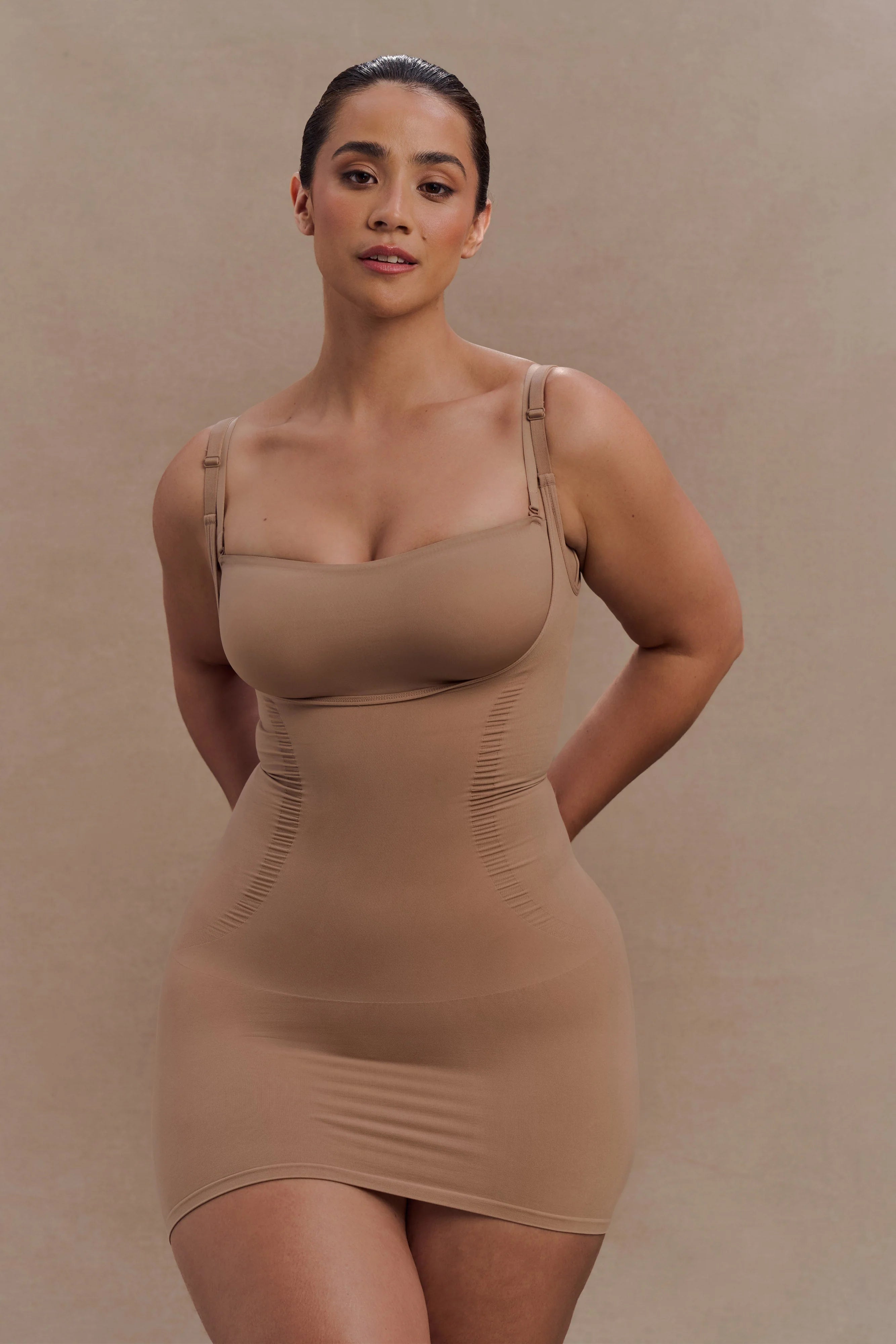 The JOCELYN Backless Shapewear Mini Dress is designed to shape, smooth, and enhance with barely-there support. Crafted from high-compression seamless fabric, this figure-defining piece offers extra sculpting at the waist and stomach to flatten and contour. The open bust neckline allows you to wear your preferred bra, while elastic adjustable straps ensure a secure, customizable fit. Light butt support subtly lifts and enhances your curves, making this the ultimate shapewear essential for backless and body-hugging looks.
