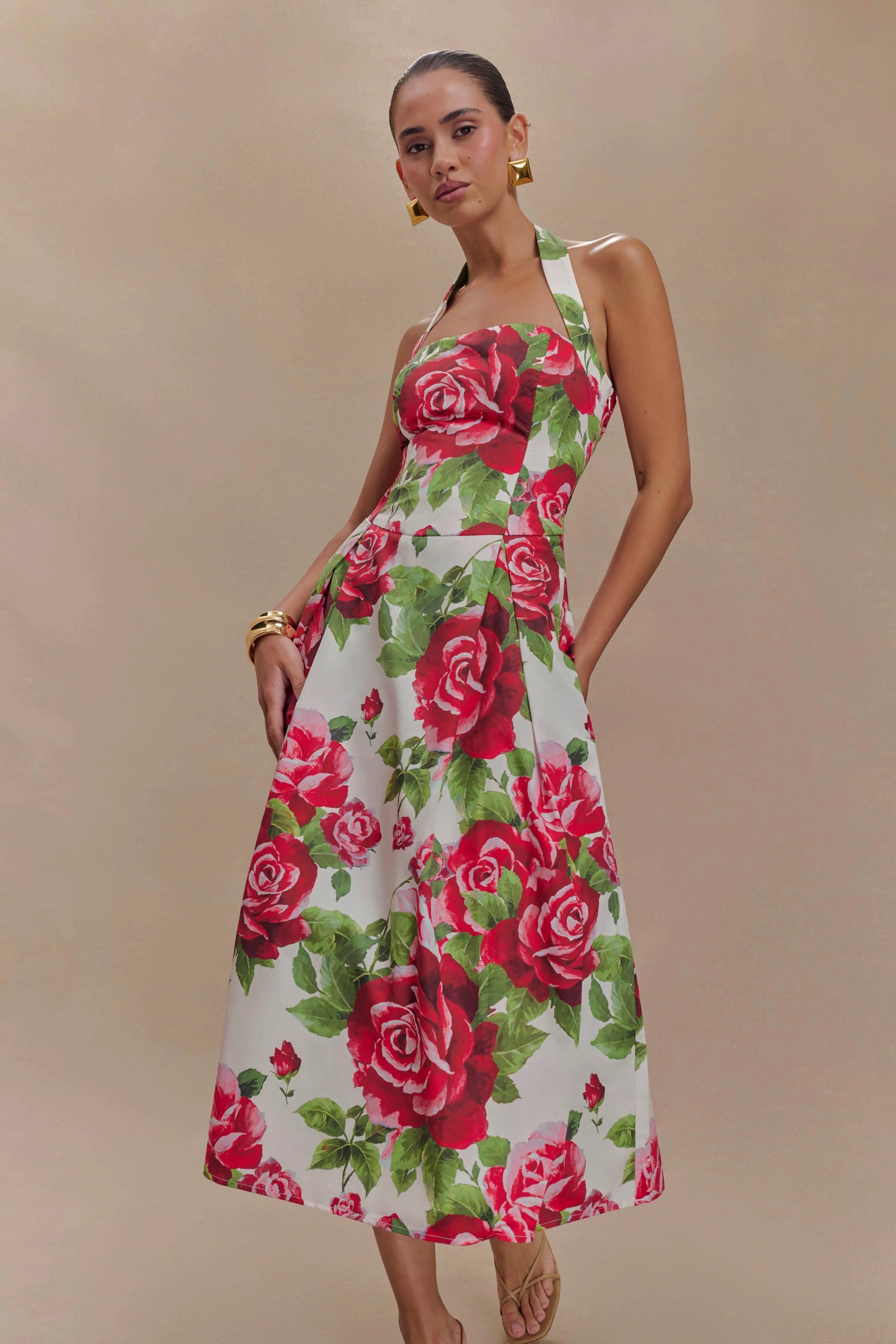 Step into timeless sophistication with the JUANA Halter Midi Dress, a graceful design that exudes femininity. Featuring a flattering halter neckline and a rounded waistline, this dress beautifully highlights your silhouette. The front and back skirt pleats add movement and texture, enhancing its refined charm. Designed in a chic midi length with a discreet side zip for easy wear, this dress is perfect for weddings, soirées, or any occasion where effortless elegance is key.