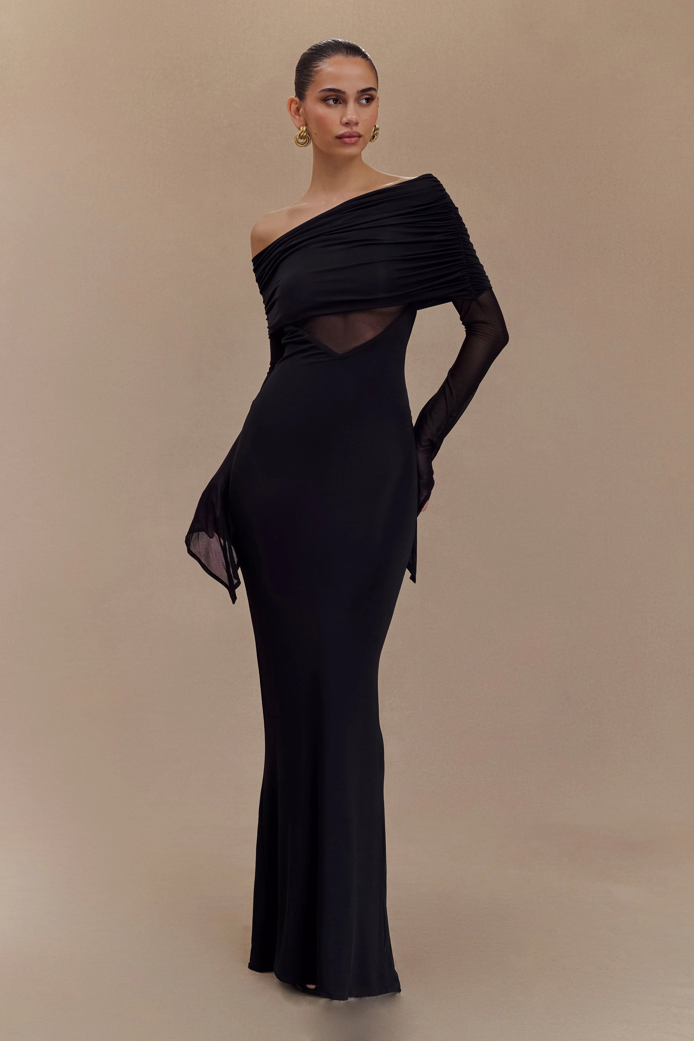 Step out in the KAITLIN One Shoulder Slinky and Mesh Maxi Dress, a perfect blend of sophistication and allure. The asymmetrical neckline elegantly highlights your silhouette, while the jersey ruched overlay and lower skirt create a flattering flow. Mesh sleeves and bodice add a touch of intrigue, balancing coverage with allure. With V front and back waist shaping, this dress enhances your figure, and the back ruching detail adds a refined finish. At a stunning maxi length, this dress is ideal for any special occasion, ensuring you make a captivating entrance every time.