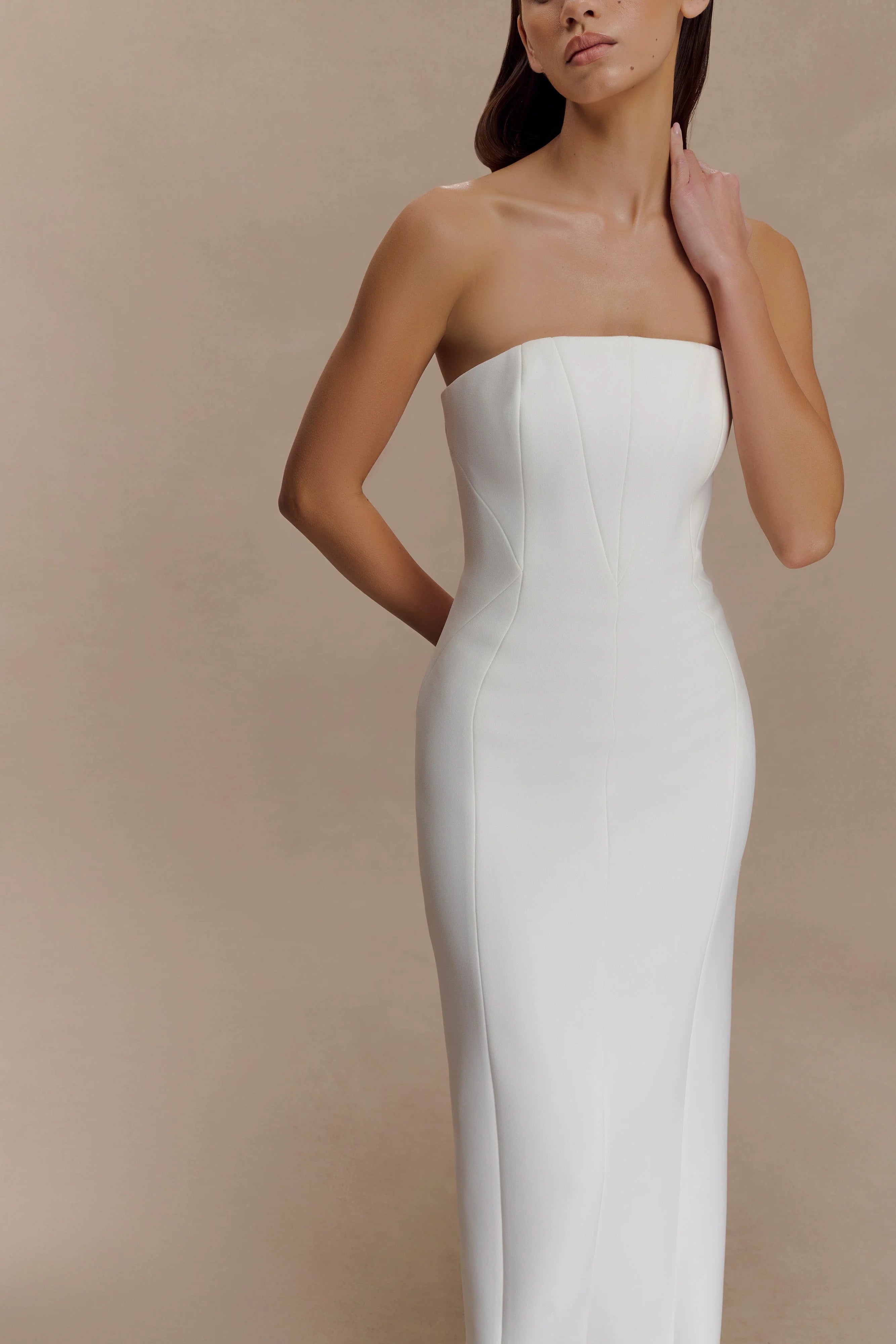 The KALILA Strapless Crepe Maxi Dress is a masterclass in minimalist elegance. Featuring a clean strapless neckline and a sculpted bodycon silhouette, it’s designed with an internal waist stay for secure, confident wear. A back leg vent allows for ease of movement, while the invisible zip ensures a sleek finish. Fully lined for comfort, this dress is the perfect choice for moments that call for understated glamour with a flawless fit.